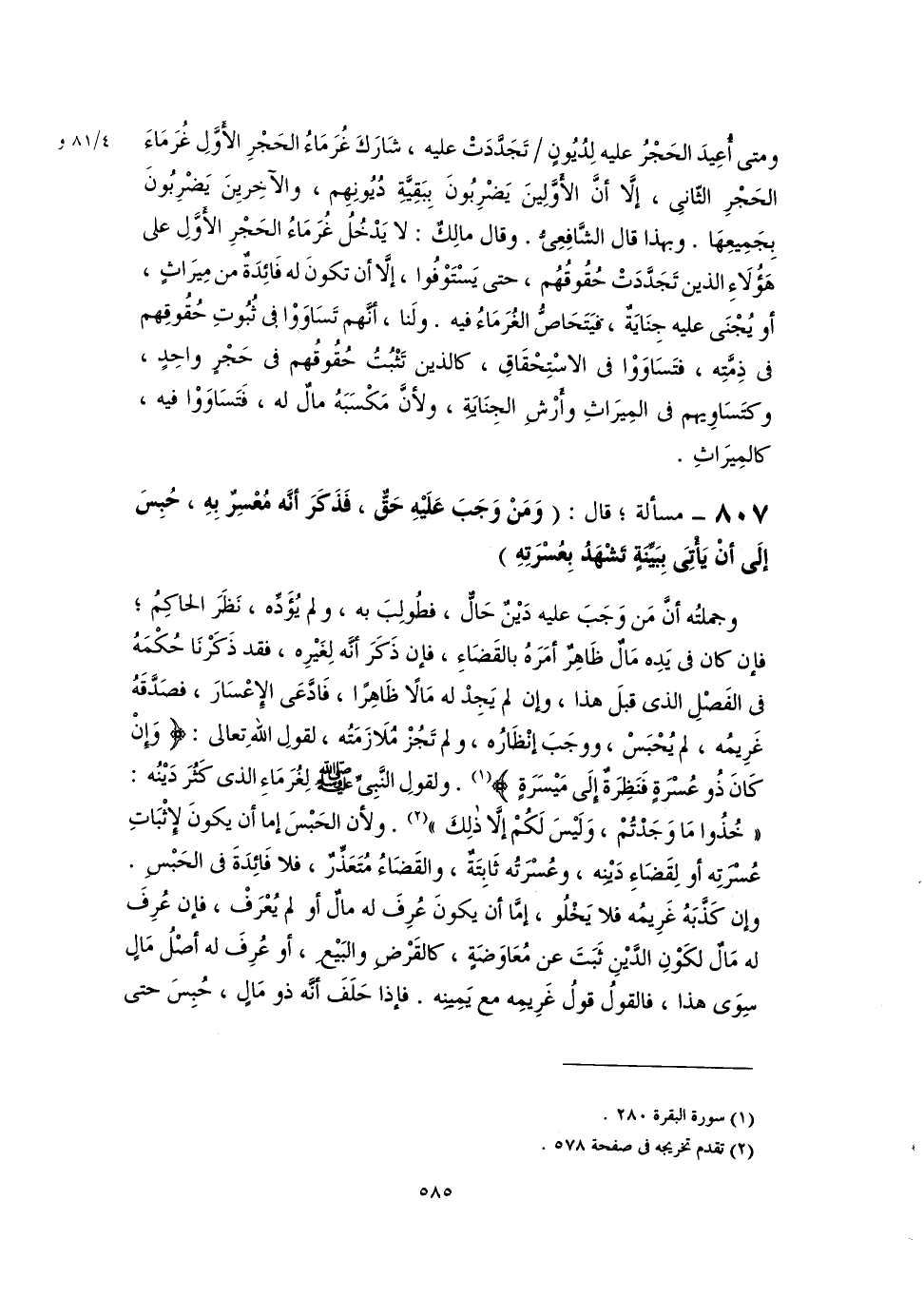 ومتى أُعِيدَ الحَجْرُ عليه لِدُيُونٍ تَجَدَّدَتْ عليه، شَارَكَ غُرَمَاءُ الحَجْرِ الأوَّلِ غُرَمَاءَ الحَجْرِ الثَّاني، إلَّا أنَّ الأوَّلِينَ يَضْرِبُونَ بِبَقِيَّةِ دُيُونِهِم، والآخِريِنَ يَضْرِبُونَ بِجَمِيعِهَا. وبهذا قال الشَّافِعِيُّ. وقال مالِكٌ: لا يَدْخُلُ غُرَمَاءُ الحَجْرِ الأوَّلِ على هَؤُلَاءِ الذين تَجَدَّدَتْ حُقُوقُهُم، حتى يَسْتَوْفُوا، إلَّا أن تكونَ له فَائِدَةٌ من مِيرَاثٍ، أو يُجْنَى عليه جِنَايَةٌ، فيَتَحَاصُّ الغُرَمَاءُ فيه. ولَنا، أنَّهم تَسَاوَوْا في ثُبُوتِ حُقُوقِهم في ذِمَّتِه، فتَسَاوَوْا في الاسْتِحْقَاقِ، كالذين تَثْبُتُ حُقُوقُهم في حَجْرٍ واحِدٍ، وكتَسَاوِيهم في المِيرَاثِ وأرْشِ الجِنَايَةِ، ولأنَّ مَكْسَبَهُ مالٌ له، فَتَسَاوَوْا فيه، كالمِيرَاثِ.