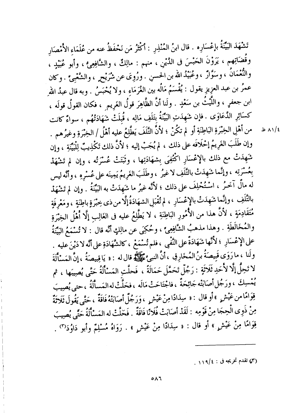 تَشْهَدَ البَيِّنَةُ بإعْسَارِه. قال ابنُ المُنْذِرِ: أكْثَرُ مَن نَحْفَظُ عنه من عُلَمَاءِ الأمْصَارِ وقُضَاتِهم، يَرَوْنَ الحَبْسَ فى الدَّيْنِ، منهم: مالِكٌ، والشَّافِعِىُّ، وأبو عُبَيْدٍ، والنُّعْمَانُ، وسَوَّارٌ، وعُبَيْدُ اللَّه بن الحسنِ. ورُوِىَ عن شُرَيْحٍ، والشَّعْبِىِّ. وكان عمرُ بن عبد العزِيزِ يقول: يُقْسَمُ مَالُه بين الغُرَمَاءِ، ولا يُحْبَسُ. وبه قال عبدُ اللهِ ابن جعفرٍ، واللَّيْثُ بن سَعْدٍ. ولَنا أنَّ الظَّاهِرَ قَولُ الغَرِيمِ، فكان القولُ قولَه، كسَائِرِ الدَّعَاوَى. فإن شَهِدَتِ البَيِّنَةُ بتَلَفِ مَالِه، قُبِلَتْ شَهَادَتُهُم، سواءٌ كانت من أهْلِ الخِبْرَةِ البَاطِنَةِ أو لم تكُنْ؛ لأنَّ التَّلَفَ يَطَّلِعُ عليه أهْلُ الخِبْرَةِ وغيرُهم. وإن طَلَبَ الغَرِيمُ إحْلَافَه على ذلك، لم يُجَبْ إليه؛ لأنَّ ذلك تَكْذِيبٌ لِلْبَيِّنَةِ، وإن شَهِدَتْ مع ذلك بالإِعْسَارِ اكْتُفِىَ بِشهَادَتِها، وثَبَتَتْ عُسْرَتُه، وإن لم تَشْهَدْ بِعُسْرَتِه، وإنَّما شَهِدَتْ بالتَّلَفِ لا غيرُ، وطَلَبَ الغَرِيمُ يَمِينَه على عُسْرِهِ، وأنَّه ليس له مالٌ آخَرُ، اسْتُحْلِفَ على ذلك؛ لأنَّه غيرُ ما شَهِدَتْ به البَيِّنَةُ. وإن لم تَشْهَدْ بالتَّلَفِ، وإنَّما شَهِدَتْ بالإعْسَارِ، لم تُقْبَلِ الشهَادَةُ إلَّا من ذى خِبْرَةٍ باطِنَةٍ، ومَعْرِفَةٍ مُتَقَادِمَةٍ، لأنَّ هذا من الأُمُورِ البَاطِنَةِ، لا يَطَّلِعُ عليه فى الغَالِبِ إلَّا أَهْلُ الخِبْرَةِ والمُخَالَطَةِ. وهذا مذهبُ الشَّافِعِىِّ، وحُكِىَ عن مالِكٍ أنَّه قال: لا تُسْمَعُ البَيِّنَةُ على الإِعْسَارِ؛ لأنَّها شَهَادَةٌ على النَّفْىِ، فلم تُسْمَعْ، كالشَّهَادَةِ على أنَّه لا دَيْنَ عليه. ولَنا، ما رَوَى قَبيصَةُ بنُ المُخَارِقِ، أنَّ النبىَّ -صَلَّى اللهُ عَلَيْهِ وَسَلَّمَ- قال له: "يَا قِبيصَةُ، إنَّ المَسْأَلَةَ لا تَحِلُّ إلَّا لأَحَدِ ثَلَاثَةٍ: رَجُلٌ تَحَمَّلَ حَمَالَةً، فَحلَّتِ المَسْأَلَةُ حَتَّى يُصِيبَها، ثم يُمْسِكَ، ورَجُل أصَابَتْه جَائِحَةٌ، فاجْتَاحَتْ مَالَه، فحَلَّتْ له المَسأَلَةُ، حتى يُصِيبَ قِوَامًا من عَيْشٍ" أو قال: "سِدَادًا مِنْ عَيْشٍ، وَرَجُلٌ أصَابَتْهُ فَاقَةٌ، حَتَّى يَقُولَ ثَلَاثَةٌ مِنْ ذَوِى الْحِجَا مِنْ قَوْمِه: لَقَدْ أصَابَتْ فُلَانًا فَاقَةٌ. فَحَلَّتْ له المَسْأَلَةُ حَتَّى يُصِيبَ قِوَامًا مِنْ عَيْشٍ" أو قال: "سِدَادًا مِنْ عَيْشٍ". رَوَاهُ مُسْلِمٌ وأبو دَاوُدَ (٣).