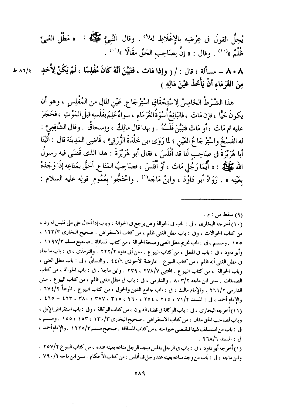 (١) أخرجه أبو داود، فى: باب فى الرجل يفلس فيجد الرجل متاعه بعينه عنده، من كتاب البيوع ٢/ ٢٥٧. وابن ماجه، فى: باب من وجد متاعه بعينه عند رجل قد أفلس، من كتاب الأحكام. سنن ابن ماجه ٢/ ٧٩٠.