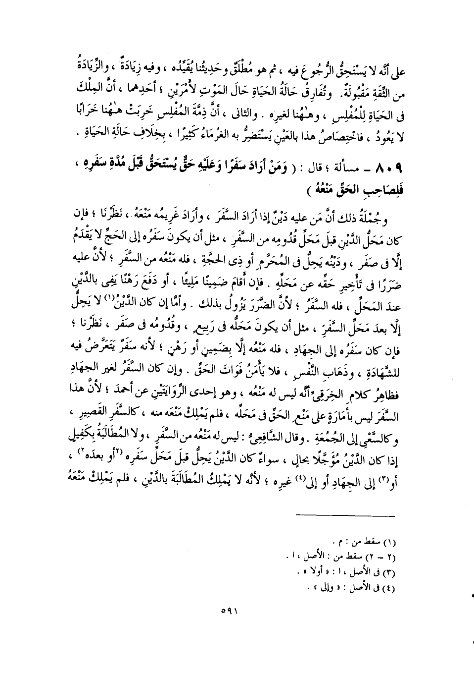 ٨٠٩ - مسألة؛ قال: (وَمَنْ أرَادَ سَفَرًا وَعَلَيْهِ حَقٌّ يُسْتَحَقُّ قَبْلَ مُدَّةِ سَفَرِهِ، فَلِصَاحِبِ الحَقِّ مَنْعُهُ)