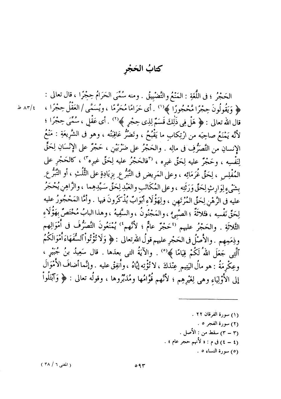 الحَجْرُ؛ فى اللُّغَةِ: المَنْعُ والتَّضْيِيقُ. ومنه سُمِّىَ الحَرَامُ حِجْرًا، قال تعالى: {وَيَقُولُونَ حِجْرًا مَحْجُورًا} (١). أى حَرَامًا مُحَرَّمًا، ويُسَمَّى العَقْلُ حِجْرًا، قال اللَّه تعالى: {هَلْ فِي ذَلِكَ قَسَمٌ لِذِي حِجْرٍ} (٢). أى عَقْلٍ، سُمِّىَ حِجْرًا؛ لأنَّه يَمْنَعُ صاحِبَه من ارْتِكابِ ما يَقْبُحُ، وتَضُرُّ عَاقِبَتُه، وهو فى الشَّرِيعَةِ: مَنْعُ الإِنسانِ من التَّصَرُّفِ فى مالِه. والحَجْرُ على ضَرْبَيْنِ، حَجْرٌ على الإِنسَانِ لِحَقٍّ لِنَفْسِه، وحَجْرٌ عليه لِحَقِّ غيرِه، [فالحَجْرُ عليه لِحَقِّ غيرِه] (٣)، كالحَجْرِ على المُفْلِسِ، لِحَقِّ غُرَمَائِه، وعلى المَرِيضِ فى التَّبَرُّعِ بِزِيَادِةٍ على الثُّلُثِ، أو التَّبرُّعِ بِشَىْءٍ لِوَارِثٍ لِحَقِّ وَرَثَتِه، وعلى المُكَاتَبِ والعَبْدِ لِحَقِّ سَيِّدِهِما، والرَّاهِنِ يُحْجَرُ عليه فى الرَّهْنِ لِحَقِّ المُرْتَهِنِ، ولِهَؤُلَاءِ أبْوَابٌ يُذْكَرُونَ فيها. وأمَّا المَحْجُورُ عليه لِحَقِّ نَفْسِه، فثَلاثَةٌ؛ الصَّبِىُّ، والمَجْنُونُ، والسَّفِيهُ، وهذا البابُ مُخْتَصٌّ بِهَؤُلَاءِ الثَّلَاثَةِ. والحَجْرُ عليهم [حَجْرٌ عامٌّ؛ لأنَّهم] (٤) يُمْنَعُونَ التَّصَرُّفَ فى أمْوَالِهم وذِمَمِهِم. والأَصْلُ فى الحَجْرِ عليهم قولُ اللهِ تعالى: {وَلَا تُؤْتُوا السُّفَهَاءَ أَمْوَالَكُمُ الَّتِي جَعَلَ اللَّهُ لَكُمْ قِيَامًا} (٥). والآيَةُ التى بعدَها. قال سَعِيدُ بنُ جُبَيْرٍ، وعِكْرِمَةُ: هو مالُ اليَتِيمِ عِنْدَكَ، لا تُؤْتِه إيَّاهُ، وأنفِقْ عليه. وإنَّما أضافَ الأمْوَالَ إلى الأَوْلِيَاءِ وهى لِغَيْرِهِم؛ لأنَّهم قُوَّامُها ومُدَبِّرُوها، وقولُه تعالى: {وَابْتَلُوا