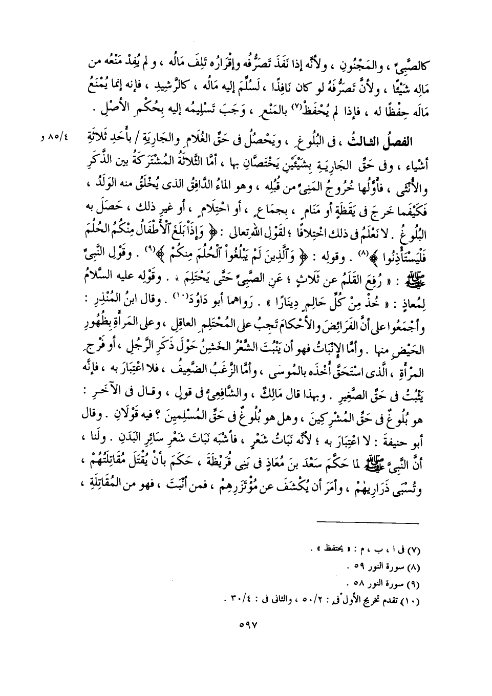 الفصلُ الثالثُ، فى البُلُوغِ، ويَحْصُلُ فى حَقِّ الغُلَامِ والجَارِيَةِ بأحَدِ ثَلاثَةِ أشْياء، وفى حَقِّ الجَارِيَةِ بِشَيْئَيْنِ يَخْتَصَّانِ بها، أمَّا الثَّلَاثَةُ المُشْتَرَكَةُ بين الذَّكَرِ والأُنْثَى، فأَوَّلُها خُرُوجُ المَنِىِّ من قُبُلِه، وهو الماءُ الدَّافِقُ الذى يُخْلَقُ منه الوَلَدُ، فَكَيْفَما خَرجَ فى يَقَظَةٍ أو مَنَامٍ، بِجمَاعٍ، أو احْتِلَامٍ، أو غيرِ ذلك، حَصَلَ به البُلُوغُ. لا نَعْلَمُ فى ذلك اخْتِلافًا؛ لقَوْلِ اللهِ تعالى: {وَإِذَا بَلَغَ الْأَطْفَالُ مِنْكُمُ الْحُلُمَ فَلْيَسْتَأْذِنُوا} (٨). وقولِه: {وَالَّذِينَ لَمْ يَبْلُغُوا الْحُلُمَ مِنْكُمْ} (٩). وقَوْلِ النَّبِىِّ -صَلَّى اللهُ عَلَيْهِ وَسَلَّمَ-: "رُفِعَ القَلَمُ عن ثَلَاثٍ؛ عَنِ الصَّبِىِّ حَتَّى يَحْتَلِمَ". وقَوْلِه عليه السَّلامُ لِمُعاذٍ: "خُذْ مِنْ كُلِّ حَالِمٍ دِينَارًا". رَواهما أبو دَاوُدَ (١٠). وقال ابنُ المُنْذِرِ: وأجْمَعُوا على أنَّ الفَرَائِضَ والأحْكامَ تَجِبُ على المُحْتَلِمِ العاقِلِ، وعلى المَرأَةِ بِظُهُورِ الحَيْضِ منها. وأمَّا الإنْبَاتُ فهو أن يَنْبُتَ الشَّعْرُ الخَشِنُ حَوْلَ ذَكَرِ الرَّجُلِ، أو فَرْجِ المرْأَةِ، الَّذى اسْتَحَقَّ أخْذَه بالمُوسى، وأمَّا الزَّغَبُ الضَّعِيفُ، فلا اعْتِبَارَ به، فإنَّه يَثْبُتُ فى حَقِّ الصَّغِيرِ. وبهذا قال مَالِكٌ، والشَّافِعِىُّ فى قولٍ، وقال فى الآخَرِ: هو بُلُوغٌ فى حَقِّ المُشْرِكِينَ، وهل هو بُلُوغٌ فى حَقِّ المُسْلِمِينَ؟ فيه قَوْلَانِ. وقال أبو حنيفةَ: لا اعْتِبَارَ به؛ لأنَّه نَبَاتُ شَعْرٍ، فأشْبَه نَبَاتَ شَعْرِ سَائِرِ البَدَنِ. ولَنا، أنَّ النَّبِىَّ -صَلَّى اللهُ عَلَيْهِ وَسَلَّمَ- لما حَكَّمَ سَعْدَ بنَ مُعَاذٍ فى بَنِى قُرَيْظَةَ، حَكَمَ بأنْ يُقْتَلَ مُقَاتِلَتُهُمْ، وتُسْبَى ذَرَارِيهمْ، وأمَرَ أن يُكْشَفَ عن مُؤْتَزَرِهِمْ، فمن أنْبَتَ، فهو من المُقَاتِلَةِ،