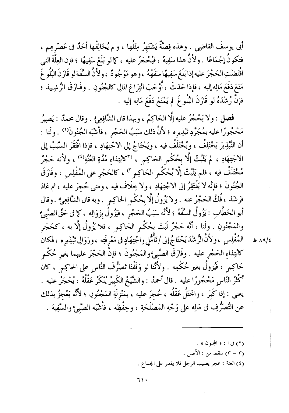 فصل: ولا يَحْجُرُ عليه إلَّا الحَاكِمُ، وبهذا قال الشَّافِعيُّ. وقال محمدٌ: يَصِيرُ مَحْجُورًا عليه بمُجَرَّدِ تَبْذِيرِه؛ لأنَّ ذلك سَبَبُ الحَجْرِ، فأشْبَه الجُنُونَ (٢). ولَنا: أن التَّبْذِيرَ يَخْتَلِفُ، ويُخْتَلَفُ فيه، ويَحْتَاجُ إلى الاجْتِهَادِ، فإذا افْتَقَرَ السَّبَبُ إلى الاجْتِهَادِ، لم يَثْبُتْ إلَّا بِحُكْمِ الحَاكِمِ، [كابْتِدَاءِ مُدَّةِ العُنَّةِ (٣)، ولأنه حَجْرٌ مُخْتَلَفٌ فيه، فلم يَثْبُتْ إلَّا بُحْكْمِ الحَاكِمِ] (٤)، كالحَجْرِ على المُفْلِسِ، وفَارَقَ الجُنُونَ؛ فإنَّه لا يَفْتَقِرُ إلى الاجْتِهَادِ، ولا خِلَافَ فيه، ومتى حُجِرَ عليه، ثمَّ عَادَ فرَشَدَ، فُكَّ الحَجْرُ عنه. ولا يَزُولُ إلَّا بِحُكْمِ الحاكِمِ. وبه قال الشَّافِعيُّ. وقال أبو الخَطَّابِ: يَزُولُ السَّفَهُ؛ لأنَّه سَبَبُ الحَجْرِ، فيَزُولُ بِزَوَالِه، كما فى حَقِّ الصَّبِىِّ والمَجْنُونِ. ولَنا، أنَّه حَجْرٌ ثَبَتَ بحُكْمِ الحَاكِمِ، فلا يَزُولُ إلَّا به، كحَجْرِ المُفْلِسِ، ولأنَّ الرُّشْدَ يَحْتَاجُ إلى تَأَمُّلٍ واجْتِهَادٍ فى مَعْرِفَتِه، وزَوَالِ تَبْذِيرِه، فكان كابْتِدَاءِ الحَجْرِ عليه. وفَارَقَ الصَّبِيَّ والمَجْنُونَ؛ فإنَّ الحَجْرَ عليهما بغيرِ حُكْمِ حَاكِمٍ، فَيزُولُ بغير حُكْمِه. ولأنَّنا لو وَقَفْنَا تَصَرُّفَ النَّاسِ على الحاكِمِ، كان أكْثَرُ النَّاسِ مَحْجُورًا عليه. قال أحمدُ: والشَّيْخُ الكَبِيرُ يُنْكَرُ عَقْلُهُ، يُحْجَرُ عليه. يعنى: إذا كَبِرَ، واخْتَلَّ عَقْلُه، حُجِرَ عليه، بمَنْزِلَةِ المَجْنُونِ؛ لأنَّه يَعْجِزُ بذلك عن التَّصَرُّفِ فى مَالِه على وَجْهِ المَصْلَحَةِ، وحِفْظِه، فأشْبَه الصَّبِيَّ والسَّفِيهَ.
