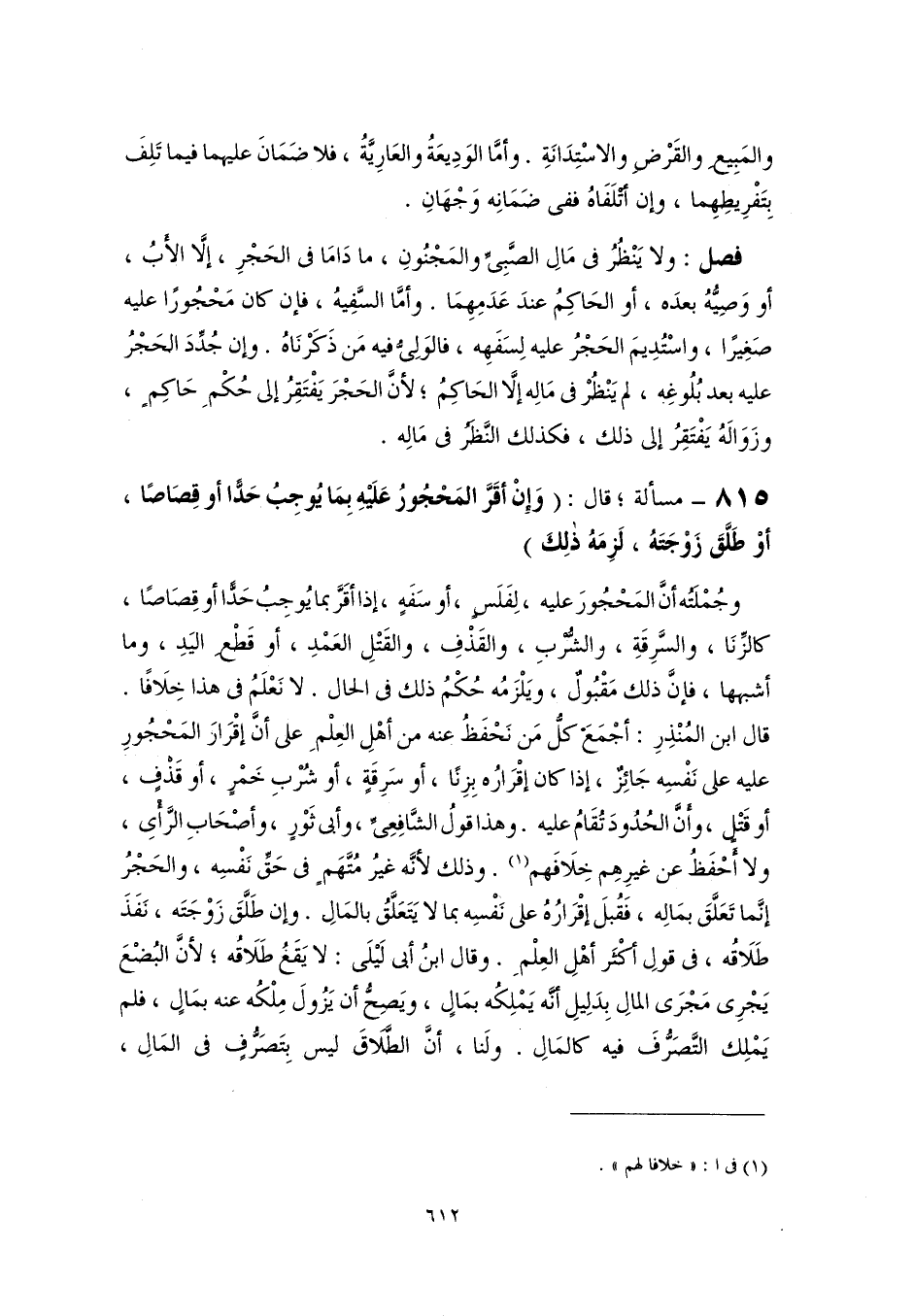 وجُمْلَتُه أنَّ المَحْجُورَ عليه، لِفَلَسٍ، أو سَفَهٍ، إذا أقَرَّ بما يُوجِبُ حَدًّا أو قِصَاصًا، كالزِّنَا، والسَّرِقَةِ، والشُّرْبِ، والقَذْفِ، والقَتْلِ العَمْدِ، أو قَطْعِ اليَدِ، وما أشبهها، فإنَّ ذلك مَقْبُولٌ، ويَلْزَمُه حُكْمُ ذلك فى الحال. لا نَعْلَمُ فى هذا خِلَافًا. قال ابن المُنْذِرِ: أجْمَعَ كلُّ مَن نَحْفَظُ عنه من أهْلِ العِلْمِ على أنَّ إقْرَارَ المَحْجُورِ عليه على نَفْسِه جَائِزٌ، إذا كان إقْرَارُه بِزِنًا، أو سَرِقَةٍ، أو شُرْبِ خَمْرٍ، أو قَذْفٍ، أو قَتْلٍ، وأنَّ الحُدُودَ تُقَامُ عليه. وهذا قولُ الشَّافِعيِّ، وأبى ثَوْرٍ، وأصْحَابِ الرَّأْىِ، ولا أحْفَظُ عن غيرِهِم خِلَافَهم (١). وذلك لأنَّه غيرُ مُتَّهَمٍ فى حَقِّ نَفْسِه، والحَجْرُ إنَّما تَعَلَّقَ بمَالِه، فَقُبلَ إقْرَارُهُ على نَفْسِه بما لا يَتَعَلَّقُ بالمَالِ. وإن طَلَّقَ زَوْجَتَه، نَفَذَ طَلَاقُه، فى قولِ أكْثَر أهْلِ العِلْمِ. وقال ابنُ أبي لَيْلَى: لا يَقَعُ طَلَاقُه؛ لأنَّ البُضْعَ يَجْرِى مَجْرَى المالِ بِدَلِيلِ أنَّه يَمْلِكُه بمَالٍ، ويَصِحُّ أن يَزُولَ مِلْكُه عنه بمَالٍ، فلم يَمْلِك التَّصَرُّفَ فيه كالمَالِ. ولَنا، أنَّ الطَّلَاقَ ليس بِتَصَرُّفٍ فى المَالِ،