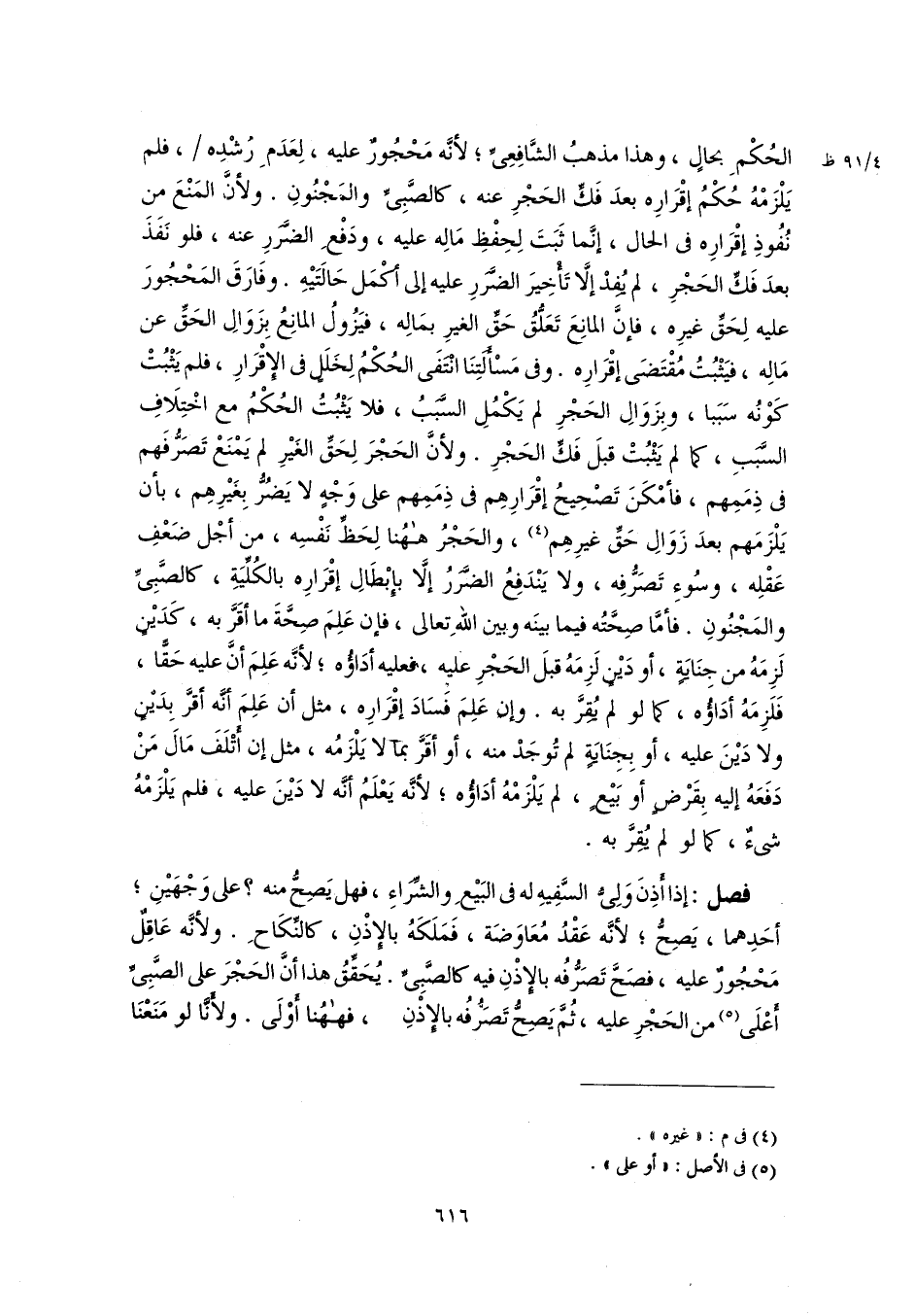 الحُكْمِ بحالٍ، وهذا مذهبُ الشَّافِعِىِّ؛ لأنَّه مَحْجُورٌ عليه، لِعَدَمِ رُشْدِه، فلم يَلْزَمْهُ حُكْمُ إقْرَارِه بعدَ فَكِّ الحَجْرِ عنه، كالصَّبِىِّ والمَجْنُونِ. ولأنَّ المَنْعَ من نُفُوذِ إقْرَارِه فى الحال، إنَّما ثَبَتَ لِحِفْظِ مَالِه عليه، ودَفْعِ الضَّرَرِ عنه، فلو نَفَذَ بعدَ فَكِّ الحَجْرِ، لم يُفِدْ إلَّا تَأْخِيرَ الضَّرَرِ عليه إلى أكْمَل حَالَتَيْهِ. وفَارَقَ المَحْجُورَ عليه لِحَقِّ غيرِه، فإنَّ المانِعَ تَعَلُّقُ حَقِّ الغيرِ بمَالِه، فيَزُولُ المانِعُ بِزَوَالِ الحَقِّ عن مَالِه، فيَثْبُتُ مُقْتَضَى إقْرَارِه. وفى مَسْأَلَتِنَا انْتَفَى الحُكْمُ لِخَلَلٍ فى الإِقْرَارِ، فلم يَثْبُتْ كَوْنُه سَبَبا، وبِزَوَالِ الحَجْرِ لم يَكْمُلِ السَّبَبُ، فلا يَثْبُتُ الحُكْمُ مع اخْتِلَافِ السَّبَبِ، كما لم يَثْبُتْ قبلَ فَكِّ الحَجْرِ. ولأنَّ الحَجْرَ لِحَقِّ الغَيْرِ لم يَمْنَعْ تَصَرُّفَهم فى ذِمَمِهم، فأمْكَنَ تَصْحِيحُ إقْرَارِهِم فى ذِمَمِهم على وَجْهٍ لا يَضُرُّ بِغَيْرِهِم، بأن يَلْزَمَهم بعدَ زَوَالِ حَقِّ غيرِهِم (٤)، والحَجْرُ هاهُنا لِحَظِّ نَفْسِه، من أجْل ضَعْفِ عَقْلِه، وسُوءِ تَصَرُّفِه، ولا يَنْدَفِعُ الضَّرَرُ إلَّا بإِبْطَالِ إقْرَارِه بالكُلِّيَّةِ، كالصَّبِىِّ والمَجْنُونِ. فأمَّا صِحَّتُه فيما بينَه وبين اللهِ تعالى، فإن عَلِمَ صِحَّةَ ما أقَرَّ به، كَدَيْنٍ لَزِمَهُ من جِنَايَةٍ، أو دَيْنٍ لَزِمَهُ قبلَ الحَجْرِ عليه، فعليه أدَاؤُه؛ لأنَّه عَلِمَ أنَّ عليه حَقًّا، فَلَزِمَهُ أدَاؤُه، كما لو لم يُقِرَّ به. وإن عَلِمَ فَسَادَ إقْرَارِه، مثل أن عَلِمَ أنَّه أقرَّ بِدَيْنٍ ولا دَيْنَ عليه، أو بِجِنَايَةٍ لم تُوجَدْ منه، أو أقَرَّ بما لا يَلْزَمُه، مثل إن أَتْلَفَ مَالَ مَنْ دَفَعَهُ إليه بِقَرْضٍ أو بَيْعٍ، لم يَلْزَمْهُ أدَاؤُه؛ لأنَّه يَعْلَمُ أنَّه لا دَيْنَ عليه، فلم يَلْزَمْهُ شىءٌ، كما لو لم يُقِرَّ به.