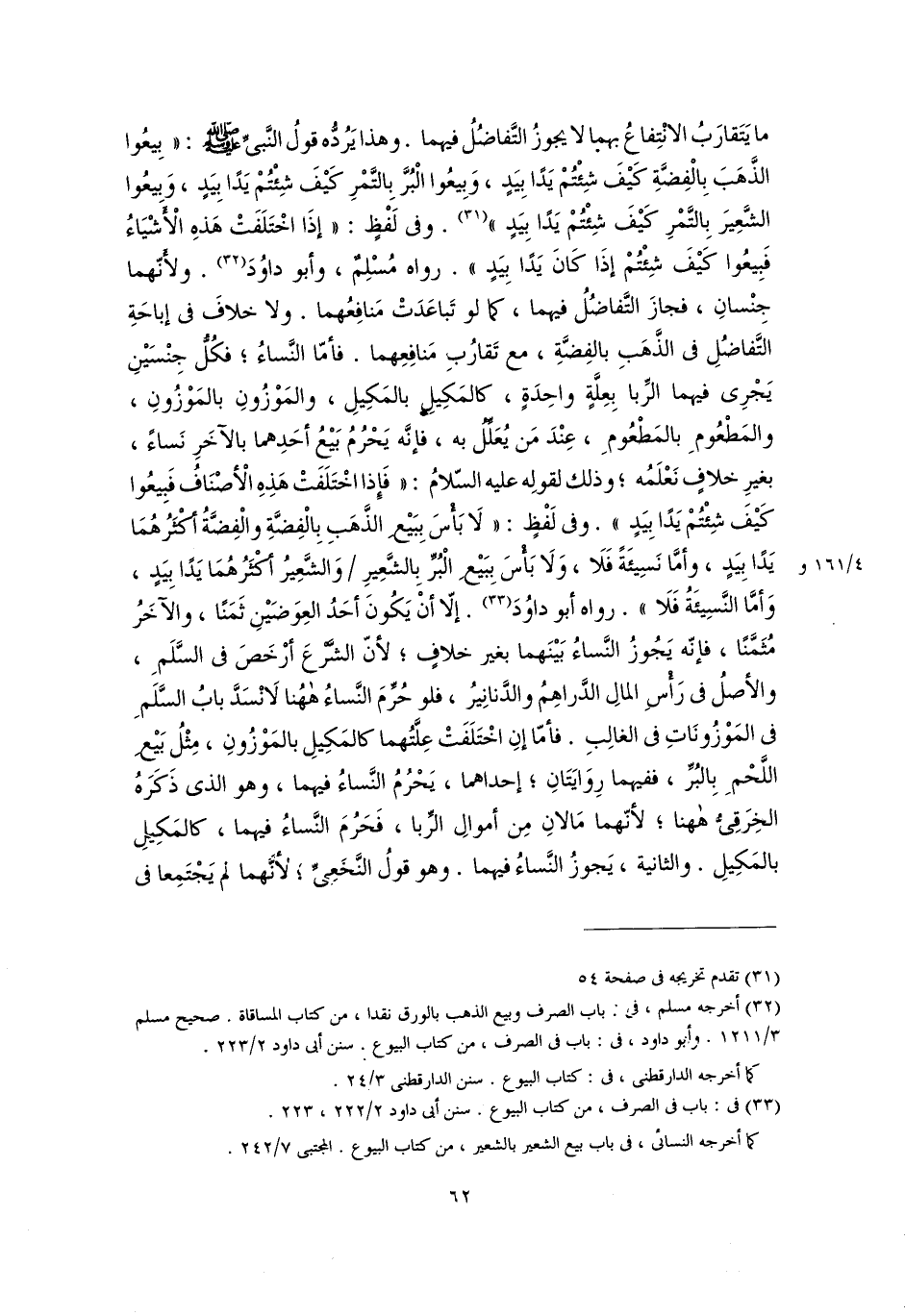 (٣٢) أخرجه مسلم، فى: باب الصرف وبيع الذهب بالورق نقدا، من كتاب المساقاة. صحيح مسلم ٣/ ١٢١١. وأبو داود، فى: باب فى الصرف، من كتاب البيوع. سنن أبى داود ٢/ ٢٢٣.