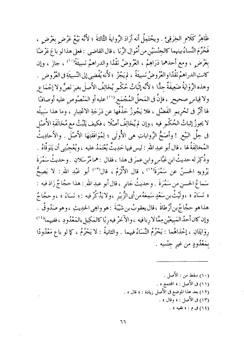 ظَاهِرُ كَلَامِ الخِرَقِىِّ. ويحْتَمِلُ أنه أرَادَ الرِّوايةَ الثَّالثةَ؛ لأنَّه بَيْعُ عَرْضٍ بِعَرْضٍ، فَحُرِّمَ النَّساءُ بينهما كالجِنْسَيْنِ من أَموالِ الرِّبَا، قال القاضى: فعلى هذا لو باعَ عَرْضًا بِعَرْضٍ، ومع أحدهما دَرَاهِمُ، العُرُوضُ نَقْدًا والدراهمُ نَسِيئَةً (١٠)، جازَ، وإن كانتِ الدراهمُ نَقْدًا والعُرُوضُ نَسِيئَةً، لم يَجُزْ؛ لأنه يُفْضِى إلى النَّسِيئَةِ فى العُرُوضِ. وهذه الرِّوَايَةُ ضَعِيفَةٌ جِدًّا؛ لأنَّه إثْبَاتُ حُكْمٍ يُخَالِفُ الأصلَ بغير نَصٍّ ولا إجْمَاعٍ ولا قِياسٍ صحيحٍ، فإنَّ فى المَحلِّ المُجْمَعِ (١١) عليه أو المَنْصُوصِ عليه أوصافًا لها أثَرٌ فى تَحْرِيمِ الفَضْلِ، فلا يَجُوزُ حَذْفُها عن دَرَجَةِ الاعْتِبارِ، وما هذا سَبِيلُه لا يجوزُ إثباتُ الحُكْمِ فيه، وإن لم يُخَالِفْ أصْلًا، فكيف يَثْبُتُ مع مُخَالَفَةِ الأَصْلِ فى حِلِّ البَيْعِ! وأصَحُّ الرِّواياتِ هى الأُولَى؛ لِمُوَافَقَتِهَا الأصْلَ. والأحادِيثُ المُخالِفَةُ لها، قال أبو عبدِ اللهِ: ليس فيها حَدِيثٌ يُعْتَمَدُ عليه، ويُعْجِبُنِى أن يَتَوَقَّاهُ. وذُكِرَ له حديثُ ابنِ عَبَّاسٍ وابنِ عمرَ فى هذا، فقال: هما مُرْسَلانِ. وحديثُ سَمُرَةَ يَرْويهِ الحسنُ عن سَمُرَةَ (١٢)، قال الأَثْرَمُ، قال (١٣) أبو عَبْدِ اللهِ: لا يَصِحُّ سَماعُ الحسنِ من سَمُرَةَ. وحديثُ جَابرٍ، قال أبو عبدِ اللهِ: هذا حجَّاجٌ زَادَ فيه: "نَسَاءً"، ولَيْثُ بن سَعْدٍ سَمِعَهُ من أبى الزُّبِيْرِ، ولا يَذْكُرُ فيه: "نَسَاءً"، وحجَّاجٌ هذا هو حجَّاجُ بن أرْطاةَ، قال يعقوبُ بن شَيْبَةَ: هو واهِى الحدِيثِ، وهو صَدُوقٌ. وإن كان أحدُ المَبِيعَيْنِ مِمَّا لا رِبا فيه، والآخَرُ فيه رِبًا كالمَكِيلِ بالمَعْدُودِ، ففيهما (١٤) رِوَايَتَانِ، إحْدَاهُما: يَحْرُمُ النَّسَاءُ فيهما. والثانيةُ: لا يَحْرُمُ، كما لو باع مَعْدُودًا بِمَعْدُودٍ من غيرِ جِنْسِه.