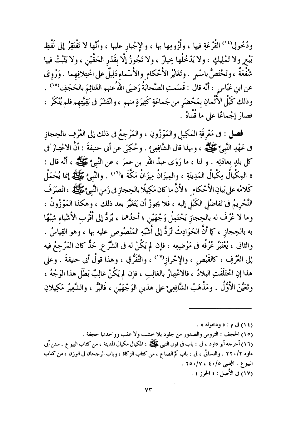 (١٦) أخرجه أبو داود، فى: باب فى قول النبى -صَلَّى اللهُ عَلَيْهِ وَسَلَّمَ-: المكيال مكيال المدينة، من كتاب البيوع. سنن أبى داود ٢/ ٢٢٠. والنسائى، فى: باب كم الصاع، من كتاب الزكاة، وباب الرجحان فى الوزن، من كتاب البيوع. المجتبى ٥/ ٤٠، ٧/ ٢٥٠.