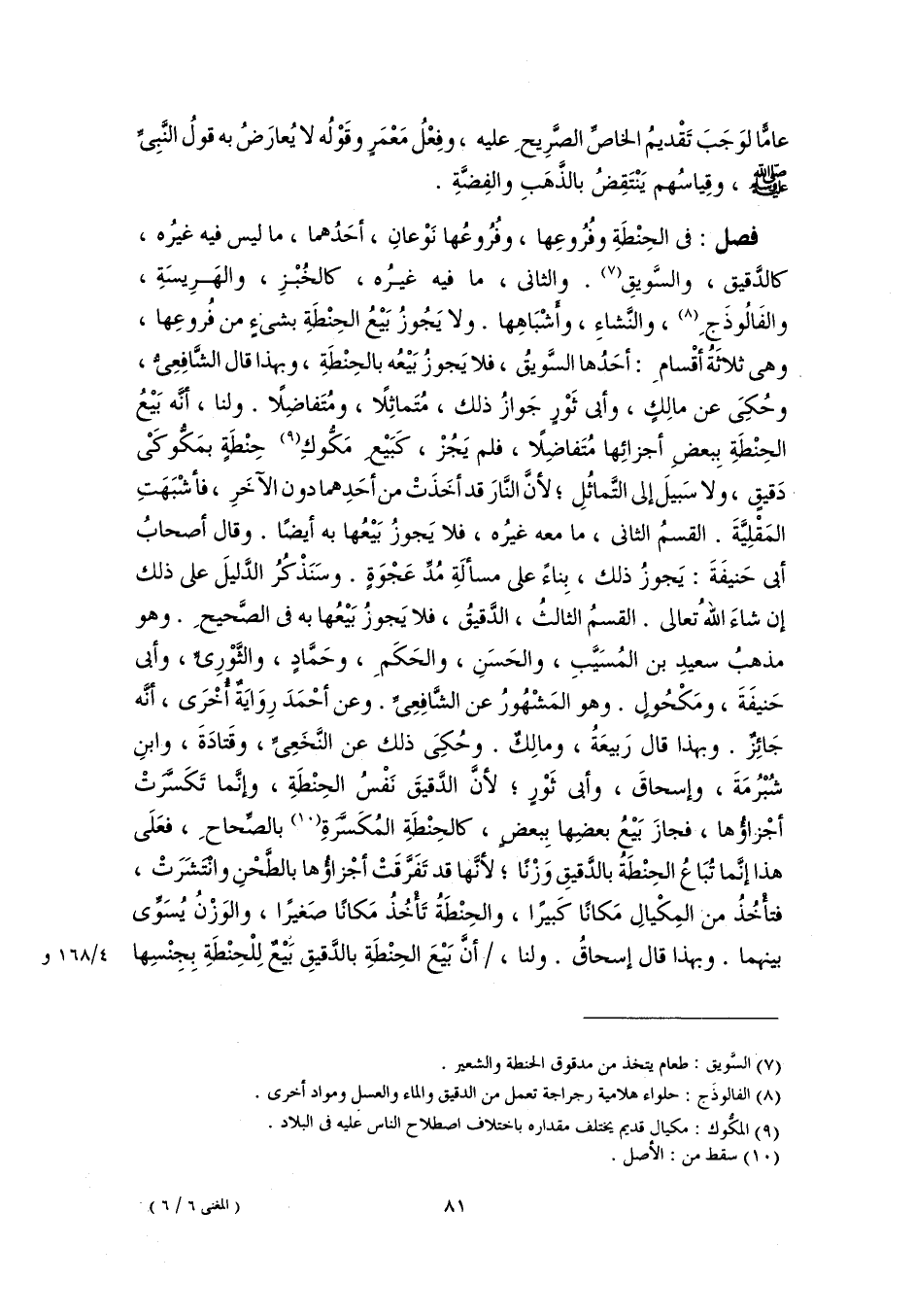 فصل: فى الحِنْطَةِ وفُرُوعِها، وفُرُوعُها نَوْعانِ، أحَدُهما، ما ليس فيه غيرُه، كالدَّقيق، والسَّويقِ (٧). والثانى، ما فيه غيرُه، كالخُبْزِ، والهَرِيسَةِ، والفَالُوذَجِ (٨)، والنَّشاءِ، وأَشْبَاهِها. ولا يَجُوزُ بَيْعُ الحِنْطَةِ بشىءٍ من فُروعِها، وهى ثلاثَةُ أقْسامِ: أحَدُها السَّويقُ، فلا يَجوزُ بَيْعُه بالحِنْطَةِ، وبهذا قال الشَّافِعِىُّ، وحُكِىَ عن مالِكٍ، وأبى ثَوْرٍ جَوازُ ذلك، مُتَماثِلًا، ومُتَفاضِلًا. ولنا، أنَّه بَيْعُ الحِنْطَةِ بِبعضِ أجزائِها مُتَفاضِلًا، فلم يَجُزْ، كَبَيْعِ مَكُّوكِ (٩) حِنْطَةٍ بمَكُّوكَىْ دَقيقٍ، ولا سَبيلَ إلى التَّماثُلِ؛ لأنَّ النَّارَ قد أخَذَتْ من أحَدِهما دون الآخَرِ، فأشْبَهَتِ المَقْلِيَّةَ. القسمُ الثانى، ما معه غيرُه، فلا يَجوزُ بَيْعُها به أيضًا. وقال أصحابُ أبى حَنيفَةَ: يَجوزُ ذلك، بِناءً على مسألَةِ مُدِّ عَجْوَةٍ. وسَنَذْكُرُ الدَّليلَ على ذلك إن شاءَ اللهُ تعالى. القسمُ الثالثُ، الدَّقيقُ، فلا يَجوزُ بَيْعُها به فى الصَّحيحِ. وهو مذهبُ سعيدِ بن المُسَيَّبِ، والحَسَنِ، والحَكَمِ، وحَمَّادٍ، والثَّوْرِىِّ، وأبى حَنيفَةَ، ومَكْحُولٍ. وهو المَشْهُورُ عن الشَّافِعِىِّ. وعن أحْمَدَ رِوَايَةٌ أُخْرَى، أنَّه جَائِزٌ. وبهذا قال رَبيعَةُ، ومالِكٌ. وحُكِىَ ذلك عن النَّخَعِىِّ، وقَتادَةَ، وابنِ شُبْرُمَةَ، وإسحاقَ، وأبى ثَوْرٍ؛ لأنَّ الدَّقيقَ نَفْسُ الحِنْطَةِ، وإنَّما تَكَسَّرَتْ أجْزاؤُها، فجازَ بَيْعُ بعضِها بِبعضٍ، كالحِنْطَةِ المُكَسَّرةِ (١٠) بالصِّحاحِ، فعَلَى هذا إنَّما تُبَاعُ الحِنْطَةُ بالدَّقيقِ وَزْنًا؛ لأنَّها قد تَفَرَّقَتْ أجْزاؤُها بالطَّحْنِ وانْتَشَرَتْ، فتأْخُذُ من المِكْيالِ مَكانًا كَبيرًا، والحِنْطَةُ تَأْخُذُ مَكانًا صَغيرًا، والوَزْنُ يُسَوِّى بينهما. وبهذا قال إسحاقُ. ولنا، أنَّ بَيْعَ الحِنْطَةِ بالدَّقيقِ بَيْعٌ لِلْحِنْطَةِ بِجِنْسِها