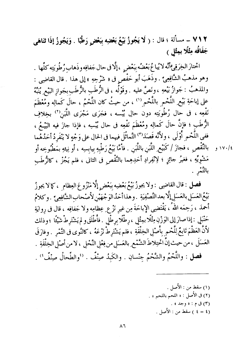 فصل: قال القاضِى: ولا يجوزُ بَيْعُ بَعْضِه بِبَعْضٍ إلَّا مَنْزُوعَ العِظامِ، كما لا يجوزُ بَيْعُ العَسَلِ بالعَسَلِ إلَّا بعد التَّصْفِيَةِ. وهذا أحَدُ الوَجْهَيْنِ لأصْحابِ الشَّافِعِىِّ. وكلامُ أحمدَ، رَحِمَه اللهُ، يَقْتَضِى الإِباحَةَ مِن غيرِ نَزْعِ عِظامِه ولا جَفافِه، قال فى رِوايَةِ حَنْبَلٍ: إذا صارَ إلى الوَزْنِ مِثْلًا بمِثْلٍ، رِطْلًا بِرِطْلٍ. فأَطْلَقَ ولم يَشْتَرِطْ شَيْئًا؛ وذلك لأنَّ العَظْمَ تَابِعٌ لِلَّحْمِ بِأَصْلِ الخِلْقَةِ، فلم يَشْتَرِطْ نَزْعَهُ، كالنَّوى فى التَّمْرِ. وفارَقَ العَسَلَ، من حيث إنَّ اخْتِلاطَ الشَّمْعِ بالعَسَلِ من فِعْلِ النَّحْلِ، لا من أصْلِ الخِلْقَةِ.