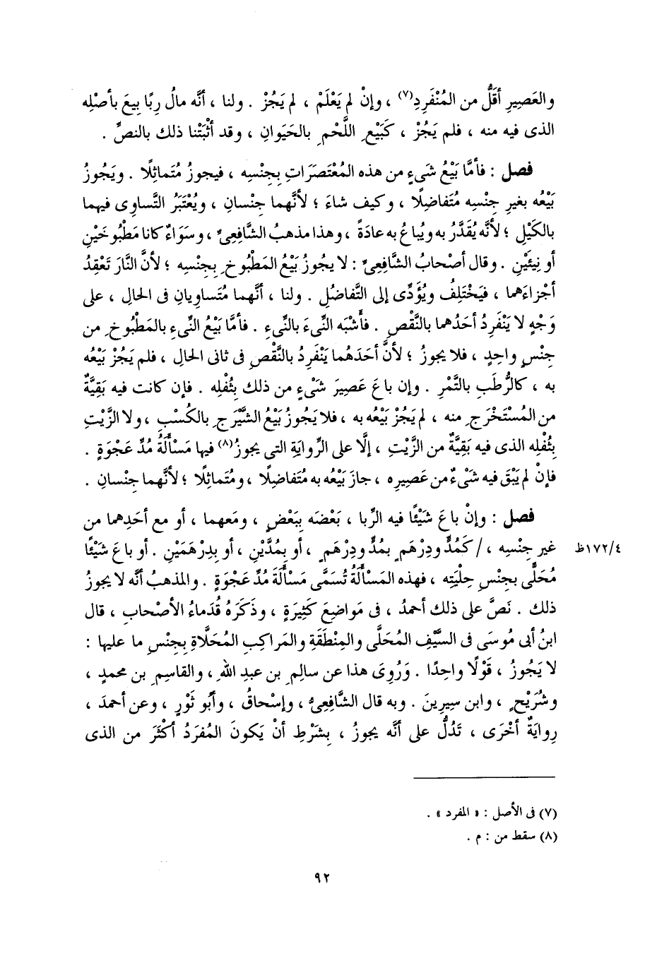 فصل: فأمَّا بَيْعُ شَىءٍ من هذه المُعْتَصَرَاتِ بِجِنْسِه، فيجوزُ مُتَماثِلًا. ويَجُوزُ بَيْعُه بغيرِ جنْسِه مُتَفاضِلًا، وكيف شاءَ؛ لأنَّهما جِنْسانِ، ويُعْتَبَرُ التَّساوِى فيهما بالكَيْلِ؛ لأَنَّه يُقَدَّرُ به ويُباعُ به عادَةً، وهذا مذهبُ الشَّافِعِىِّ، وسَوَاءٌ كانا مَطْبُوخَيْنِ أو نِيئَيْنِ. وقال أصْحابُ الشَّافِعِىِّ: لا يجُوزُ بَيْعُ المَطْبُوخِ بِجِنْسِه؛ لأنَّ النَّارَ تَعْقِدُ أجْزاءَهما، فيَخْتَلِفُ ويُؤَدِّى إلى التَّفاضُلِ. ولنا، أنَّهما مُتَساوِيانِ فى الحالِ، على وَجْهٍ لا يَنْفَرِدُ أحَدُهما بالنَّقْصِ. فأَشْبَه النِّىءَ بالنِّىءِ. فأمَّا بَيْعُ النِّىءِ بالمَطْبُوخِ من جِنْسٍ واحِدٍ، فلا يجوزُ؛ لأنَّ أحَدَهُما يَنْفرِدُ بالنَّقْصِ فى ثانى الحالِ، فلم يَجُزْ بَيْعُه به، كالرُّطَبِ بالتَّمْرِ. وإن باعَ عَصِيرَ شَىْءٍ من ذلك بِثُفْلِه. فإن كانت فيه بَقِيَّةٌ من المُسْتَخْرَجِ منه، لم يَجُزْ بَيْعُه به، فلا يَجُوزُ بَيْعُ الشَّيْرَجِ بالكُسْبِ، ولا الزَّيْتِ بِثُفْلِه الذى فيه بَقِيَّةٌ من الزَّيْتِ، إلَّا على الرِّوايَةِ التى يجوزُ (٨) فيها مَسْأَلَةُ مُدِّ عَجْوَةٍ. فإنْ لم يَبْقَ فيه شَىْءٌ من عَصِيرِه، جازَ بَيْعُه به مُتَفاضِلًا، ومُتَماثِلًا؛ لأنَّهما جِنْسانِ.
