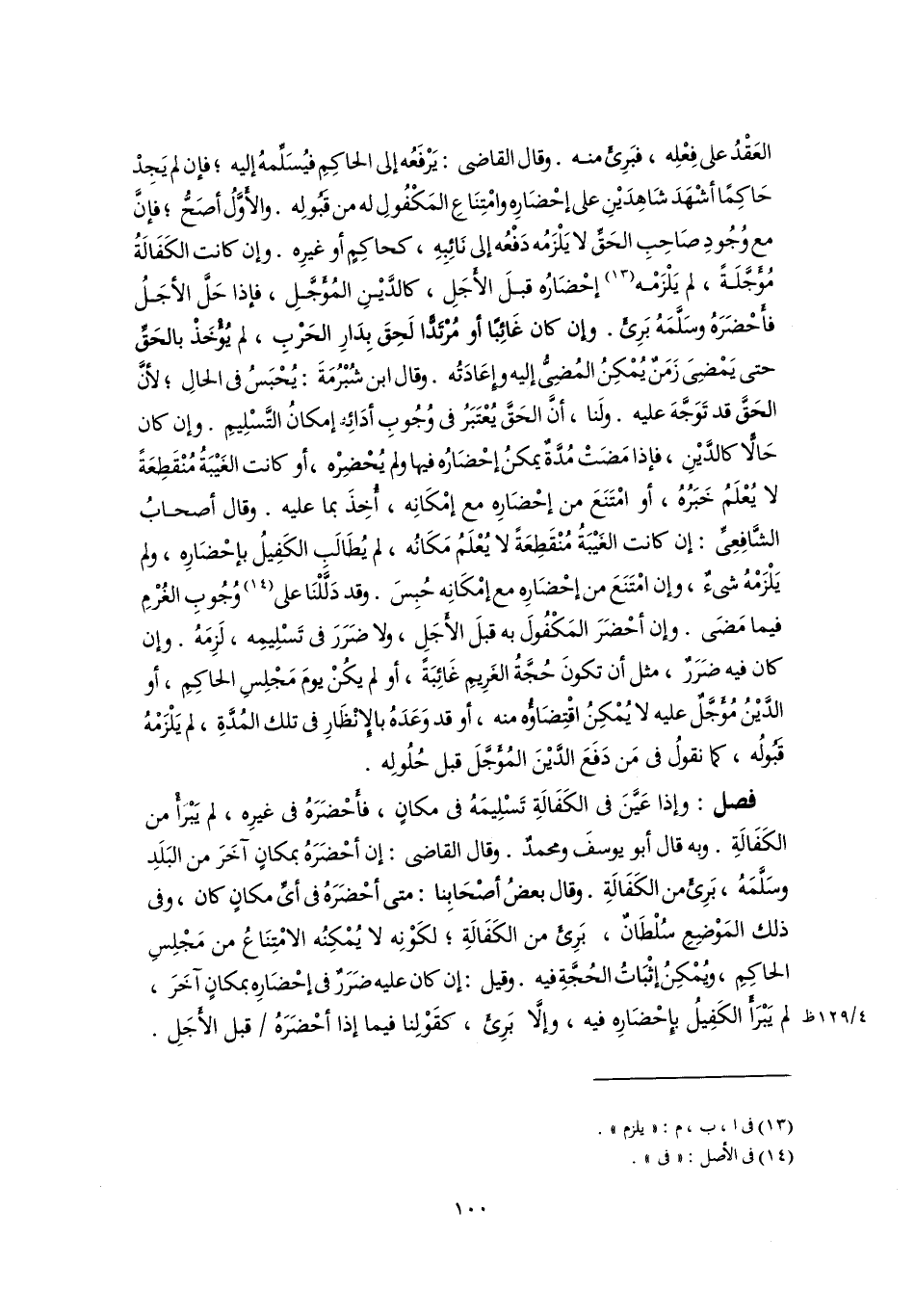 فصل: وإذا عَيَّنَ في الكَفَالَةِ تَسْلِيمَهُ في مكانٍ، فأَحْضَرَهُ في غيرِه، لم يَبْرَأْ من الكَفَالَةِ. وبه قال أبو يوسفَ ومحمدٌ. وقال القاضي: إن أحْضَرَهُ بمكانٍ آخَرَ من البَلَدِ وسَلَّمَهُ، بَرِئَ من الكَفَالَةِ. وقال بعضُ أصْحَابِنا: متى أحْضَرَهُ في أىِّ مكانٍ كان، وفى ذلك المَوْضِعِ سُلْطَانٌ، بَرِئَ من الكَفَالَةِ؛ لكَوْنِه لا يُمْكِنُه الامْتِنَاعُ من مَجْلِسِ الحاكِمِ، ويُمْكِنُ إثْبَاتُ الحُجَّةِ فيه. وقيل: إن كان عليه ضَرَرٌ في إحْضَارِه بمكانٍ آخَرَ، لم يَبْرَأَ الكَفِيلُ بإِحْضَارِه فيه، وإلَّا بَرِئَ، كقَوْلِنا فيما إذا أحْضَرَهُ قبل الأَجَلِ.