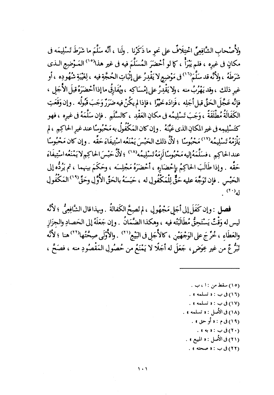 ولأَصْحابِ الشَّافِعِىِّ اخْتِلَافٌ على نحوِ ما ذَكَرْنا. ولَنا، أنَّه سَلَّمَ ما شَرَطَ تَسْلِيمَه في مكانٍ في غيرِه، فلم يَبْرَأْ، كما لو أحْضَرَ المُسَلَّمَ فيه في غير هذا (١٥) المَوْضِعِ الذي شَرَطَهُ، ولأنَّه قد سَلَّمَ (١٦) في مَوْضِعٍ لا يَقْدِرُ على إثْبَاتِ الحُجَّةِ فيه، لِغَيْبَةِ شُهُودِه، أو غيرِ ذلك، وقد يَهْرُبُ منه، ولا يَقْدِرُ على إمْسَاكِه، ويُفَارِقُ ما إذا أحْضَرَهُ قبلَ الأَجَلِ، فإنَّه عَجَّلَ الحَقَّ قبل أجَلِه، فَزادَه خَيْرًا، فإذا لم يكُنْ فيه ضَرَرٌ وَجَبَ قَبُولُه. وإن وَقَعَتِ الكَفَالَةُ مُطْلَقَةً، وَجَبَ تَسْلِيمُه في مكانِ العَقْدِ، كالسَّلَمِ. فإن سَلَّمَهُ في غيرِه، فهو كتَسْلِيمِه في غير المكانِ الذي عَيَّنَهُ. وإن كان المَكْفُولُ به مَحْبُوسًا عند غيرِ الحاكِمِ، لم يَلْزَمْهُ تَسْلِيمُه (١٧) مَحْبُوسًا؛ لأنَّ ذلك الحَبْسَ يَمْنَعُه اسْتِيفَاءَ حَقِّه. وإن كان مَحْبُوسًا عند الحاكِمِ، فسَلَّمَهُ إليه مَحْبُوسًا لَزِمَهُ تَسْلِيمُه (١٨)؛ لأنَّ حَبْسَ الحاكِمِ لا يَمْنَعُه اسْتِيفَاءَ حَقِّه. وإذا طَالَبَ الحاكِمُ بإِحْضَارِه، أحْضَرَهُ مَجْلِسَه، وحَكَمَ بينهما، ثم يَرُدُّه إلى الحَبْسِ. فإن تَوَجَّهَ عليه حَقٌّ لِلْمَكْفُولِ له، حَبَسَهُ بالحَقِّ الأَوَّلِ وحَقِّ (١٩) المَكْفُولِ له (٢٠).