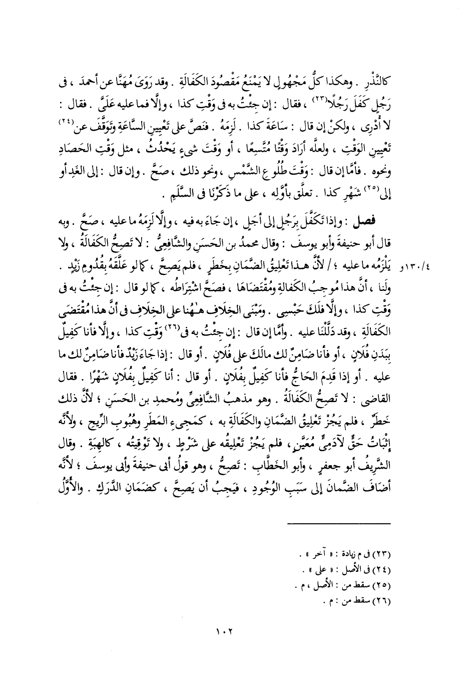 كالنَّذْرِ. وهكذا كلُّ مَجْهُولٍ لا يَمْنَعُ مَقْصُودَ الكَفَالَةِ. وقد رَوَىَ مُهَنَّا عن أحمدَ، في رَجُلٍ كَفَلَ رَجُلًا (٢٣)، فقال: إن جِئْتُ به في وَقْتِ كذا، وإلَّا فما عليه عَلَىَّ. فقال: لا أَدْرِى، ولكنْ إن قال: سَاعَةَ كذا. لَزِمَهُ. فنَصَّ على تَعْيِينِ السَّاعَةِ وتَوَقَّفَ عن (٢٤) تَعْيِينِ الوَقْتِ، ولعلَّه أرَادَ وَقْتًا مُتَّسِعًا، أو وَقْتَ شيءٍ يَحْدُثُ، مثل وَقْتِ الحَصَادِ ونحوه. فأمَّا إن قال: وَقْتَ طُلُوعِ الشَّمْسِ، ونحو ذلك، صَحَّ. وإن قال: إلى الغَدِ أو إلى (٢٥) شَهْرِ كذا. تعلَّق بأوَّلِه، على ما ذَكَرْنَا في السَّلَمِ.