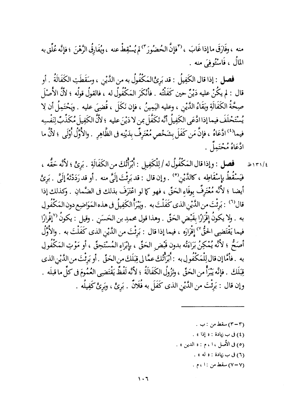 فصل: وإذا قال المَكْفُولُ له لِلْكَفِيلِ: أَبْرَأْتُكَ من الكَفَالَةِ. بَرِئَ؛ لأنَّه حَقُّه، فيَسْقُطُ بإِسْقَاطِه، كالدَّيْنِ (٥). وإن قال: قد بَرِئْتَ إلَىَّ منه. أو قد رَدَدْتَهُ إلَىَّ. بَرِئَ أيضًا؛ لأنَّه مُعْتَرِفٌ بِوفَاءِ الحَقِّ، فهو كما لو اعْتَرَفَ بذلك في الضَّمانِ. وكذلك إذا قال (٦): بَرِئْتَ من الدَّيْنِ الذي كَفَلْتَ به. ويَبْرَأُ الكَفِيلُ في هذه المَوَاضِع دون المَكْفُولِ به. ولا يكونُ إِقْرَارًا بِقَبْضِ الحَقِّ. وهذا قول محمدِ بن الحَسَنِ. وقيل: يكونُ [إقْرارًا فيما يَقْتَضِى الحقُّ] (٧) إِقْرَارَه، فيما إذا قال: بَرِئْتَ من الدَّيْنِ الذي كَفَلْتَ به. والأَوَّلُ أصَحُّ؛ لأنَّه يُمْكِنُ بَرَاءَتُه بدون قَبْضِ الحَقِّ، بإِبْرَاءِ المُسْتَحِقِّ، أو مَوْتِ المَكْفُولِ به. فأمَّا إن قال لِلْمَكْفُولِ به: أَبْرَأْتُكَ عمَّا لي قِبَلَكَ من الحَقِّ. أو بَرِئْتَ من الدَّيْنِ الذي قِبَلَكَ. فإنَّه يَبْرَأُ من الحَقِّ، وتَزُولُ الكَفَالَةُ؛ لأنَّه لَفْظٌ يَقْتَضِى العُمُومَ في كلِّ ما قبلَه. وإن قال: بَرِئْتَ من الدَّيْنِ الذي كَفَلَ به فُلَانٌ. بَرِئَ، وبَرِئَ كَفِيلُه.