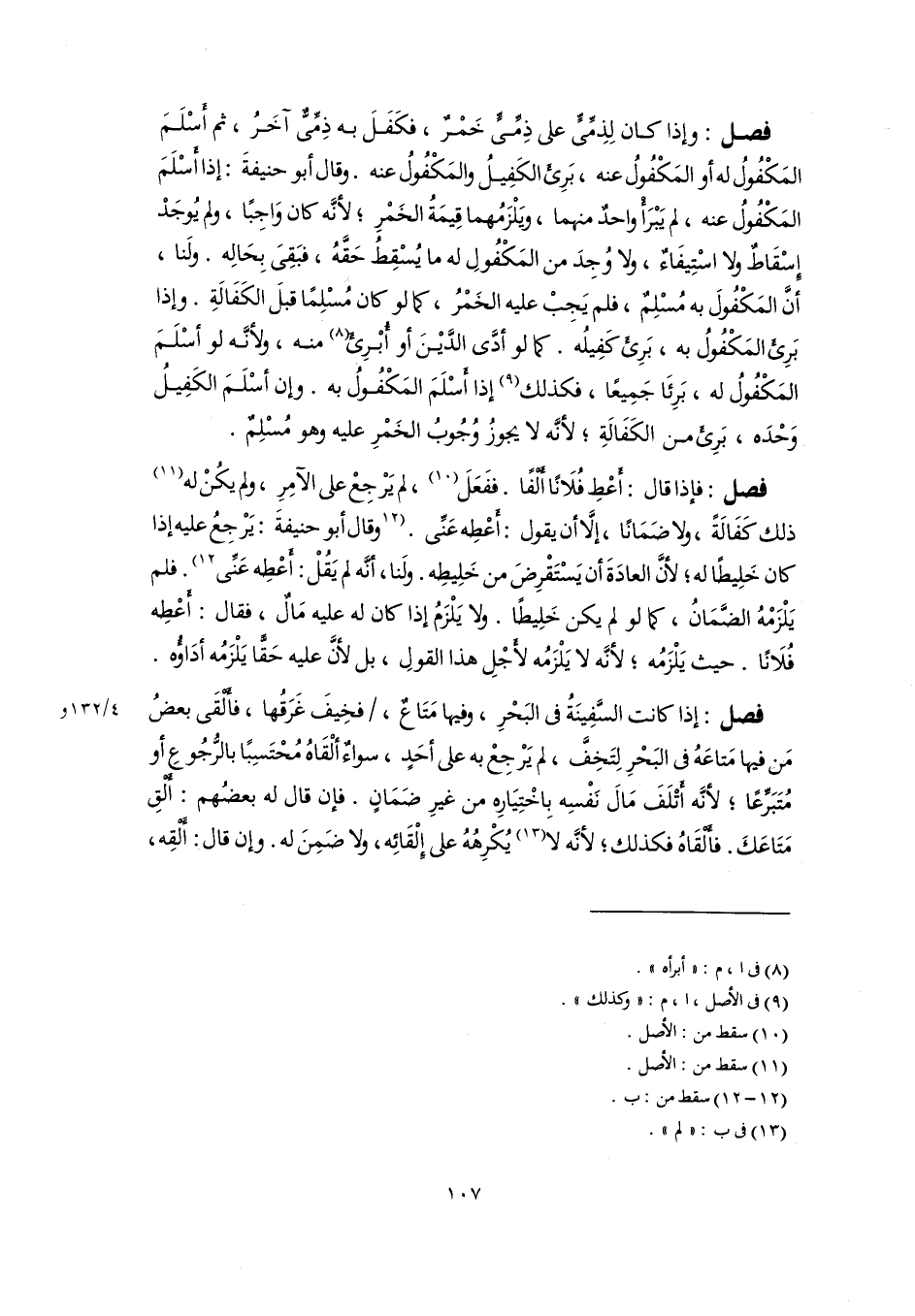 فصل: وإذا كان لِذِمِّىٍّ على ذِمِّىٍّ خَمْرٌ، فكَفَلَ به ذِمِّىٌّ آخَرُ، ثم أَسْلَمَ المَكْفُولُ له أو المَكْفُولُ عنه، بَرِئَ الكَفِيلُ والمَكْفُولُ عنه. وقال أبو حنيفةَ: إذا أَسْلَمَ المَكْفُولُ عنه، لم يَبْرأْ واحدٌ منهما، ويَلْزَمُهما قِيمَةُ الخَمْرِ؛ لأنَّه كان وَاجِبًا، ولم يُوجَدْ إِسْقَاطٌ ولا اسْتِيفَاءٌ، ولا وُجِدَ من المَكْفُولِ له ما يُسْقِطُ حَقَّهُ، فبَقِىَ بِحَالِه. ولَنا، أنَّ المَكْفُولَ به مُسْلِمٌ، فلم يَجِبْ عليه الخَمْرُ، كما لو كان مُسْلِمًا قبلَ الكَفَالَةِ. وإذا بَرِئَ المَكْفُولُ به، بَرِئَ كَفِيلُه. كما لو أدَّى الدَّيْنَ أو أُبْرِئَ (٨) منه، ولأنَّه لو أسْلَمَ المَكْفُولُ له، بَرِئَا جَمِيعًا، فكذلك (٩) إذا أَسْلَمَ المَكْفُولُ به. وإن أسْلَمَ الكَفِيلُ وَحْدَه، بَرِئَ من الكَفَالَةِ؛ لأنَّه لا يجوزُ وُجُوبُ الخَمْرِ عليه وهو مُسْلِمٌ.