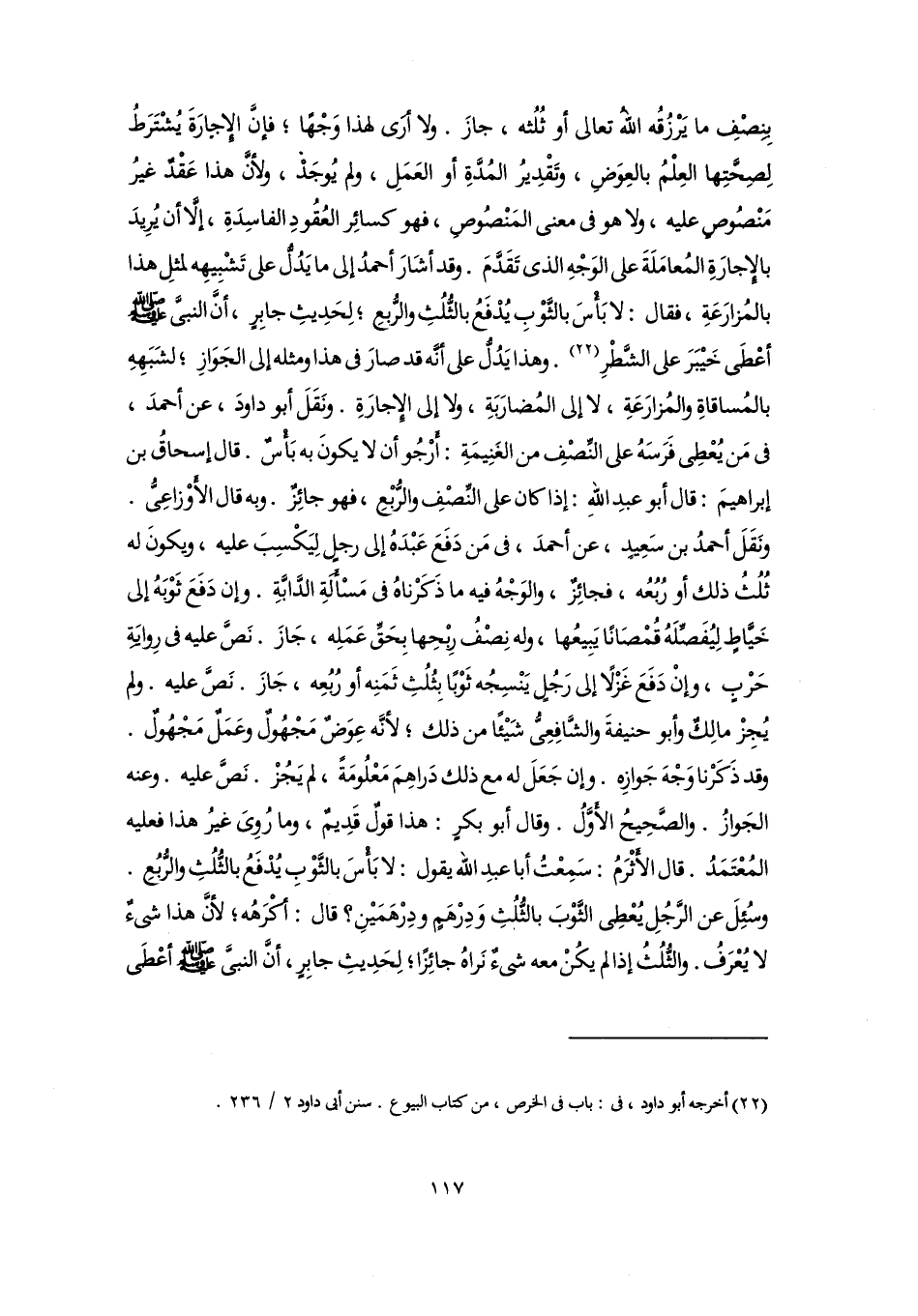 بِنِصْفِ ما يَرْزُقُه اللهُ تعالى أو ثُلُثه، جازَ. ولا أرَى لهذا وَجْهًا؛ فإنَّ الإِجارَةَ يُشْتَرَطُ لِصِحَّتِها العِلْمُ بالعِوَضِ، وتَقْدِيرُ المُدَّةِ أو العَمَلِ، ولم يُوجَدْ، ولأنَّ هذا عَقْدٌ غيرُ مَنْصُوصٍ عليه، ولا هو في معنى المَنْصُوصِ، فهو كسائِر العُقُودِ الفاسِدَةِ، إلَّا أن يُرِيدَ بالإِجارَةِ المُعامَلَةَ على الوَجْهِ الذي تَقَدَّمَ. وقد أشَارَ أحمدُ إلى ما يَدُلُّ على تَشْبِيهِه لمثلِ هذا بالمُزارَعَةِ، فقال: لا بَأْسَ بالثَّوْبِ يُدْفَعُ بالثُّلُثِ والرُّبعِ؛ لِحَدِيثِ جابِرٍ، أنَّ النبيَّ -صلى اللَّه عليه وسلم- أعْطَى خَيْبَرَ على الشَّطْرِ (٢٢). وهذا يَدُلُّ على أنَّه قد صارَ في هذا ومثله إلى الجَوَازِ؛ لشَبَهِهِ بالمُساقاةِ والمُزارَعَةِ، لا إلى المُضارَبَةِ، ولا إلى الإِجارَةِ. ونَقَلَ أبو داودَ، عن أحمدَ، في مَن يُعْطِى فَرَسَهُ على النِّصْفِ من الغَنِيمَةِ: أَرْجُو أن لا يكونَ به بَأْسٌ. قال إسحاقُ بن إبراهيمَ: قال أبو عبدِ اللهِ: إذا كان على النِّصْفِ والرُّبْعِ، فهو جائِزٌ. وبه قال الأَوْزاعِىُّ. ونَقَلَ أحمدُ بن سَعِيدٍ، عن أحمدَ، في مَن دَفَعَ عَبْدَهُ إلى رجلٍ لِيَكْسِبَ عليه، ويكونَ له ثُلُثُ ذلك أو رُبُعُه، فجائِزٌ، والوَجْهُ فيه ما ذَكَرْناهُ في مَسْأَلَةِ الدَّابَّةِ. وإن دَفَعَ ثَوْبَهُ إلى خَيَّاطٍ لِيُفَصِّلَهُ قُمْصَانًا يَبِيعُها، وله نِصْفُ رِبْحِها بِحَقِّ عَمَلِه، جَازَ. نَصَّ عليه في رِوايَةِ حَرْبٍ، وإنْ دَفَعَ غَزْلًا إلى رَجُلٍ يَنْسِجُه ثَوْبًا بِثُلُثِ ثَمَنِه أو رُبُعِه، جَازَ. نَصَّ عليه. ولم يُجِزْ مالِكٌ وأبو حنيفةَ والشَّافِعِىُّ شَيْئًا من ذلك؛ لأنَّه عِوَضٌ مَجْهُولٌ وعَمَلٌ مَجْهُولٌ. وقد ذَكَرْنا وَجْهَ جَوازِه. وإن جَعَلَ له مع ذلك دَراهِمَ مَعْلُومَةً، لم يَجُزْ. نَصَّ عليه. وعنه الجَوازُ. والصَّحِيحُ الأَوَّلُ. وقال أبو بكرٍ: هذا قولٌ قَدِيمٌ، وما رُوِىَ غيرُ هذا فعليه المُعْتَمَدُ. قال الأَثْرَمُ: سَمِعْتُ أبا عبدِ اللَّه يقول: لا بَأْسَ بالثَّوْبِ يُدْفَعُ بالثُّلُثِ والرُّبُعِ. وسُئِلَ عن الرَّجُلِ يُعْطِى الثَّوْبَ بالثُّلُثِ وَدِرْهَمٍ ودِرْهَمَيْنِ؟ قال: أكْرَهُه؛ لأنَّ هذا شيءٌ لا يُعْرَفُ. والثُّلُثُ إذا لم يكُنْ معه شيءٌ نَراهُ جائِزًا؛ لِحَدِيثِ جابِرٍ، أنَّ النبيَّ -صلى اللَّه عليه وسلم- أعْطَى