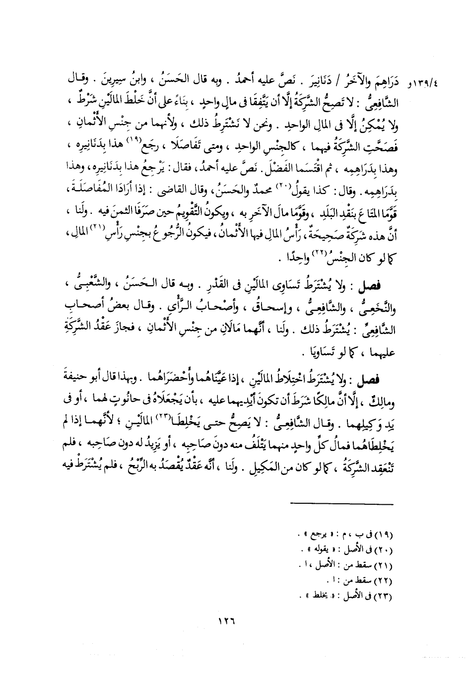 دَرَاهِمَ والآخَرُ دَنَانِيرَ. نَصَّ عليه أحمدُ. وبه قال الحَسَنُ، وابنُ سِيرِينَ. وقال الشَّافِعِىُّ: لا تَصِحُّ الشَّرِكَةُ إلَّا أن يَتَّفِقَا في مالٍ واحدٍ، بِنَاءً على أنَّ خَلْطَ المالَيْنِ شَرْطٌ، ولا يُمْكِنُ إلَّا في المالِ الواحدِ. ونحن لا نَشْتَرِطُ ذلك، ولأنهما من جِنْسِ الأَثْمانِ، فَصَحَّتِ الشَّرِكَةُ فيهما، كالجِنْسِ الواحدِ، ومتى تَفَاصَلَا، رجَع (١٩) هذا بِدَنَانِيرِه، وهذا بِدَرَاهِمِه، ثم اقْتَسَما الفَضْلَ. نَصَّ عليه أحمدُ، فقال: يَرْجِعُ هذا بِدَنَانِيرِه، وهذا بِدَرَاهِمِه. وقال: كذا يقولُ (٢٠) محمدٌ والحَسَنُ، وقال القاضي: إذا أرَادَا المُفَاصَلَةَ، قَوَّمَا المتَاعَ بنَقْدِ البَلَدِ، وقَوَّمَا مالَ الآخَرِ به، ويكونُ التَّقْوِيمُ حين صَرَفَا الثمنَ فيه. ولَنا، أنَّ هذه شَرِكَةٌ صَحِيحَةٌ، رَأُسُ المالِ فيها الأَثْمانُ، فيكونُ الرُّجُوعُ بجِنْسِ رَأْسِ (٢١) المالِ، كما لو كان الجِنْسُ (٢٢) واحِدًا.