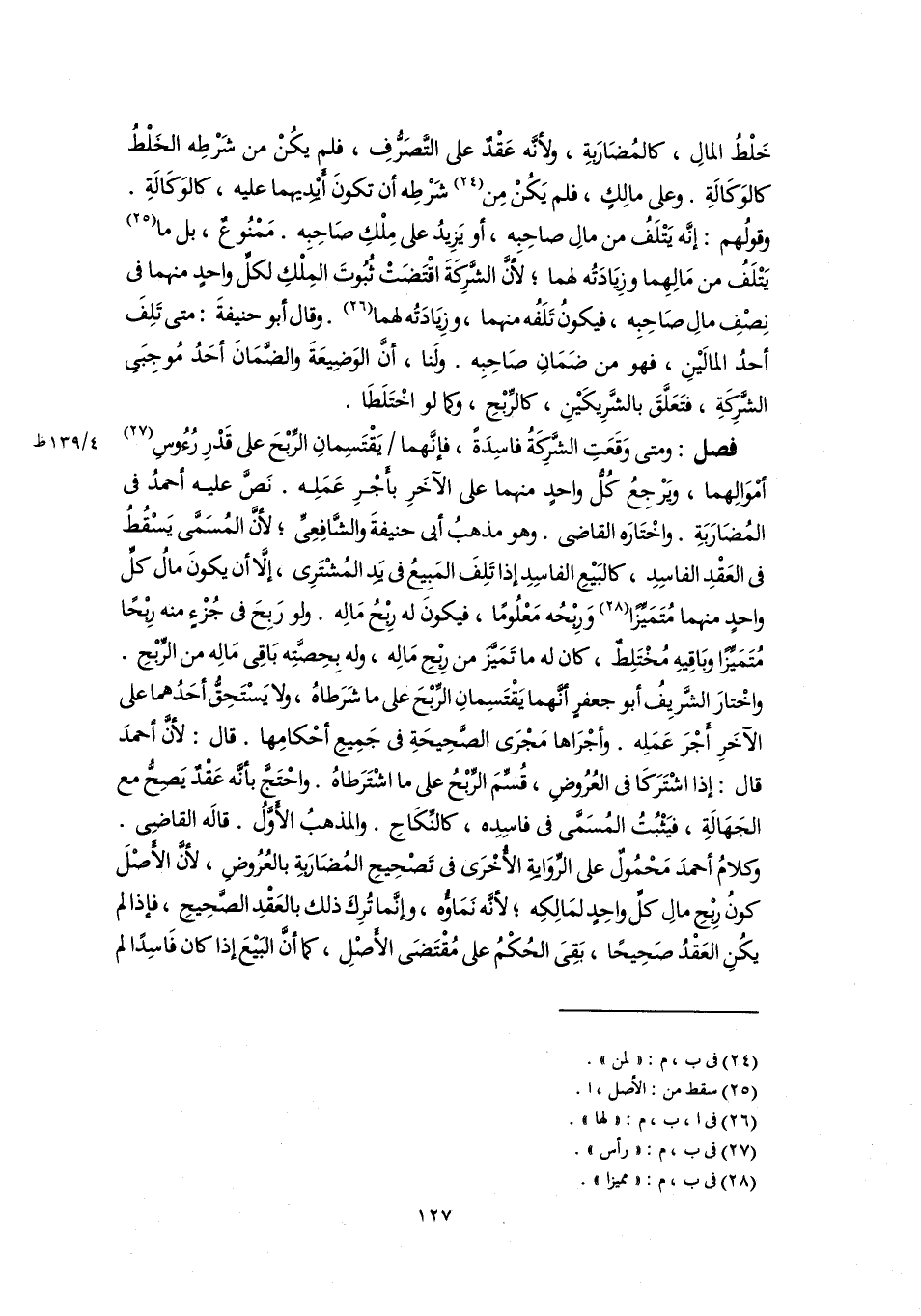 فصل: ومتى وَقَعَتِ الشَّرِكَةُ فاسِدَةً، فإنَّهما يَقْتَسِمانِ الرِّبْحَ على قَدْرِ رُءُوسِ (٢٧) أمْوَالِهما، ويَرْجِعُ كُلُّ واحدٍ منهما على الآخَرِ بأَجْرِ عَمَلِه. نَصَّ عليه أحمدُ في المُضَارَبَةِ. واخْتَارَه القاضي. وهو مذهبُ أبى حنيفةَ والشَّافِعِىِّ؛ لأنَّ المُسَمَّى يَسْقُطُ في العَقْدِ الفاسِدِ، كالبَيْعِ الفاسِدِ إذا تَلِفَ المَبِيعُ في يَدِ المُشْتَرِى، إلَّا أن يكونَ مالُ كلِّ واحدٍ منهما مُتَمَيِّزًا (٢٨) وَرِبْحُه مَعْلُومًا، فيكونَ له رِبْحُ مَالِه. ولو رَبِحَ في جُزْءٍ منه رِبْحًا مُتَمَيِّزًا وبَاقِيهِ مُخْتَلِطٌ، كان له ما تَمَيَّزَ مَن رِبْحِ مَالِه، وله بِحِصَّتِه بَاقِى مَالِه من الرِّبحِ. واخْتارَ الشَّرِيفُ أبو جعفرٍ أنَّهما يَقْتَسِمانِ الرِّبْحَ على ما شَرَطاهُ، ولا يَسْتَحِقُّ أحَدُهما على الآخَرِ أَجْرَ عَمَلِه. وأجْرَاها مَجْرَى الصَّحِيحَةِ في جَمِيعِ أحْكامِها. قال: لأنَّ أحمدَ قال: إذا اشْتَرَكَا في العُرُوضِ، قُسِّمَ الرِّبْحُ على ما اشْتَرَطاهُ. واحْتَجَّ بأنَّه عَقْدٌ يَصِحُّ مع الجَهَالَةِ، فيَثْبُتُ المُسَمَّى في فاسِدِه، كالنِّكَاحِ. والمذهبُ الأَوَّلُ. قالَه القاضِى. وكلامُ أحمدَ مَحْمُولٌ على الرِّوَايةِ الأُخْرَى في تَصْحِيحِ المُضَارَبةِ بالعُرُوضِ، لأنَّ الأَصْلَ كونُ رِبْحِ مالِ كلِّ واحِدٍ لمَالِكِه؛ لأنَّه نَمَاؤُه، وإنَّما تُرِكَ ذلك بالعَقْدِ الصَّحِيحِ، فإذا لم يكُنِ العَقْدُ صَحِيحًا، بَقِىَ الحُكْمُ على مُقْتَضَى الأَصْلِ، كما أنَّ البَيْعَ إذا كان فَاسِدًا لم