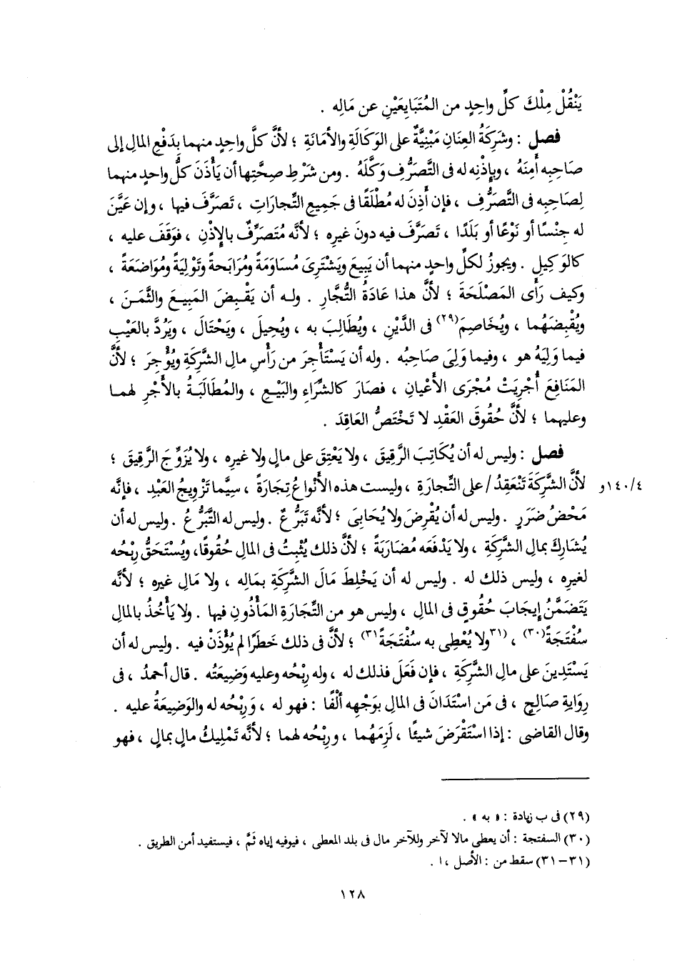 فصل: وشَرِكَةُ العِنَانِ مَبْنِيَّةٌ على الوَكَالَةِ والأمَانَةِ؛ لأنَّ كلَّ واحِدٍ منهما بِدَفْعِ المالِ إلى صَاحِبِه أَمِنَهُ، وبإِذْنِه له في التَّصَرُّفِ وَكَّلَهُ. ومن شَرْطِ صِحَّتِها أن يَأْذَنَ كلُّ واحدٍ منهما لِصَاحِبِه في التَّصَرُّفِ، فإن أَذِنَ له مُطْلَقًا في جَمِيعِ التِّجارَاتِ، تَصَرَّفَ فيها، وإن عَيَّنَ له جِنْسًا أو نَوْعًا أو بَلَدًا، تَصَرَّفَ فيه دونَ غيرِه؛ لأنَّه مُتَصَرِّفٌ بالإِذْنِ، فوَقَفَ عليه، كالوَكِيلِ. ويجوزُ لكلِّ واحدٍ منهما أن يَبِيعَ ويَشْتَرِىَ مُسَاوَمَةً ومُرَابَحةً وتَوْلِيَةً ومُوَاضَعَةً، كيف رَأَى المَصْلَحَة؛ لأنَّ هذا عَادَةُ التُّجَّارِ. وله أن يَقْبِضَ المَبِيعَ والثَّمَنَ، ويُقبِضَهُما، ويُخَاصِمَ (٢٩) في الدَّيْنِ، ويُطَالِبَ به، ويُحِيلَ، ويَحْتَالَ، ويَرُدَّ بالعَيْبِ فيما وَلِيَهُ هو، وفيما وَلِىَ صَاحِبُه. وله أن يَسْتَأْجِرَ من رَأْسِ مالِ الشَّرِكَةِ ويُؤْجِرَ؛ لأنَّ المَنَافِعَ أُجْرِيَتْ مُجْرَى الأَعْيانِ، فصَارَ كالشِّرَاءِ والبَيْعِ، والمُطَالَبَةُ بالأَجْرِ لهما وعليهما؛ لأنَّ حُقُوقَ العَقْدِ لا تَخْتَصُّ العَاقِدَ.