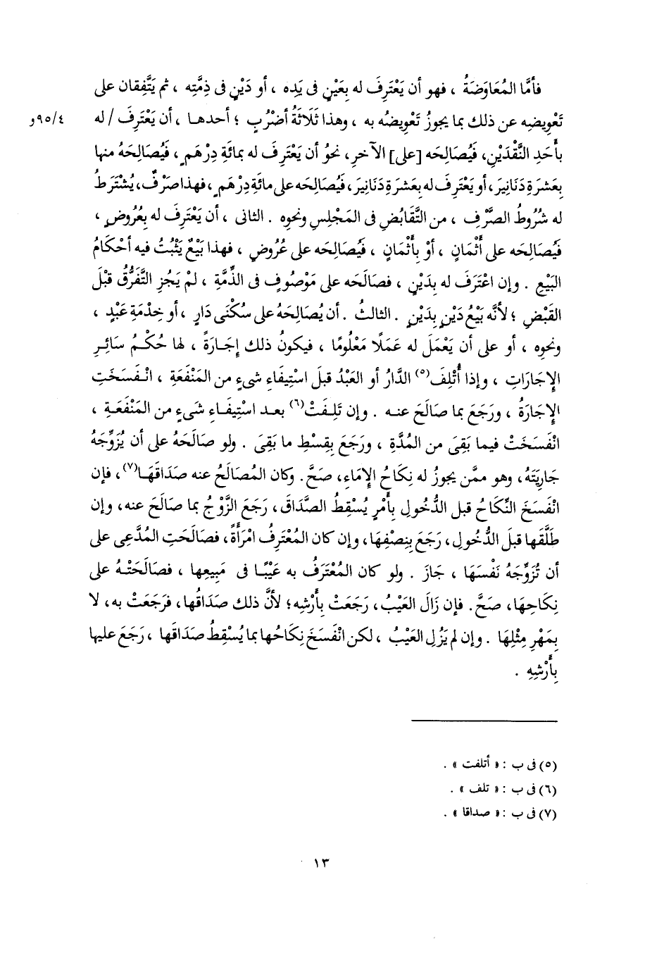 فأمَّا المُعَاوَضَةُ، فهو أن يَعْتَرِفَ له بِعَيْنٍ فى يَدِه، أو دَيْنٍ فى ذِمَّتِه، ثم يَتَّفِقان على تَعْوِيضِه عن ذلك بما يجوزُ تَعْوِيضُه به، وهذا ثَلَاثَةُ أضْرُبٍ؛ أحدها، أن يَعْتَرِفَ له بأَحَدِ النَّقْدَيْنِ، فَيُصَالِحَه [على] الآخرِ، نحوُ أن يَعْتَرِفَ له بمائَةِ دِرْهَمٍ، فَيُصَالِحَهُ منها بِعَشرَةِ دَنَانِيرَ، أو يَعْتَرِفَ له بِعَشرَةِ دَنَانِيرَ، فَيُصَالِحَه على مائَةِ دِرْهَمٍ، فهذا صَرْفٌ، يُشْتَرَطُ له شُرُوطُ الصَّرْفِ، من التَّقَابُضِ فى المَجْلِسِ ونحوِه. الثانى، أن يَعْتَرِفَ له بِعُرُوضٍ، فيُصَالِحَه على أَثْمَانٍ، أوْ بِأَثْمَانٍ، فيُصَالِحَه على عُرُوضٍ، فهذا بَيْعٌ يَثْبُتُ فيه أحْكَامُ البَيْعِ. وإن اعْتَرَفَ له بِدَيْنٍ، فصَالَحَه على مَوْصُوفٍ فى الذِّمَّةِ، لمْ يَجُزِ التَّفَرُّقُ قبْلَ القَبْضِ؛ لأنَّه بَيْعُ دَيْنٍ بِدَيْنٍ. الثالثُ. أن يُصَالِحَهُ على سُكْنَى دَارٍ، أو خِدْمَةِ عَبْدٍ، ونحوِه، أو على أن يَعْمَلَ له عَمَلًا مَعْلُومًا، فيكونُ ذلك إِجَارَةً، لها حُكْمُ سَائِرِ الإِجَارَاتِ، وإذا أُتْلِفَ (٥) الدَّارُ أو العَبْدُ قبلَ اسْتِيفَاءِ شىءٍ من المَنْفَعَةِ، انْفَسَخَتِ الإِجَارَةُ، ورَجَعَ بما صَالَحَ عنه. وإن تَلِفَتْ (٦) بعد اسْتِيفَاءِ شَىءٍ من المَنْفَعَةِ، انْفَسَخَتْ فيما بَقِىَ من المُدَّةِ، ورَجَعَ بِقِسْطِ ما بَقِىَ. ولو صَالَحَهُ على أن يُزَوِّجَهُ جَارِيَتَهُ، وهو ممَّن يجوزُ له نِكَاحُ الإِمَاءِ، صَحَّ. وكان المُصَالَحُ عنه صَدَاقَهَا (٧)، فإن انْفَسَخَ النِّكَاحُ قبل الدُّخُولِ بِأَمْرٍ يُسْقِطُ الصَّدَاقَ، رَجَعَ الزَّوْجُ بما صَالَحَ عنه، وإن طَلَّقَها قبلَ الدُّخُولِ، رَجَعَ بِنِصْفِهَا، وإن كان المُعْتَرِفُ امْرأَةً، فصَالَحَتِ المُدَّعِى على أن تُزَوِّجَهُ نَفْسَهَا، جَازَ. ولو كان المُعْتَرَفُ به عَيْبًا فى مَبِيعِها، فصَالَحَتْهُ على نِكَاحِهَا، صَحَّ. فإن زَالَ العَيْبُ، رَجَعَتْ بِأَرْشِه؛ لأنَّ ذلك صَدَاقُها، فرَجَعَتْ به، لا بِمَهْرِ مِثْلِهَا. وإن لم يَزُلِ العَيْبُ، لكن انْفَسَخَ نِكَاحُها بما يُسْقِطُ صَدَاقَها، رَجَعَ عليها بِأَرْشِهِ.