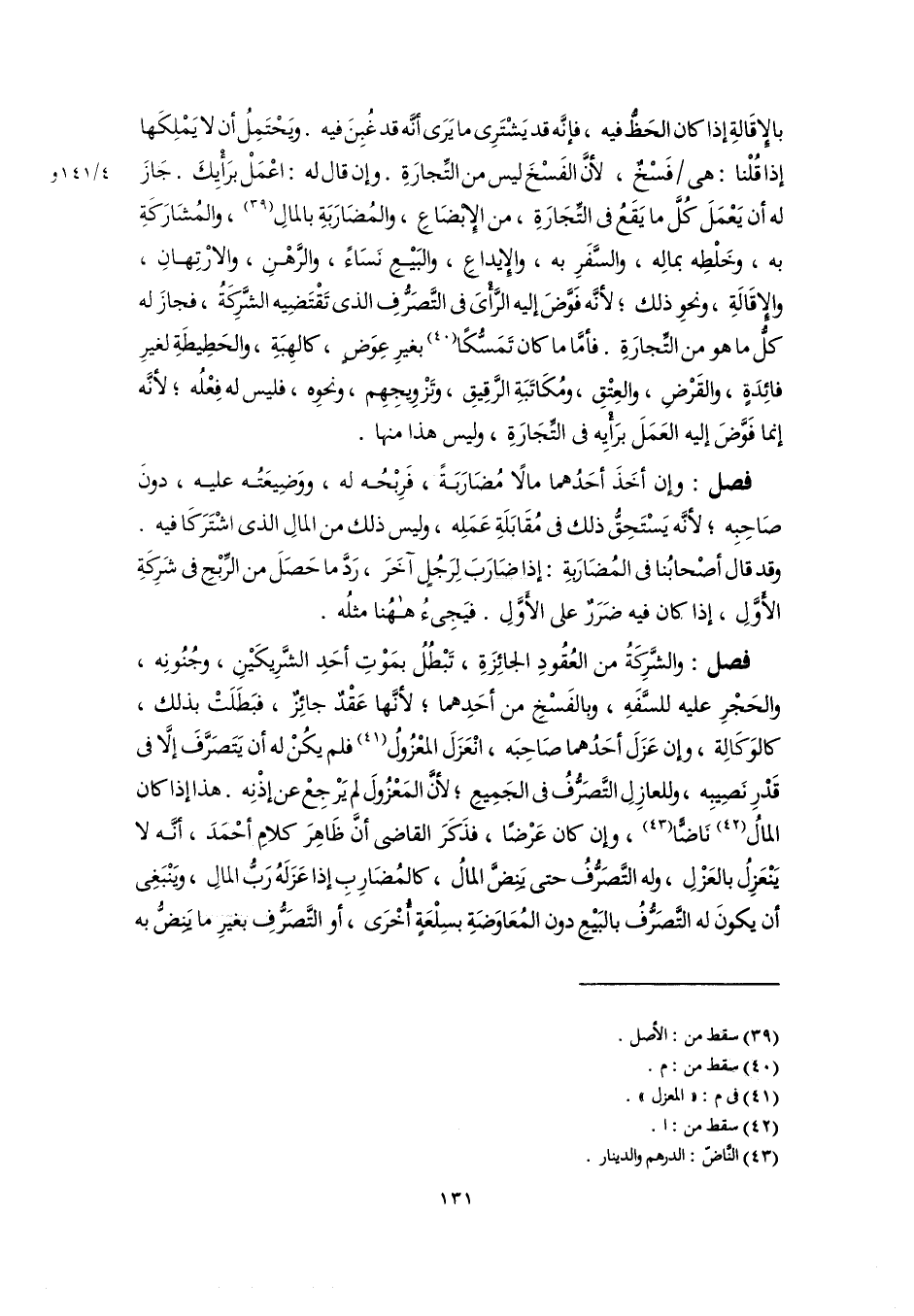 فصل: والشَّرِكَةُ من العُقُودِ الجائِزَةِ، تَبْطُلُ بمَوْتِ أحَدِ الشَّرِيكَيْنِ، وجُنُونِه، والحَجْرِ عليه للسَّفَهِ، وبالفَسْخِ من أحَدِهما؛ لأنَّها عَقْدٌ جائِزٌ، فبَطَلَتْ بذلك، كالوَكَالِة، وإن عَزَلَ أحَدُهما صَاحِبَه، انْعَزَلَ المعْزُولُ (٤١) فلم يكُنْ له أن يَتَصَرَّفَ إلَّا في قَدْرِ نَصِيبِه، وللعازِلِ التَّصَرُّفُ في الجَمِيعِ؛ لأنَّ المَعْزُولَ لم يَرْجِعْ عن إذْنِه. هذا إذا كان المالُ (٤٢) نَاضًّا (٤٣)، وإن كان عَرْضًا، فذَكَرَ القاضي أنَّ ظَاهِرَ كلامِ أحْمَدَ، أنَّه لا يَنْعَزِلُ بالعَزْلِ، وله التَّصَرُّفُ حتى يَنِضَّ المالُ، كالمُضَارِبِ إذا عَزَلَهُ رَبُّ المالِ، وَينْبَغِى أن يكونَ له التَّصَرُّفُ بالبَيْعِ دون المُعَاوَضَةِ بسِلْعَةٍ أُخْرَى، أو التَّصَرُّفِ بغيرِ ما يَنِضُّ به