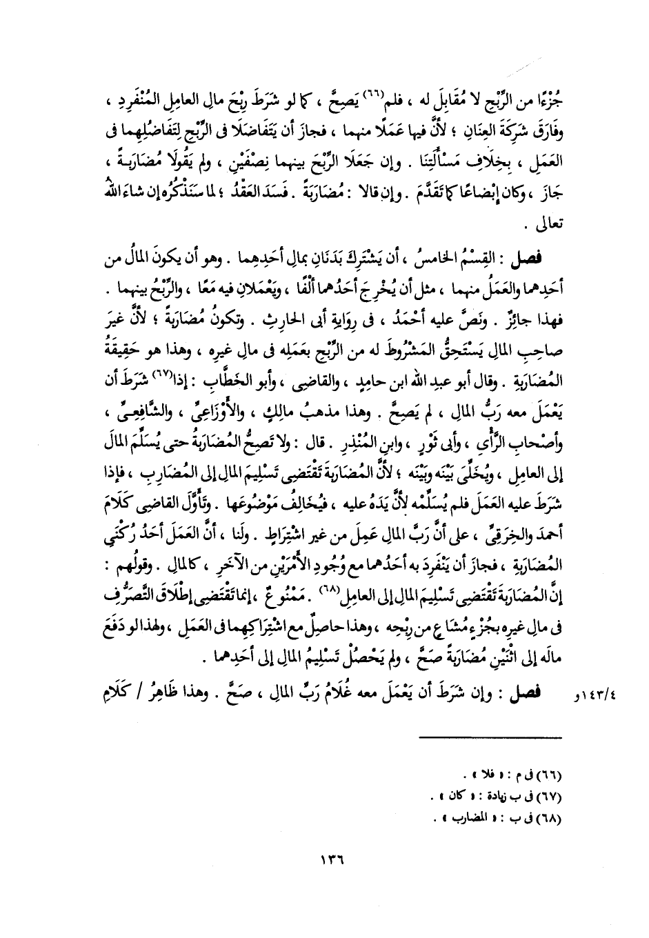 فصل: القِسْمُ الخامسُ، أن يَشْتَرِكَ بَدَنَانِ بمالِ أحَدِهِما. وهو أن يكونَ المالُ من أحَدِهما والعَمَلُ منهما، مثل أن يُخْرِجَ أحَدُهما ألْفًا، ويَعْمَلانِ فيه مَعًا، والرِّبْحُ بينهما. فهذا جائِزٌ. ونَصَّ عليه أحْمَدُ، في رِوَايةِ أبى الحارِثِ. وتكونُ مُضَارَبةً؛ لأنَّ غيرَ صاحِبِ المالِ يَسْتَحِقُّ المَشْرُوطَ له من الرِّبْحِ بعَمَلِه في مالِ غيرِه، وهذا هو حَقِيقَةُ المُضَارَبةِ. وقال أبو عبدِ اللَّه ابن حامِدٍ، والقاضِى، وأبو الخَطَّابِ: إذا (٦٧) شَرَطَ أن يَعْمَلَ معه رَبُّ المالِ، لم يَصِحَّ. وهذا مذهبُ مالِكٍ، والأَوْزَاعِىِّ، والشَّافِعِىِّ، وأصْحابِ الرَّأْىِ، وأبى ثَوْرٍ، وابنِ المُنْذِرِ. قال: ولا تَصِحُّ المُضَارَبةُ حتى يُسَلِّمَ المالَ إلى العامِلِ، ويُخَلِّىَ بَيْنَه وبَيْنَه؛ لأنَّ المُضَارَبةَ تَقْتَضِى تَسْلِيمَ المالِ إلى المُضَارِبِ، فإذا شَرَطَ عليه العَمَلَ فلم يُسَلِّمْه لأنَّ يَدَهُ عليه، فيُخالِفُ مَوضُوعَها. وتَأَوَّلَ القاضِى كَلَامَ أحمدَ والخِرَقِىِّ، على أنَّ رَبَّ المالِ عَمِلَ من غير اشْتِرَاطٍ. ولَنا، أنَّ العَمَلَ أحَدُ رُكْنَىِ المُضَارَبةِ، فجازَ أن يَنْفَرِدَ به أحَدُهما مع وُجُودِ الأَمْرَيْنِ من الآخَرِ، كالمالِ. وقولُهم: إنَّ المُضَارَبةَ تَقْتَضِى تَسْلِيمَ المالِ إلى العامِلِ (٦٨). مَمْنُوعٌ، إنما تَقْتَضِى إطْلَاقَ التَّصَرُّفِ في مالِ غيرِه بجُزْءٍ مُشَاعٍ من رِبْحِه، وهذا حاصِلٌ مع اشْتِرَاكِهِما في العَمَلِ، ولهذا لو دَفَعَ مالَه إلى اثْنَيْنِ مُضَارَبةً صَحَّ، ولم يَحْصُلْ تَسْلِيمُ المالِ إلى أحَدِهما.