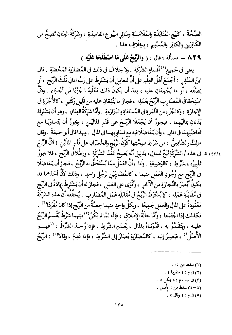 يعني في جَمِيعِ (١) أقْسامِ الشَّرِكَةِ. ولا خِلَافَ في ذلك في المُضارَبةِ المَحْضَةِ. قال ابنُ المُنْذِرِ: أجْمَعَ أهْلُ العِلْمِ على أنَّ للعامِلِ أن يَشْتَرِطَ على رَبِّ المالِ ثُلُثَ الرِّبْحِ، أو نِصْفَه، أو ما يُجْمِعَانِ عليه، بعدَ أن يكونَ ذلك مَعْلُومًا جُزْءًا من أجْزَاء. ولأنَّ اسْتِحْقاقَ المُضَارِبِ الرِّبْحَ بعَمَلِه، فجازَ ما يَتَّفِقانِ عليه من قَلِيلٍ وكَثِيرٍ، كالأُجْرَةِ في الإِجارَةِ، وكالجُزْءِ من الثَّمَرةِ في المُسَاقاةِ والمُزَارَعةِ. وأمَّا شَرِكَةُ العِنَانِ، وهو أن يَشْتَرِكَ بَدَنانِ بمالَيْهِما، فيجوزُ أن يَجْعَلَا الرِّبْحَ على قَدْرِ المالَيْنِ، ويجوزُ أن يَتَساوَيَا مع تَفَاضُلِهِمَا في المالِ، وأن يَتَفَاضَلَا فيه مع تَسَاوِيهِما في المالِ. وبهذا قال أبو حنيفةَ. وقال مالِكٌ والشَّافِعِىُّ: من شَرْطِ صِحَّتِها كَوْنُ الرِّبْحِ والخُسْرَانِ على قَدْرِ المالَيْنِ؛ لأنَّ الرِّبْحَ في هذه الشَّرِكَةِ تَبَعٌ للمالِ، بدَلِيلِ أنَّه يَصِحُّ عَقْدُ الشَّرِكَةِ، وإطْلاقُ الرِّبْحِ، فلا يجوزُ تَغْيِيرُه بالشَّرْطِ، كالوَضِيعَةِ. ولَنا، أنَّ العَمَلَ ممَّا يُسْتَحَقُّ به الرِّبْحُ، فجازَ أن يَتَفاضَلَا في الرِّبْحِ مع وُجُودِ العَمَلِ منهما، كالمُضَارِبَيْنِ لرَجُلٍ واحدٍ، وذلك لأنَّ أحَدَهما قد يكونُ أبْصَرَ بالتِّجارَةِ من الآخَرِ، وأقْوَى على العَمَلِ، فجازَ له أن يَشْتَرِطَ زِيَادَةً في الرِّبْحِ في مُقَابَلَةِ عَمَلِه، كما يُشْتَرَطُ الرِّبْحُ في مُقَابَلَةِ عَمَلِ المُضَارِبِ. يُحقِّقُه أنَّ هذه الشَّرِكَةَ مَعْقُودةٌ على المالِ والعَمَلِ جَمِيعًا، ولكلِّ واحدٍ منهما حِصَّةٌ من الرِّبْحِ إذا كان مُفْرَدًا (٢)، فكذلك إذا اجْتَمَعًا، وأمَّا حالَةُ الإِطْلاقِ، فإنَّه لمَّا لم يَكُنْ (٣) بينهما شَرْطٌ يُقْسمُ الرِّبْحُ عليه، ويَتَقَدَّرُ به، قَدَّرْناهُ بالمالِ، لِعَدَمِ الشَّرْطِ، فإذا وُجِدَ الشَّرْطُ، [فهو الأَصْلُ] (٤)، فيَصِيرُ إليه، كالمُضَارَبةِ يُصَارُ إلى الشَّرْطِ، فإذا عُدِمَ، وقالا (٥): الرِّبْحُ