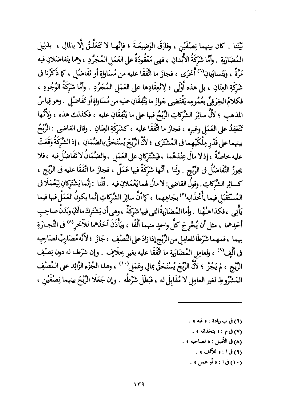 بَيْنَنا. كان بينهما نِصْفَيْنِ، وفارَقَ الوَضِيعَةَ؛ فإنَّها لا تَتَعَلَّقُ إلَّا بالمالِ، بدَلِيلِ المُضَارَبةِ. وأمَّا شَرِكَةُ الأَبْدانِ، فهى مَعْقُودَةٌ على العَمَلِ المُجَرَّدِ، وهما يتَفاضَلانِ فيه مَرةً، ويَتَساوَيانِ (٦) أُخْرَى، فجازَ ما اتَّفَقَا عليه من مُسَاواةٍ أو تَفَاضُلٍ، كما ذَكَرْنا في شَرِكَةِ العِنَانِ، بل هذه أَوْلَى؛ لِانْعِقَادِها على العَمَلِ المُجَرَّدِ. وأمَّا شَرِكَةُ الوُجُوهِ، فكلامُ الخِرَقِىِّ بعُمُومِه يَقْتَضِى جَوازَ ما يَتَّفِقَانِ عليه من مُسَاواةٍ أو تَفَاضُلٍ. وهو قِياسُ المذهبِ؛ لأنَّ سائِرَ الشَّرِكاتِ الرِّبْحُ فيها على ما يَتَّفِقَانِ عليه، فكذلك هذه، ولأنَّها تَنْعَقِدُ على العَمَلِ وغيرِه، فجازَ ما اتَّفَقَا عليه، كشَرِكَةِ العِنَانِ. وقال القاضي: الرِّبْحُ بينهما على قَدْرِ مِلكَيْهِما في المُشْتَرَى؛ لأنَّ الرِّبْحَ يُسْتَحَقُّ بالضَّمَانِ، إذ الشَّرِكَةُ وَقَعَتْ عليه خاصَّةً، إذ لا مالَ عِنْدَهُما، فيَشْتَرِكانِ على العَمَلِ، والضَّمَانُ لا تَفَاضُلَ فيه، فلا يجوزُ التَّفَاضُلُ في الرِّبْحِ. ولَنا، أنَّها شَرِكَةٌ فيها عَمَلٌ، فجازَ ما اتَّفَقَا عليه في الرِّبْحِ، كسائِر الشَّرِكاتِ. وقولُ القاضي: لا مالَ لهما يَعْمَلانِ فيه. قُلْنا: إنَّما يَشْتَرِكانِ لِيَعْمَلَا في المُسْتَقْبَلِ فيما يأْخُذَانِه (٧) بجَاهِهما، كما أنَّ سائِرَ الشَّرِكاتِ إنَّما يكونُ العَمَلُ فيها فيما يَأْتِى، فكذا ههُنا. وأما المُضَارَبةُ التي فيها شَرِكَةٌ، وهى أن يَشْتَرِكَ مالَانِ وبَدَنُ صاحِبِ أحَدِهما، مثل أن يُخْرِجَ كلُّ واحدٍ منهما ألْفًا، ويَأْذَنَ أحَدُهما للآخَرِ (٨) في التِّجارَةِ بهما، فمهما شَرَطَا للعامِلِ من الرِّبْحِ إذا زادَ على النِّصْفِ، جَازَ؛ لأنَّه مُضَارِبٌ لصَاحِبِه في ألْفٍ (٩)، ولعامِلِ المُضَارَبةِ ما اتَّفَقَا عليه بغيرِ خِلَافٍ. وإن شَرَطا له دون نِصْفِ الرِّبْحِ، لم يَجُزْ؛ لأنَّ الرِّبْحَ يُسْتَحَقُّ بمالٍ وعَمَلٍ (١٠)، وهذا الجُزْء الزَّائِد على النِّصْفِ المَشْرُوطِ لغير العامِلِ لا مُقَابِلَ له، فبَطَلَ شَرْطُه. وإن جَعَلَا الرِّبْحَ بينهما نِصْفَيْنِ،