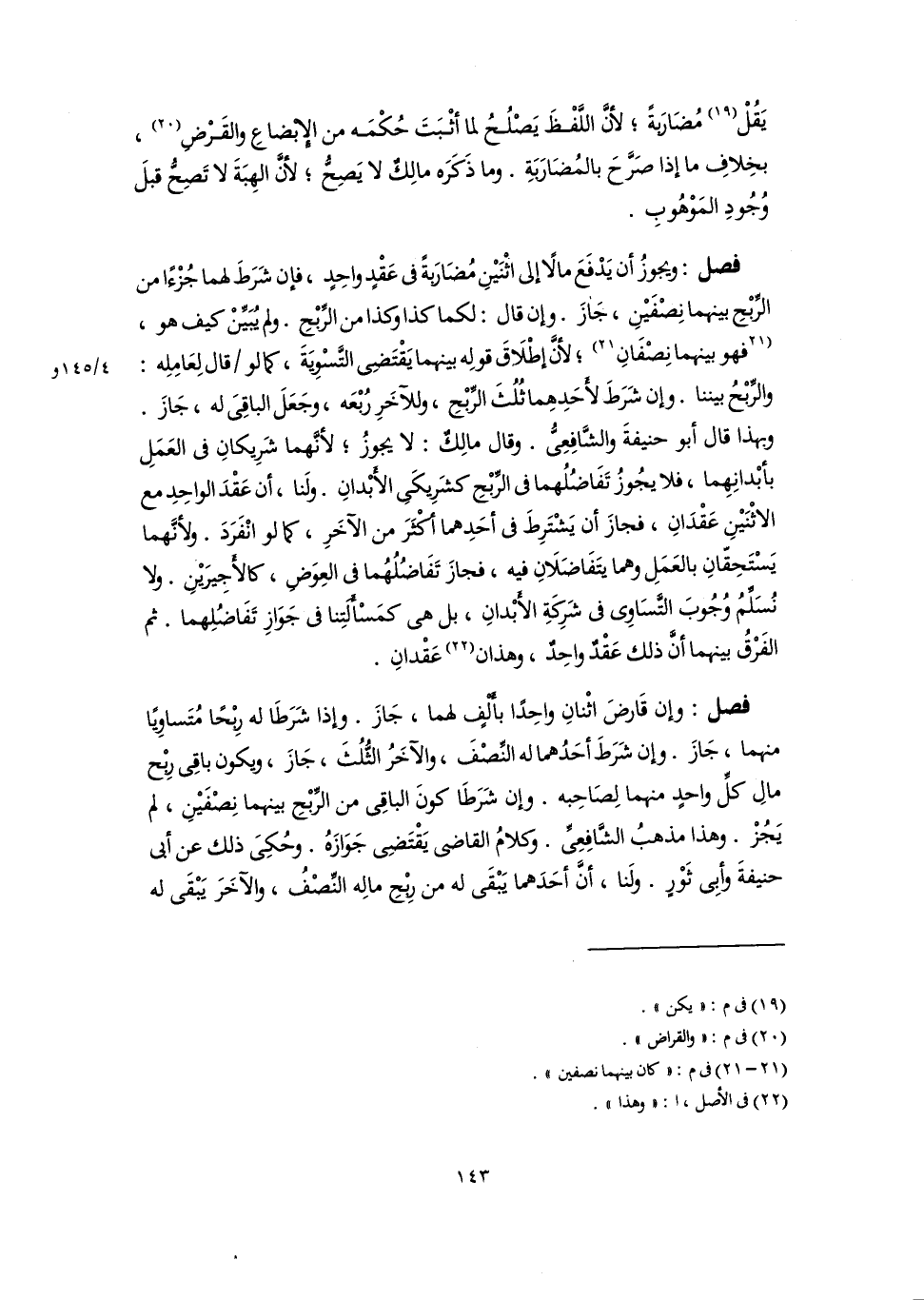 فصل: ويجوزُ أن يَدْفَعَ مالًا إلى اثْنَيْنِ مُضَارَبةً في عَقْدٍ واحِدٍ، فإن شَرَطَ لهما جُزْءًا من الرِّبْحِ بينهما نِصْفَيْنِ، جَازَ. وإن قال: لكما كذا وكذا من الرِّبْحِ. ولم يُبَيِّنْ كيف هو، [فهو بينهما نِصْفَانِ] (٢١)؛ لأنَّ إطْلَاقَ قولِه بينهما يَقْتَضِى التَّسْوِيَةَ، كما لو قال لِعَامِلِه: والرِّبْحُ بيننا. وإن شَرَطَ لأَحَدِهِما ثُلُثَ الرِّبْحِ، وللآخَرِ رُبْعَه، وجَعَلَ الباقِىَ له، جَازَ. وبهذا قال أبو حنيفةَ والشَّافِعِىُّ. وقال مالِكٌ: لا يجوزُ؛ لأنَّهما شَرِيكانِ في العَمَلِ بأبْدانِهِما، فلا يجُوزُ تَفَاضُلُهما في الرِّبْحِ كشَرِيكَىِ الأَبْدانِ. ولَنا، أن عَقْدَ الواحِدِ مع الاثْنَيْنِ عَقْدَانِ، فجازَ أن يَشْتَرِطَ في أحَدِهما أكْثَرَ من الآخَرِ، كما لو انْفَرَدَ. ولأنَّهما يَسْتَحِقّانِ بالعَمَلِ وهما يتَفَاضَلَانِ فيه، فجازَ تَفَاضُلُهُما في العِوَضِ، كالأَجِيرَيْنِ. ولا نُسَلِّمُ وُجُوبَ التَّسَاوِى في شَرِكَةِ الأَبْدانِ، بل هي كمَسْأَلَتِنا في جَوَازِ تَفَاضُلِهما. ثم الفَرْقُ بينهما أنَّ ذلك عَقْدٌ واحِدٌ، وهذان (٢٢) عَقْدانِ.