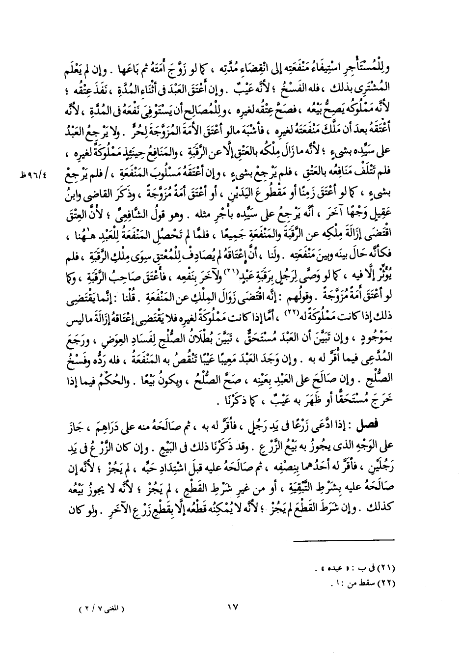 ولِلْمُسْتَأْجِرِ اسْتِيفَاءُ مَنْفَعَتِه إلى انْقِضَاءِ مُدَّتِه، كما لو زَوَّجَ أَمَتَهُ ثم بَاعَها. وإن لم يَعْلَم المُشْتَرِى بذلك، فله الفَسْخُ؛ لأنَّه عَيْبٌ. وإن أَعْتَقَ العَبْدَ فى أثْنَاءِ المُدَّةِ، نَفَذَ عِتْقُه؛ لأنَّه مَمْلُوكُه يَصِحُّ بَيْعُه، فصَحَّ عِتْقُه لغيرِه، ولِلْمُصَالِحِ أن يَسْتَوْفِىَ نَفْعَهُ فى المُدَّةِ؛ لأنَّه أعْتَقَهُ بعدَ أن مَلَّكَ مَنْفَعَتَهُ لغيرِه، فأشْبَهَ ما لو أعْتَقَ الأمَةَ المُزَوَّجَةَ لِحُرٍّ. ولا يَرْجِعُ العَبْدُ على سَيِّدِه بشىءٍ؛ لأنَّه ما زَالَ مِلْكُه بالعَتْقِ إلَّا عن الرَّقَبَةِ، والمَنَافِعُ حِينَئِذٍ مَمْلُوكَةٌ لغيرِه، فلم تَتْلَفْ مَنَافِعُه بالعَتْقِ، فلم يَرْجِعْ بشىءٍ، وإن أعْتَقَهُ مَسْلُوبَ المَنْفَعَةِ، فلم يَرْجِعْ بشىءٍ، كما لو أعْتَقَ زَمِنًا أو مَقْطُوعَ اليَدَيْنِ، أو أعْتَقَ أمَةً مُزَوَّجَةً، وذَكَرَ القاضى وابنُ عَقِيلٍ وَجْهًا آخَرَ، أنَّه يَرْجِعُ على سَيِّده بأَجْرِ مثله. وهو قولُ الشَّافِعِىِّ؛ لأَنَّ العِتْقَ اقْتَضَى إزَالَةَ مِلْكِه عن الرَّقَبَةِ والمَنْفَعَةِ جَمِيعًا، فلمَّا لم تَحْصُلِ المَنْفَعَةُ لِلْعَبْدِ هاهُنا، فكأنَّه حَالَ بينَه وبينَ مَنْفَعَتِه. ولَنا، أنَّ إِعْتَاقَهُ لم يُصَادِفْ لِلْمُعْتقِ سِوَى مِلْكِ الرَّقَبَةِ، فلم يُؤَثِّرْ إلَّا فيه، كما لو وَصَّى لِرَجُلٍ بِرَقَبَةِ عَبْدٍ (٢١) ولآخَرَ بِنَفْعِه، فأَعْتَقَ صَاحِبُ الرَّقَبَةِ، وكما لو أعْتَقَ أَمَةً مُزَوَّجَةً. وقولُهم: إنَّه اقْتَضَى زَوَالَ المِلْكِ عن المَنْفَعَةِ. قُلْنا: إنَّما يَقْتَضِى ذلك إذا كانت مَمْلُوكَةً له (٢٢)، أمَّا إذا كانت مَمْلُوكَةً لغيرِه فلا يَقْتَضِى إعْتَاقهُ إزَالَةَ ما ليس بمَوْجُودٍ، وإن تَبَيَّنَ أن العَبْدَ مُسْتَحَقٌّ، تَبَيَّنَ بُطْلَانُ الصُّلْحِ لِفَسَادِ العِوَضِ، ورَجَعَ المُدَّعِى فيما أَقَرَّ له به. وإن وَجَدَ العَبْدَ مَعِيبًا عَيْبًا تَنْقُصُ به المَنْفَعَةُ، فله رَدُّه وفَسْخُ الصُّلْحِ. وإن صَالَحَ على العَبْدِ بِعَيْنِه، صَحَّ الصُّلْحُ، ويكونُ بَيْعًا. والحُكْمُ فيما إذا خَرَجَ مُسْتَحَقًّا أو ظهَرَ به عَيْبٌ، كما ذكَرْنَا.