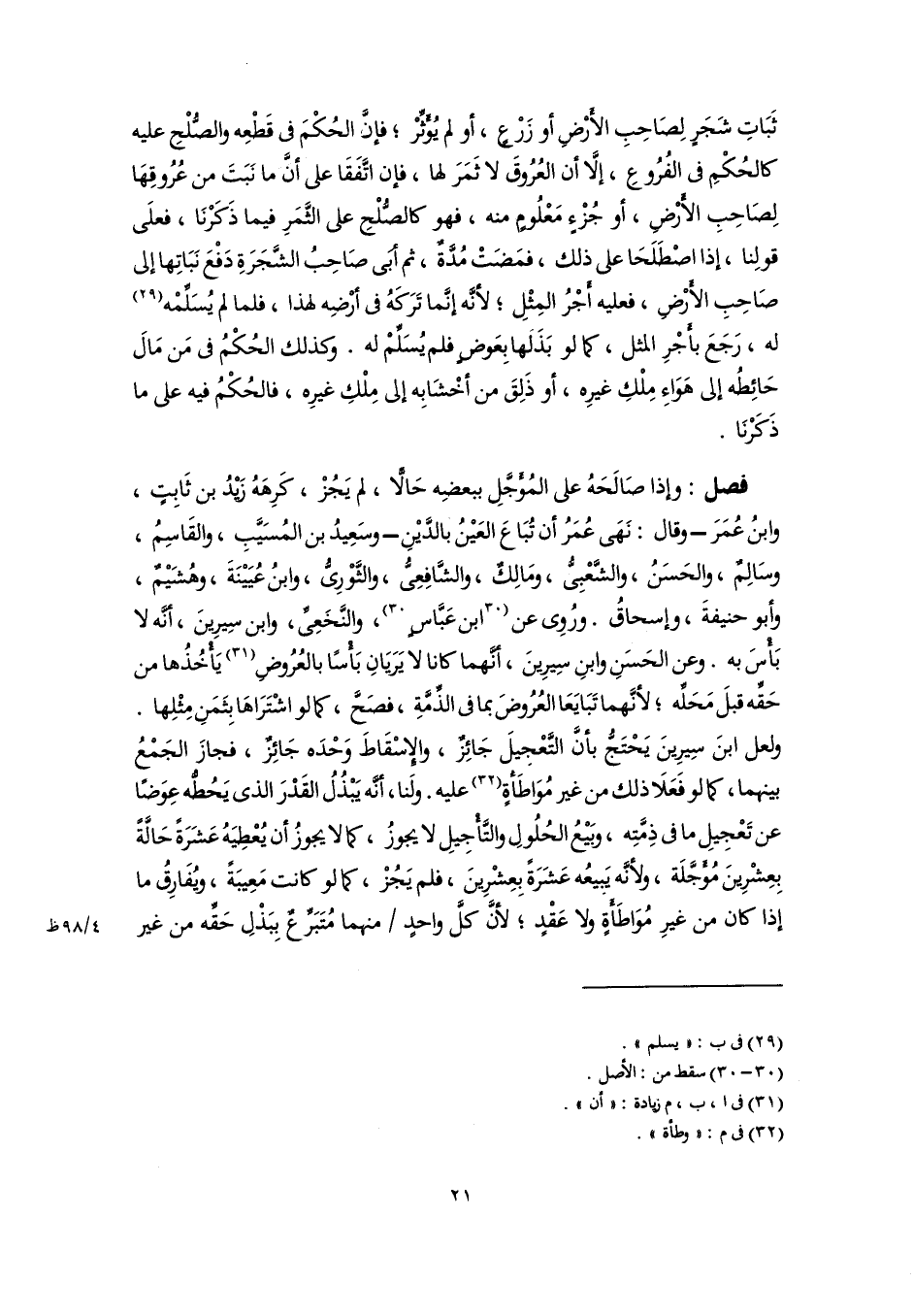 فصل: وإذا صَالَحَهُ على المُؤَجَّلِ ببعضِه حَالًّا، لم يَجُزْ، كَرِهَهُ زَيْدُ بن ثَابِتٍ، وابنُ عُمَرَ -وقال: نَهَى عُمَرُ أن تُبَاعَ العَيْنُ بالدَّيْنِ- وسَعِيدُ بن المُسَيَّبِ، والقَاسِمُ، وسَالِمٌ، والحَسَنُ، والشَّعْبِىُّ، ومَالِكٌ، والشَّافِعِىُّ، والثَّوْرِيُّ، وابنُ عُيَيْنَةَ، وهُشَيْمٌ، وأبو حنيفةَ، وإسحاقُ. ورُوِى عن [ابن عَبَّاسٍ] (٣٠)، والنَّخَعِىِّ، وابن سِيرِينَ، أنَّه لا بَأْسَ به. وعن الحَسَنِ وابنِ سِيرِينَ، أنَّهما كانا لا يَرَيَانِ بَأْسًا بالعُرُوضِ (٣١) يَأْخُذُها من حَقِّه قبلَ مَحَلِّه؛ لأنَّهما تَبَايَعَا العُرُوضَ بما فى الذِّمَّةِ، فصَحَّ، كما لو اشْتَرَاهَا بِثَمَنِ مِثْلِها. ولعل ابنَ سِيرِينَ يَحْتَجُّ بأنَّ التَّعْجيلَ جَائِزٌ، والإِسْقَاطَ وَحْدَه جَائِزٌ، فجازَ الجَمْعُ بينهما، كما لو فَعَلَا ذلك من غير مُوَاطَأةٍ (٣٢) عليه. ولَنا، أنّه يَبْذُلُ القَدْرَ الذى يَحُطُّه عِوَضًا عن تَعْجِيلِ ما فى ذِمَّتِه، وبَيْعُ الحُلُولِ والتَّأْجِيلِ لا يجوزُ، كما لا يجوزُ أن يُعْطِيَهُ عَشَرَةً حَالَّةً بِعِشْرِينَ مُؤَجَّلَة، ولأنَّه يَبيعُه عَشَرَةً بِعِشْرِينَ، فلم يَجُزْ، كما لو كانت مَعِيبَةً، ويُفَارِقُ ما إذا كان من غيرِ مُوَاطَأَةٍ ولا عَقْدٍ؛ لأنَّ كلَّ واحدٍ منهما مُتَبَرِّعٌ بِبَذْلِ حَقِّه من غير