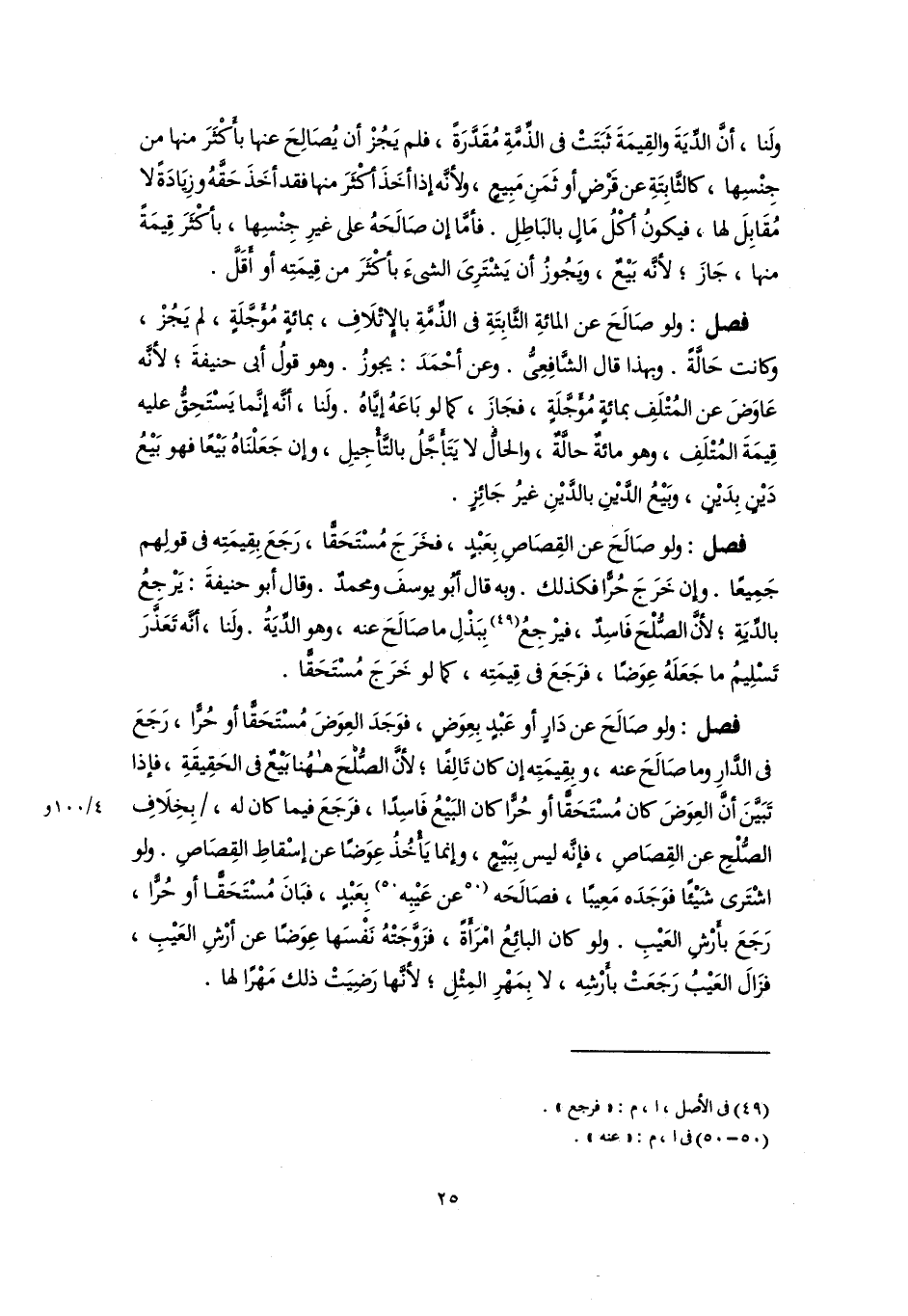 فصل: ولو صَالَحَ عن دَارٍ أو عَبْدٍ بِعِوَضٍ، فوَجَدَ العِوَضَ مُسْتَحَقًّا أو حُرًّا، رَجَعَ فى الدَّارِ وما صَالَحَ عنه، وبقِيمَتِه إن كان تَالِفًا؛ لأنَّ الصُّلحَ هاهُنا بَيْعٌ فى الحَقِيقَةِ، فإذا تَبَيَّنَ أنَّ العِوَضَ كان مُسْتَحَقًّا أو حُرًّا كان البَيْعُ فَاسِدًا، فرَجَعَ فيما كان له، بِخِلَافِ الصُّلْحِ عن القِصَاصِ، فإنَّه ليس بِبَيْعٍ، وإنما يَأْخُذُ عِوَضًا عن إسْقاطِ القِصَاصِ. ولو اشْتَرى شَيْئًا فوَجَدَه مَعِيبًا، فصَالَحَه [عن عَيْبِه] (٥٠) بِعَبْدٍ، فبَانَ مُسْتَحَقًّا أو حُرًّا، رَجَعَ بأَرْشِ العَيْبِ. ولو كان البائِعُ امْرأَةً، فزَوَّجَتْهُ نَفْسَها عِوَضًا عن أرْشِ العَيْبِ، فزَالَ العَيْبُ رَجَعَتْ بأَرْشِه، لا بِمَهْرِ المِثْلِ؛ لأنَّها رَضِيَتْ ذلك مَهْرًا لها.