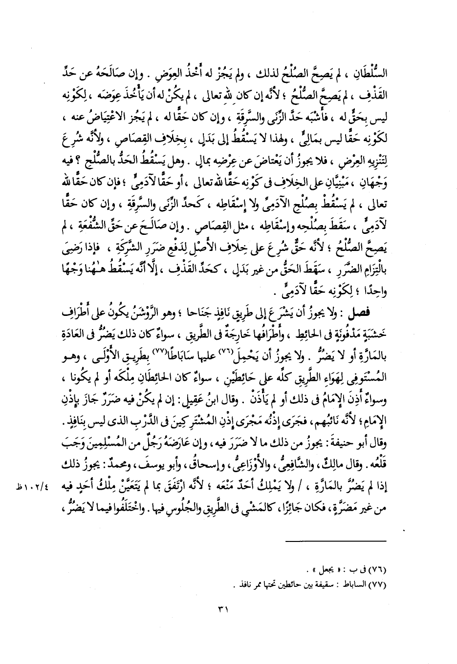 السُّلْطَانِ، لم يَصِحَّ الصُلْحُ لذلك، ولم يَجُزْ له أخْذُ العِوَضِ. وإن صَالَحَهُ عن حَدِّ القَذْفِ، لم يَصِحَّ الصُّلْحُ؛ لأنَّه إن كانِ للهِ تعالى، لم يكُنْ له أن يَأْخُذَ عِوَضَه، لِكَوْنِه ليس بِحَقٍّ له، فأَشْبَه حَدَّ الزِّنَى والسَّرِقَةِ، وإن كان حَقًّا له، لم يَجُز الاعْتِيَاضُ عنه، لكَوْنِه حَقًّا ليس بمَالِىٍّ، ولهذا لا يَسْقُطُ إلى بَدَلٍ، بِخِلَافِ القِصَاصِ، ولأنَّه شُرِعَ لِتَنْزِيهِ العِرْضِ، فلا يجوزُ أن يَعْتاضَ عن عِرْضِه بمالٍ. وهل يَسْقُطُ الحَدُّ بالصُّلْحِ؛ فيه وَجْهَانِ، مَبْنِيَّانِ على الخِلَافِ فى كَوْنِه حَقًّا للَّه تعالى، أو حَقًّا لآدَمِىٍّ؛ فإن كان حَقًّا للَّه تعالى، لم يَسْقُطْ بِصُلْحِ الآدَمِىِّ ولا إسْقَاطِه، كَحدِّ الزِّنَى والسَّرِقَةِ، وإن كان حَقًّا لآدَمِىٍّ، سَقَطَ بِصُلْحِه وإسْقَاطِه، مثل القِصَاصِ. وإن صَالَحَ عن حَقِّ الشُّفْعَةِ، لم يَصِحَّ الصُّلْحُ، لأنَّه حَقٌّ شُرِعَ على خِلَافِ الأصْلِ لِدَفْعِ ضَرَرِ الشَّرِكَةِ، فإذا رَضِىَ بالْتِزَامِ الضَّرَرِ، سَقَطَ الحَقُّ من غير بَدَلٍ، كحَدِّ القَذْفِ، إلَّا أنَّه يَسْقُطُ هاهُنا وَجْهًا واحِدًا؛ لِكَوْنِه حَقًّا لآدَمِىٍّ.