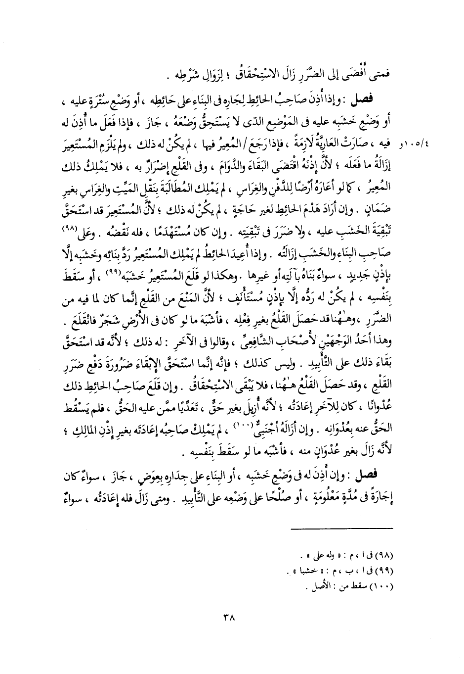 فصل: وإذا أَذِنَ صَاحِبُ الحائِطِ لِجَارِه فى البِنَاءِ على حَائِطِه، أو وَضْعِ سُتْرَةٍ عليه، أو وَضْعِ خَشَبِه عليه فى المَوْضِع الذى لا يَسْتَحِقُّ وَضْعَهُ، جَازَ، فإذا فَعَلَ ما أُذِنَ له فيه، صَارَت العَارِيَّةُ لَازِمَةً، فإذا رَجَعَ المُعِيرُ فيها، لم يكُنْ له ذلك، ولم يَلْزَمِ المُسْتَعِيرَ إزَالَةُ ما فَعَلَه؛ لأنَّ إِذْنَهُ اقْتَضَى البَقَاءَ والدَّوَامَ، وفى القَلْعِ إِضْرَارٌ به، فلا يَمْلِكُ ذلك المُعِيرُ، كما لو أعَارَهُ أرْضًا لِلدَّفْنِ والغِرَاسِ، لم يَمْلِك المُطَالَبَةَ بِنَقْلِ المَيِّتِ والغِرَاس بغيرِ ضَمَانٍ. وإن أرَادَ هَدْمَ الحائِطِ لغير حَاجَةٍ، لم يكُنْ له ذلك؛ لأنَّ المُسْتَعِيرَ قد اسْتَحَقَّ تَبْقِيَةَ الخَشَبِ عليه، ولا ضَرَرَ فى تَبْقِيَتِه. وإن كان مُسْتَهْدَمًا، فله نَقْضُه. وعَلى (٩٨) صَاحِبِ البِنَاءِ والخَشَبِ إزَالَتُه. وإذا أُعِيدَ الحائِطُ لم يَمْلِك المُسْتَعِيرُ رَدَّ بِنَائِه وخَشَبِه إلَّا بإِذْنٍ جَدِيدٍ، سواءٌ بَنَاهُ بآلَتِه أو غيرِها. وهكذا لو قَلَعَ المُسْتَعِيرُ خَشَبَه (٩٩)، أو سَقَطَ بِنَفْسِه، لم يكُنْ له رَدُّه إلَّا بإِذْنٍ مُسْتَأْنَفٍ؛ لأنَّ المَنْعَ من القَلْعِ إنَّما كان لما فيه من الضَّرَرِ، وهاهُنا قد حَصَلَ القَلْعُ بغيرِ فِعْلِه، فأشْبَهَ ما لو كان فى الأَرْضِ شَجَرٌ فانْقَلَعَ. وهذا أحَدُ الوَجْهَيْنِ لأَصْحَابِ الشَّافِعِىِّ، وقالوا فى الآخَرِ: له ذلك؛ لأنَّه قد اسْتَحَقَّ بَقَاءَ ذلك على التَّأْبِيدِ. وليس كذلك؛ فإنَّه إنَّما اسْتَحَقَّ الإبقَاءَ ضَرُورَةَ دَفْعِ ضَرَرِ القَلْعِ، وقد حَصَلَ القَلْعُ هاهُنا، فلا يَبْقَى الاسْتِحْقَاقُ. وإن قَلَعَ صَاحِبُ الحائِطِ ذلك عُدْوانًا، كان لِلآخَرِ إعَادَتُه؛ لأنَّه أُزِيلَ بغير حَقًّ، تَعَدِّيًا ممَّن عليه الحَقُّ، فلم يَسْقُط الحَقُّ عنه بِعُدْوَانِه. وإن اُزالَهُ أجْنَبِىٌّ (١٠٠)، لم يَمْلِكْ صَاحِبُه إعَادَتَه بغيرِ إذْنِ المالِكِ؛ لأنَّه زَالَ بغير عُدْوَانٍ منه، فأشْبَه ما لو سَقَطَ بِنَفْسِه.