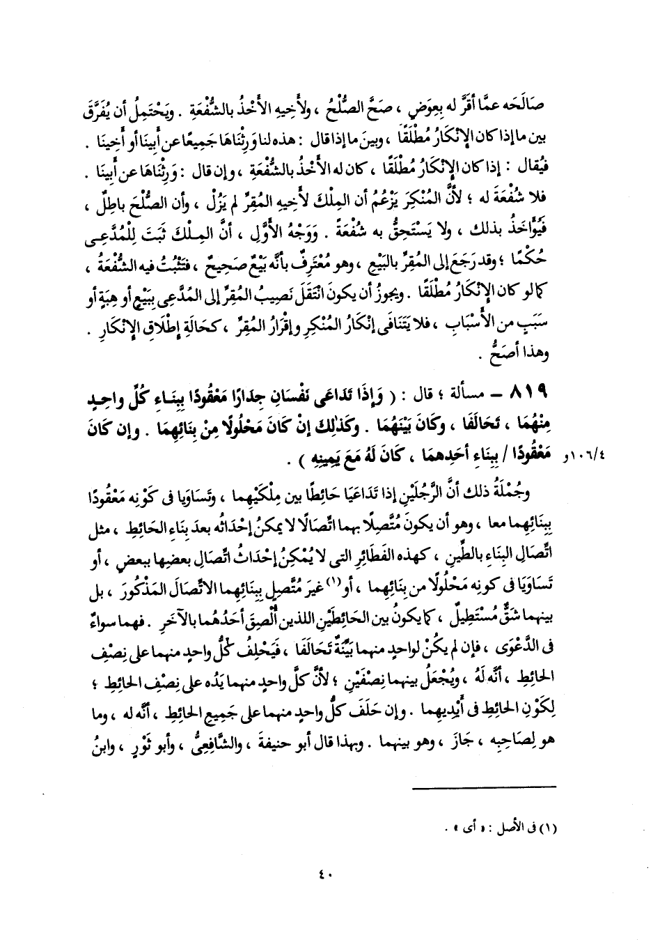 وجُمْلَةُ ذلك أنَّ الرَّجُلَيْنِ إذا تَدَاعَيَا حَائِطًا بين مِلْكَيْهِما، وتَسَاوَيا فى كَوْنِه مَعْقُودًا بِبِنَائِهِما معا، وهو أن يكونَ مُتَّصِلًا بهما اتِّصَالًا لا يمكنُ إحْدَاثُه بعدَ بِنَاءِ الحَائِطِ، مثل اتِّصَالِ البِنَاءِ بالطِّينِ، كهذه الفَطَائِرِ التى لا يُمْكِنُ إحْدَاثُ اتِّصَالِ بعضِها ببعضٍ، أو تَسَاوَيَا فى كونِه مَحْلُولًا من بِنَائِهِما، أو (١) غيرَ مُتَّصِلٍ بِبِنَائِهِما الاتِّصَالَ المَذْكُورَ، بل بينهما شَقُّ مُسْتَطِيلٌ، كما يكونُ بين الحَائِطَيْنِ اللذين أُلْصِقَ أحَدُهُما بالآخَرِ. فهما سواءٌ فى الدَّعْوَى، فإن لم يكُنْ لواحدٍ منهما بَيِّنَةٌ تَحَالَفَا، فَيَحْلِفُ كُلُّ واحدٍ منهما على نِصْفِ الحائِطِ، أنَّه لَهُ، ويُجْعَلُ بينهما نِصْفَيْنِ؛ لأنَّ كلَّ واحدٍ منهما يَدُه على نِصْفِ الحائِطِ؛ لِكَوْنِ الحائِطِ فى أَيْديهِما. وإن حَلَفَ كلُّ واحدٍ منهما على جَمِيعِ الحائِطِ، أنَّه له، وما هو لِصَاحِبِه، جَازَ، وهو بينهما. وبهذا قال أبو حنيفةَ، والشَّافِعِىُّ، وأبو ثَوْرٍ، وابنُ