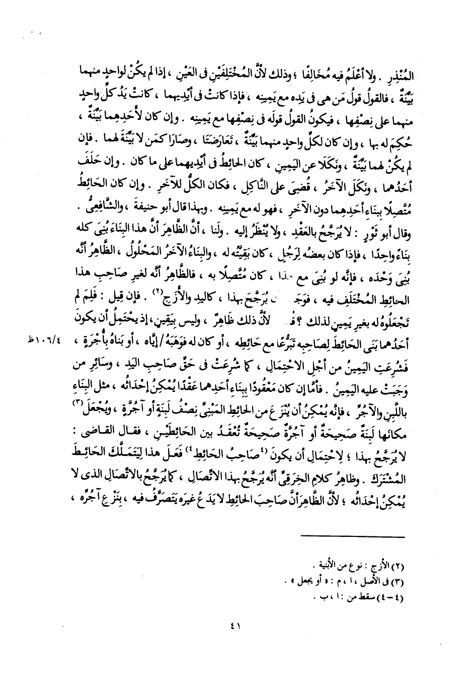 المُنْذِرِ. ولا أعْلَمُ فيه مُخَالِفًا؛ وذلك لأنَّ المُخْتَلِفَيْنِ فى العَيْنِ، إذا لم يكُنْ لواحدٍ منهما بَيِّنَةٌ، فالقولُ قولُ مَن هى فى يَدِه مع يَمِينِه، فإذا كانتْ فى أيْدِيهما، كانتْ يَدُ كلِّ واحدٍ منهما على نِصْفِها، فيكونُ القولُ قولَه فى نِصْفِها مع يَمِينِه. وإن كان لأَحَدِهِما بَيِّنَةٌ، حُكِمَ له بها، وإن كان لكلِّ واحدٍ منهما بَيِّنَةٌ، تَعَارَضَتَا، وصَارَا كمَن لا بَيِّنَةَ لهما. فإن لم يكُنْ لهما بَيِّنَةٌ، ونَكَلَا عن اليَمِينِ، كان الحائِطُ فى أيْدِيهما على ما كان. وإن حَلَفَ أحَدُهما، ونَكَلَ الآخَرُ، قُضِىَ على النَّاكِلِ، فكان الكلُّ للآخَرِ. وإن كان الحَائِطُ مُتَّصِلًا بِبنَاءِ أحَدِهِما دون الآخَرِ، فهو له مع يَمِينِه. وبهذا قال أبو حنيفةَ، والشَّافِعِىُّ. وقال أبو ثَوْرٍ: لا يُرَجَّحُ بالعَقْدِ، ولا يُنْظَرُ إليه. ولَنا، أنَّ الظَّاهِرَ أنَّ هذا البِنَاءَ بُنِىَ كله بِنَاءً واحِدًا، فإذا كان بعضُه لِرَجُلٍ، كان بَقِيَّتُه له، والبِنَاءُ الآخَرُ المَحْلُولُ، الظَّاهِرُ أنَّه بُنِىَ وَحْدَه، فإنَّه لو بُنِىَ مع هذا، كان مُتَّصِلًا به، فالظَّاهِرُ أنَّه لغيرِ صَاحِبِ هذا الحائِطِ المُخْتَلَفِ فيه، فوَجَد مَن يُرَجَّحَ بهذا، كاليدِ والأزَجِ (٢). فإن قِيل: فَلِمَ لم تَجْعَلُوهُ له بغيرِ يَمِينٍ لذلك؟ قُلنا: لأنَّ ذلك ظَاهِرٌ، وليس بِيَقِينٍ، إذ يحْتَمِلُ أن يكونَ أحَدُهما بَنَى الحَائِطَ لِصَاحِبِه تَبَرُّعًا مع حَائِطِه، أو كان له فوَهَبَهُ إيَّاه، أو بَناهُ بِأُجْرَةٍ، فَشُرِعَتِ اليَمِينُ من أجْلِ الاحْتِمَالِ، كما شُرِعَتْ فى حَقِّ صَاحِبِ اليَدِ، وسَائِرِ من وَجَبَتْ عليه اليَمِينُ. فأمَّا إن كان مَعْقُودًا بِبِنَاءِ أحَدِهما عَقْدًا يُمْكِنُ إحْدَاثُه، مثل البِنَاءِ باللَّبِنِ والآجُرِّ، فإنَّه يُمْكِنُ أن يُنْزَعَ من الحائِطِ المَبْنِىِّ نِصْفُ لَبِنَةٍ أو آجُرَّةٍ، ويُجْعَلَ (٣) مكانَها لَبِنَةٌ صَحِيحَةٌ أو آجُرَّةٌ صَحِيحَةٌ تُعْقَدُ بين الحَائِطَيْنِ، فقال القاضى: لا يُرَجَّحُ بهذا؛ لِاحْتِمَالِ أن يكونَ [صَاحِبُ الحَائِطِ] (٤) فَعَلَ هذا لِيَتَمَلَّكَ الحَائِطَ المُشْتَرَكَ. وظاهِرُ كلامِ الخِرَقِىِّ أنَّه يُرَجَّحُ بهذا الاتِّصَالِ، كما يُرَجَّحُ بالاتِّصَالِ الذى لا يُمْكِنُ إحْدَاثُه؛ لأنَّ الظَّاهِرَ أنَّ صَاحِبَ الحائِطِ لا يَدَعُ غيرَه يَتَصَرَّفُ فيه، بِنَزْعِ آجُرِّه،