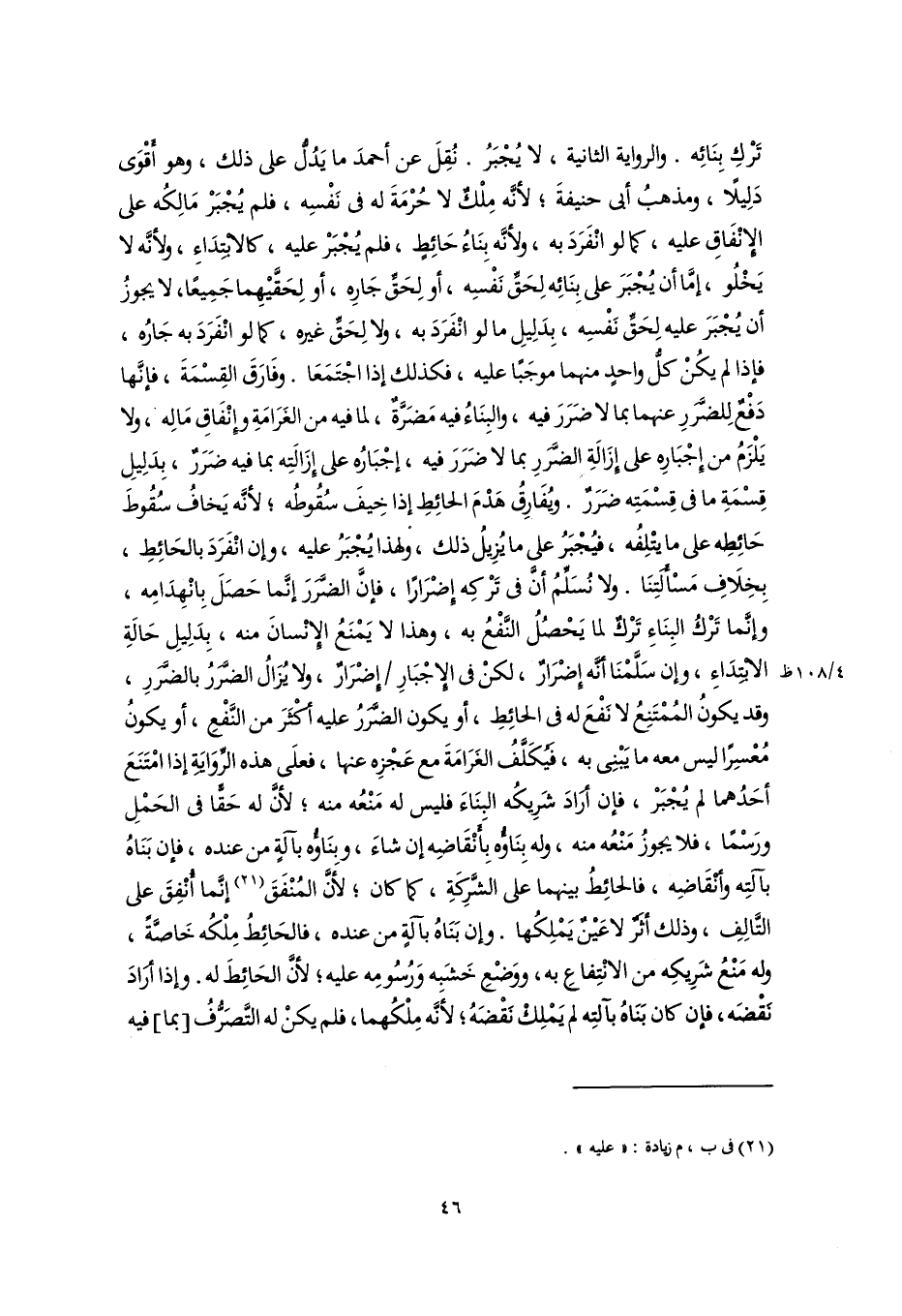 تَرْكِ بِنَائِه. والرواية الثانية، لا يُجْبَرُ. نُقِلَ عن أحمدَ ما يَدُلُّ على ذلك، وهو أقْوَى دَلِيلًا، ومذهبُ أبى حنيفةَ؛ لأنَّه مِلْكٌ لا حُرْمَةَ له في نَفْسِه، فلم يُجْبَرْ مَالِكُه على الإِنْفَاقِ عليه، كما لو انْفَرَدَ به، ولأنَّه بِنَاءُ حَائِطٍ، فلم يُجْبَرْ عليه، كالابْتِدَاءِ، ولأنَّه لا يَخْلُو، إمَّا أن يُجْبَرَ على بِنَائِه لِحَقِّ نَفْسِه، أو لِحَقِّ جَارِه، أو لِحَقَّيْهِما جَمِيعًا، لا يجوزُ أن يُجْبَرَ عليه لِحَقِّ نَفْسِه، بِدَلِيلِ ما لو انْفَرَدَ به، ولا لِحَقِّ غيره, كما لو انْفَرَدَ به جَارُه، فإذا لم يكُنْ كلُّ واحدٍ منهما موجَبًا عليه، فكذلك إذا اجْتَمَعَا. وفَارَقَ القِسْمَةَ، فإنَّها دَفْعٌ لِلضَّرَرِ عنهما بما لا ضَرَرَ فيه، والباءُ فيه مَضَرَّةٌ، لما فيه من الغَرَامَةِ وإِنْفَاقِ مَالِه، ولا يَلْزَمُ من إِجْبَارِه على إِزَالَةِ الضَّرَرِ بما لا ضَرَرَ فيه، إجْبَارُه على إِزَالَتِه بما فيه ضَرَرٌ، بِدَلِيلِ قِسْمَةِ ما في قِسْمَتِه ضَرَرٌ. ويُفَارِقُ هَدْمَ الحائِطِ إذا خِيفَ سُقُوطُه؛ لأنَّه يَخافُ سُقُوطَ حَائِطِه على ما يتْلِفُه، فيُجْبَرُ على ما يُزِيلُ ذلك، ولهذا يُجْبَرُ عليه، وإن انْفَرَدَ بالحَائِطِ، بِخِلَافِ مَسْأَلَتِنَا. ولا نُسَلِّمُ أن في تَرْكِه إِضْرَارًا، فإنَّ الضَّرَرِ إنَّما حَصَلَ بِانْهِدَامِه، وإنَّما تَرْكُ البِنَاءِ تَرْكٌ لما يَحْصُلُ النَّفْعُ به، وهذا لا يَمْنَعُ الإِنْسانَ منه، بِدَلِيلِ حَالَةِ الابْتِدَاءِ، وإن سَلَّمْنَا أنَّه إِضْرَارٌ، لكنْ في الإِجْبَارِ إضْرَارٌ، ولا يُزَالُ الضَّرَرُ بالضَّرَرِ، وقد يكونُ المُمْتَنِعُ لا نَفْعَ له في الحائِطِ، أو يكون الضَّرَرُ عليه أكْثَرَ من النَّفْعِ، أو يكونُ مُعْسِرًا ليس معه ما يَبْنِى به، فَيُكَلَّفُ الغَرَامَةَ مع عَجْزِه عنها، فعلَى هذه الرِّوَايَةِ إذا امْتَنَعَ أحَدُهما لم يُجْبَرْ، فإن أرَادَ شَرِيكُه البِنَاءَ فليس له مَنْعُه منه؛ لأنَّ له حَقًّا في الحَمْلِ ورَسْمًا، فلا يجوزُ مَنْعُه منه، وله بِنَاؤُه بِأَنْقَاضِه إن شاءَ، وبِنَاؤُه بآلَةٍ من عنده، فإن بَنَاهُ بآلَتِه وأنْقَاضِه، فالحائِطُ بينهما على الشَّرِكَةِ, كما كان؛ لأَنَّ المُنْفَقَ (٢١) إنَّما أُنْفِقَ على التَّالِفِ، وذلك أثَرٌ لا عَيْنٌ يَمْلِكُها. وإن بَنَاهُ بآلَةٍ من عنده، فالحَائِطُ مِلْكُه خَاصَّةً، وله مَنْعُ شَرِيكِه من الانْتِفاعِ به، ووَضْعِ خَشَبِه وَرُسُومِه عليه؛ لأنَّ الحَائِطَ له. وإذا أرَادَ نَقْضَه، فإن كان بَنَاهُ بآلتِه لم يَمْلِكْ نَقْضَهُ؛ لأنَّه مِلْكُهما، فلم يكنْ له التَّصَرُّفُ [بما] فيه