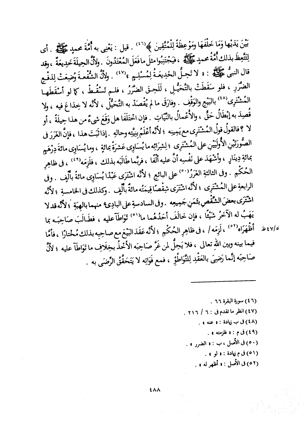 بَيْنَ يَدَيْهَا وَمَا خَلْفَهَا وَمَوْعِظَةً لِلْمُتَّقِينَ} (٤٦). قيل: يَعْنِى به أُمَّةَ محمدٍ -صلى اللَّه عليه وسلم-. أي لِتَتَّعِظَ بذلك أُمَّةُ محمدٍ -صلى اللَّه عليه وسلم-، فيَجْتَنِبُوا مثلَ ما فَعَلَ المُعْتَدُونَ. ولأنَّ الحِيلَةَ خَدِيعَةٌ، وقد قال النبيُّ -صلى اللَّه عليه وسلم-: "لا تَحِلُّ الخَدِيعَةُ لِمُسْلِمٍ" (٤٧). ولأنَّ الشُّفْعةَ وُضِعَتْ لِدَفْعِ الضَّرَرِ، فلو سَقَطَتْ بالتَّحَيُّلِ، لَلَحِقَ الضَّرَرُ، فلم تَسْقُطْ، كما لو أسْقَطَها المُشْتَرِى (٤٨) بالبَيْعِ والوَقْفِ. وفارَقَ ما لم يُقْصَدْ به التَّحَيُّلُ، لأنَّه لا خِدَاعَ فيه، ولا قُصِدَ به إبْطَالُ حَقٍّ، والأَعْمالُ بالنِّيَّاتِ. فإنْ اخْتَلَفَا هل وَقَعَ شيءٌ من هذا حِيلَةً، أو لا؟ فالقولُ قولُ المُشْتَرِى مع يَمِينِه؛ لأنَّه أعْلَمُ بِنِيَّتِه وحالهِ. إذا ثَبَتَ هذا، فإنَّ الغَرَرَ في الصُّورَتَيْنِ الأُولَيَيْنِ على المُشْتَرِى؛ لِشِرَائِه ما يُسَاوِى عَشرَةً بمائةٍ، وما يُسَاوِى مائةَ دِرْهَمٍ بمائةِ دِينَارٍ، وأشْهَدَ على نَفْسِه أنَّ عليه ألْفًا، فربَّما طَالَبَه بذلك، فلَزِمَه (٤٩)، في ظاهِرِ الحُكْمِ. وفى الثالثةِ الغَرَرُ (٥٠) على البائعِ؛ لأنَّه اشْتَرَى عَبْدًا يُسَاوِى مائةً بأَلْفٍ. وفى الرابعةِ على المُشْتَرِى؛ لأنَّه اشْتَرَى شِقْصًا قِيمَتُه مائةٌ بأَلْفٍ. وكذلك في الخامسةِ؛ لأنَّه اشْتَرَى بعضَ الشِّقْصِ بثَمَنِ جَمِيعِه. وفى السادسةِ على البادِئ منهما بالهِبَةِ؛ لأنَّه قد لا يَهَبُ له الآخَرُ شَيْئًا، فإن خَالَفَ أحَدُهُما ما (٥١) تَوَاطَآ عليه، فطَالَبَ صَاحِبَه بما أظْهَرَاه (٥٢)، لَزِمَه، في ظاهِرِ الحُكْمِ؛ لأنَّه عَقَدَ البَيْعَ مع صاحِبِه بذلك مُخْتارًا، فأمَّا فيما بينه وبين اللهِ تعالى، فلا يَحِلُّ لمن غَرَّ صَاحِبَه الأخْذُ بخِلَافِ ما تَوَاطَآ عليه؛ لأنَّ صَاحِبَه إنَّما رَضِىَ بالعَقْدِ لِلتَّوَاطُؤِ، فمع فَوَاتِه لا يَتَحَقَّقُ الرِّضَى به.