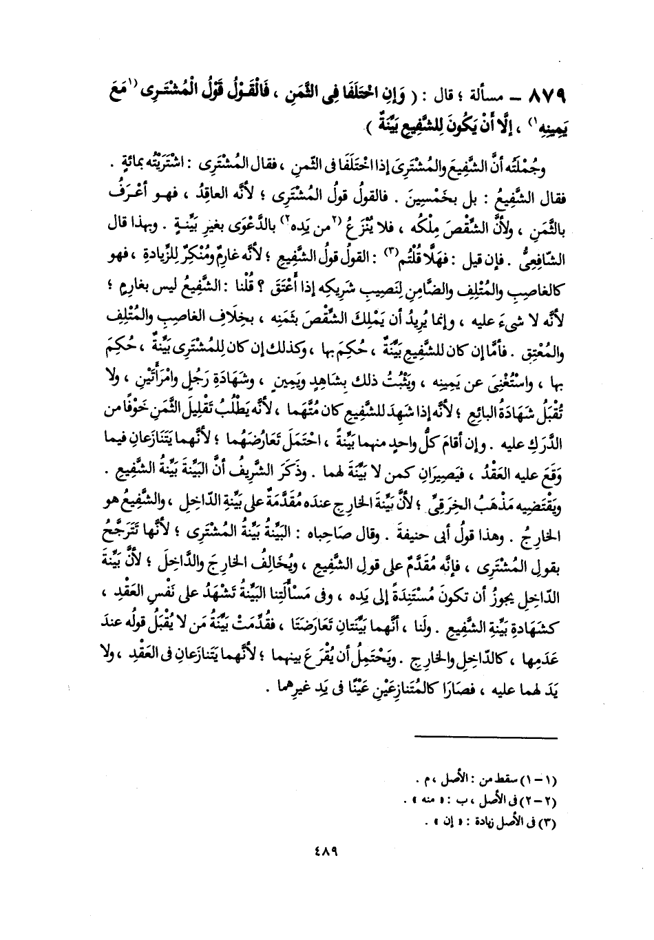 وجُمْلَتُه أنَّ الشَّفِيعَ والمُشْتَرِىَ إذا اخْتَلَفَا في الثَّمنِ، فقال المُشْتَرِى: اشْتَرَيْتُه بمائةٍ. فقال الشَّفِيعُ: بل بخَمْسِينَ. فالقولُ قولُ المُشْتَرِى؛ لأنَّه العاقِدُ، فهو أعْرَفُ بالثَّمَنِ، ولأنَّ الشِّقْصَ مِلْكُه، فلا يُنْزَعُ [من يَدِه] (٢) بالدَّعْوَى بغيرِ بِيِّنةٍ. وبهذا قال الشّافِعِىُّ. فإن قيل: فهَلَّا قُلْتُم (٣): القولُ قولُ الشَّفِيعِ؛ لأنَّه غارِمٌ ومُنكِرٌ لِلزِّيادةِ، فهو كالغاصِبِ والمُتْلِفِ والضَّامِنِ لِنَصِيبِ شَرِيكِه إذا أَعْتَقَ؟ قُلْنا: الشَّفِيعُ ليس بغارمٍ؛ لأنَّه لا شىءَ عليه، وإنما يُرِيدُ أن يَمْلِكَ الشِّقْصَ بثَمَنِه، بخِلَافِ الغاصِبِ والمُتلِفِ والمُعْتِقِ. فأمَّا إن كان للشَّفِيعِ بَيِّنَةٌ، حُكِمَ بها، وكذلك إن كان لِلمُشْتَرِى بَيِّنَةٌ، حُكِمَ بها، واسْتُغْنِىَ عن يَمِينِه، ويَثْبُتُ ذلك بِشَاهِدٍ ويَمِينٍ، وشَهَادَةِ رَجُلٍ وامْرَأَتَيْنِ، ولا تُقْبَلُ شَهَادَةُ البائِعِ؛ لأنَّه إذا شَهِدَ للشَّفِيعِ كان مُتَّهَما، لأنَّه يَطْلُبُ تَقْلِيلَ الثَّمَنِ خَوْفًا من الدَّرَكِ عليه. وان أقامَ كلُّ واحدٍ منهما بَيِّنَةً، احْتَمَلَ تَعَارُضَهُما؛ لأنَّهما يَتَنَازَعانِ فيما وَقَعَ عليه العَقْدُ، فيَصِيرَانِ كمن لا بَيِّنَةَ لهما. وذَكَرَ الشَّرِيفُ أنَّ البَيِّنَةَ بَيِّنةُ الشَّفِيعِ. ويَقْتَضِيه مَذْهَبُ الخِرَقِىِّ؛ لأنَّ بَيِّنَةَ الخارِجِ عندَه مُقَدَّمَةٌ على بَيِّنةِ الدَّاخِلِ، والشَّفِيعُ هو الخارِجُ. وهذا قولُ أبي حنيفةَ. وقال صَاحِباه: البَيِّنَةُ بَيِّنةُ المُشْتَرِى؛ لأنَّها تَتَرَجَّحُ بقولِ المُشْتَرِى، فإنَّه مُقَدَّمٌ على قولِ الشَّفِيعِ، ويُخَالِفُ الخارِجَ والدَّاخِلَ؛ لأنَّ بَيِّنةَ الدَّاخِلِ يجوزُ أن تكونَ مُسْتَنِدَةً إلى يَدِه، وفي مَسْأَلَتِنا البَيِّنةُ تَشْهَدُ على نَفْسِ العَقْدِ، كشَهَادةِ بَيِّنةِ الشَّفِيعِ. ولَنا، أنَّهما بَيِّنَتانِ تَعَارَضَتَا، فقُدِّمَتْ بَيِّنَةُ مَن لا يُقْبَلُ قولُه عندَ عَدَمِها، كالدّاخِلِ والخارِجِ. ويَحْتَمِلُ أن يُقْرَعَ بينهما؛ لأنَّهما يَتَنازَعانِ في العَقْدِ، ولا يَدَ لهما عليه، فصَارَا كالمُتَنازِعَيْنِ عَيْنًا في يَدِ غيرِهما.