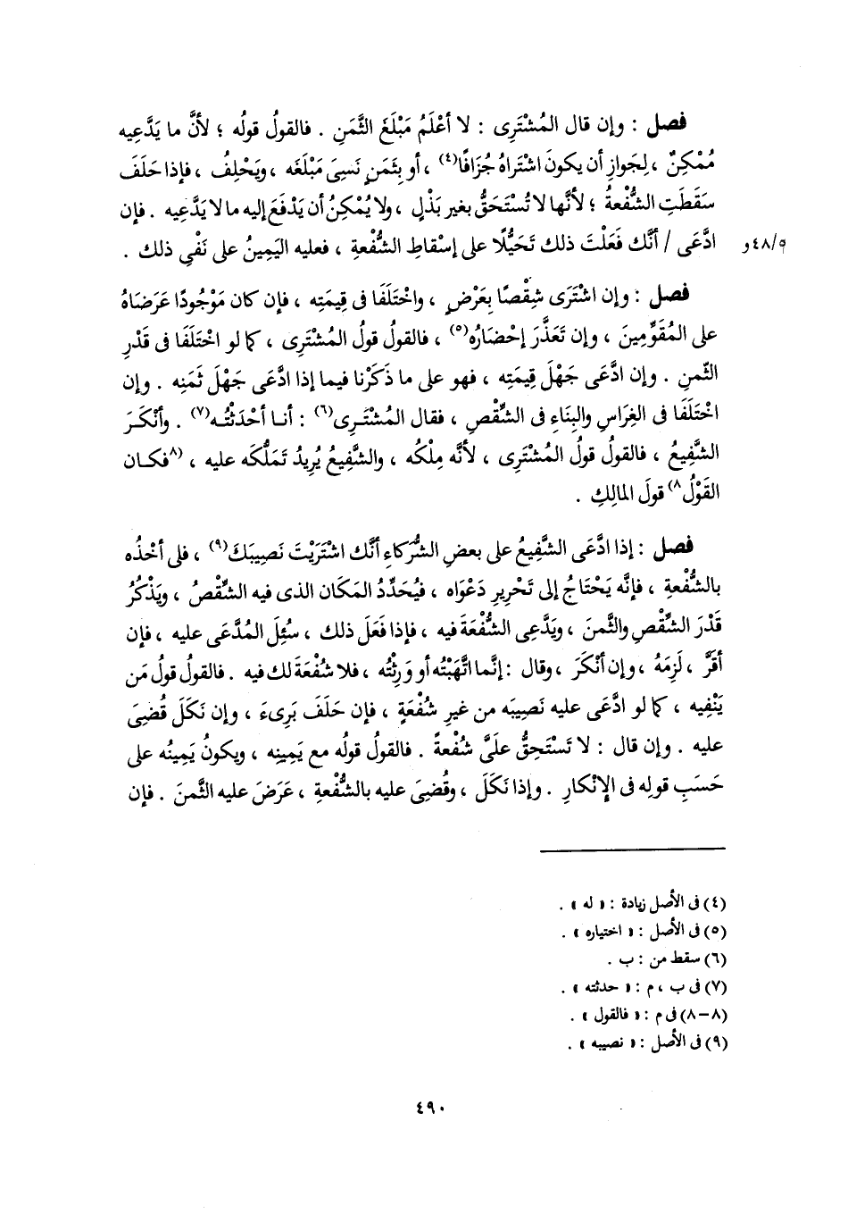 فصل: إذا ادَّعَى الشَّفِيعُ على بعضِ الشُّرَكاءِ أنَّك اشْتَرَيْتَ نَصِيبَكَ (٩)، فلى أخْذُه بالشُّفْعةِ، فإنَّه يَحْتَاجُ إلى تَحْرِيرِ دَعْوَاه، فيُحَدِّدُ المَكَان الذي فيه الشِّقْصُ، ويَذْكُرُ قَدْرَ الشِّقْصِ والثَّمنَ، ويَدَّعِى الشُّفْعَةَ فيه، فإذا فَعَلَ ذلك، سُئِلَ المُدَّعَى عليه، فإن أقَرَّ، لَزِمَهُ، وإن أَنْكَرَ، وقال: إنَّما اتَّهَبْتُه أو وَرِثْتُه، فلا شُفْعَةَ لك فيه. فالقولُ قولُ مَن يَنْفِيه، كما لو ادَّعَى عليه نَصيبَه من غيرِ شُفْعَةٍ، فإن حَلَفَ بَرِىءَ، وإن نَكَلَ قُضِىَ عليه. وإن قال: لا تَسْتَحِقُّ علَىَّ شُفْعةً. فالقولُ قولُه مع يَمِينِه، ويكونُ يَمِينُه على حَسَبِ قولِه في الإِنْكارِ. وإذا نَكَلَ، وقُضِىَ عليه بالشُّفْعةِ، عَرَضَ عليه الثَّمنَ. فإن