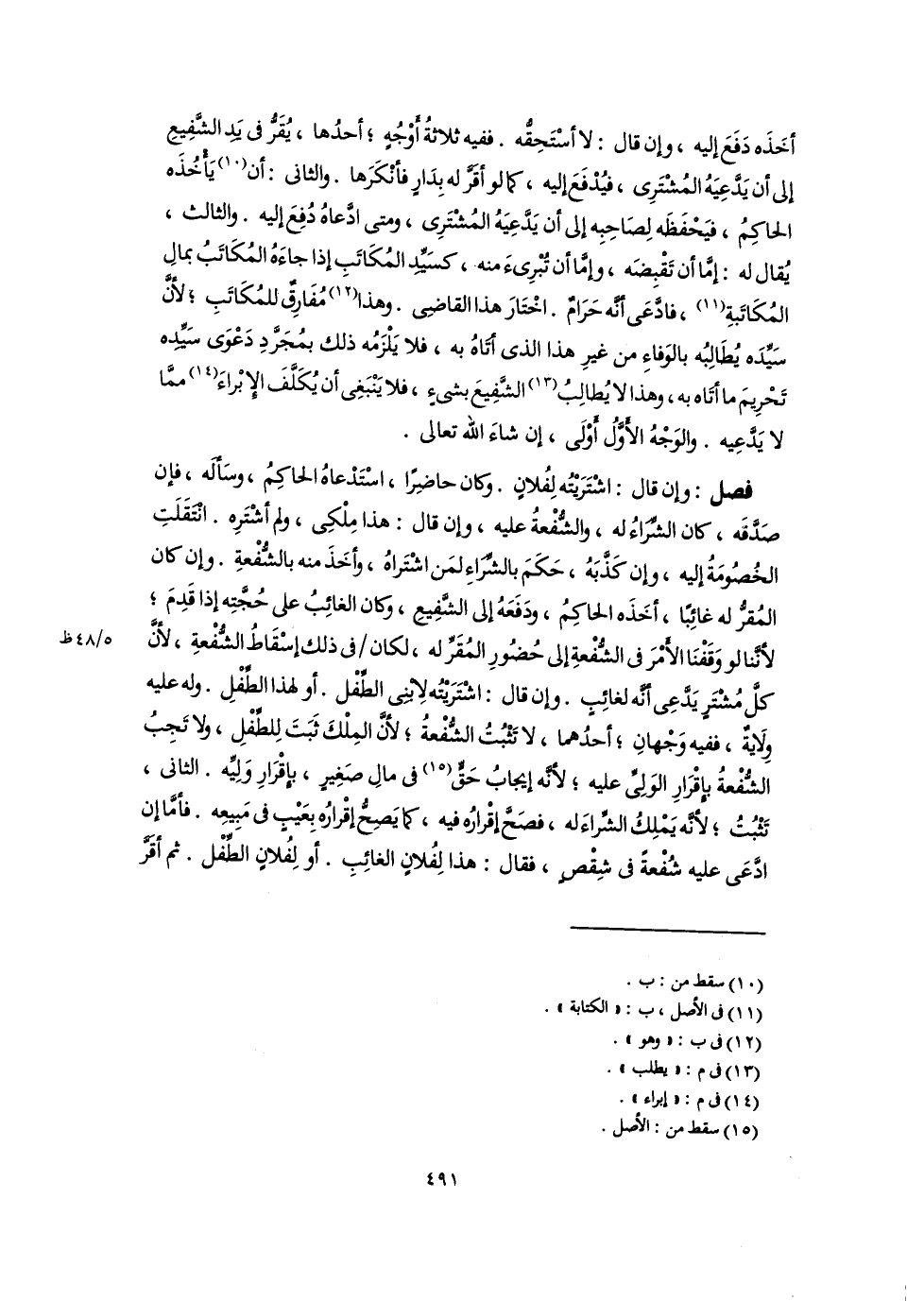 فصل: وإن قال: اشْتَرَيْتُه لِفُلانٍ. وكان حاضِرًا، اسْتَدْعاهُ الحاكِمُ، وسَأَلَه، فإن صَدَّقَه، كان الشِّرَاءُ له، والشُّفْعةُ عليه، وإن قال: هذا مِلْكِى، ولم أشْتَرِه. انْتَقَلَتِ الخُصُومَةُ إليه، وإن كَذَّبَهُ، حَكَمَ بالشِّرَاءِ لمَن اشْتَراهُ، وأَخَذَ منه بالشُّفعةِ. وإن كان المُقرُّ له غائِبًا، أخَذَه الحاكِمُ، ودَفَعَهُ إلى الشَّفِيعِ، وكان الغائِبُ على حُجَّتِه إذا قَدِمَ؛ لأنَّنا لو وَقَفْنَا الأَمْرَ في الشُّفْعةِ إلى حُضُورِ المُقَرِّ له، لكان في ذلك إسْقَاطُ الشُّفْعةِ، لأنَّ كلَّ مُشْتَرٍ يَدَّعِى أنَّه لغائِبٍ. وإن قال: اشْتَرَيْتُه لِابْنِى الطِّفْل. أو لهذا الطِّفْلِ. وله عليه وِلَايةٌ، ففيه وَجْهانِ؛ أحدُهما، لا تَثْبُتُ الشُّفْعةُ؛ لأنَّ المِلْكَ ثَبَتَ لِلطِّفْلِ، ولا تَجِبُ الشُّفعةُ بإِقْرَارِ الوَلِىِّ عليه؛ لأنَّه إيجابُ حَقٍّ (١٥) في مالِ صَغِيرٍ، بِإِقْرَارِ وَلِيِّه. الثاني، تَثْبُتُ؛ لأنَّه يَمْلِكُ الشِّراءَ له، فصَحَّ إقْرارُه فيه، كما يَصِحُّ إقْرارُه بِعَيْبٍ في مَبِيعِه. فأمَّا إن ادَّعَى عليه شُفْعةً في شِقْصٍ، فقال: هذا لِفُلانٍ الغائِبِ. أو لِفُلانٍ الطِّفْل. ثم أقَرَّ