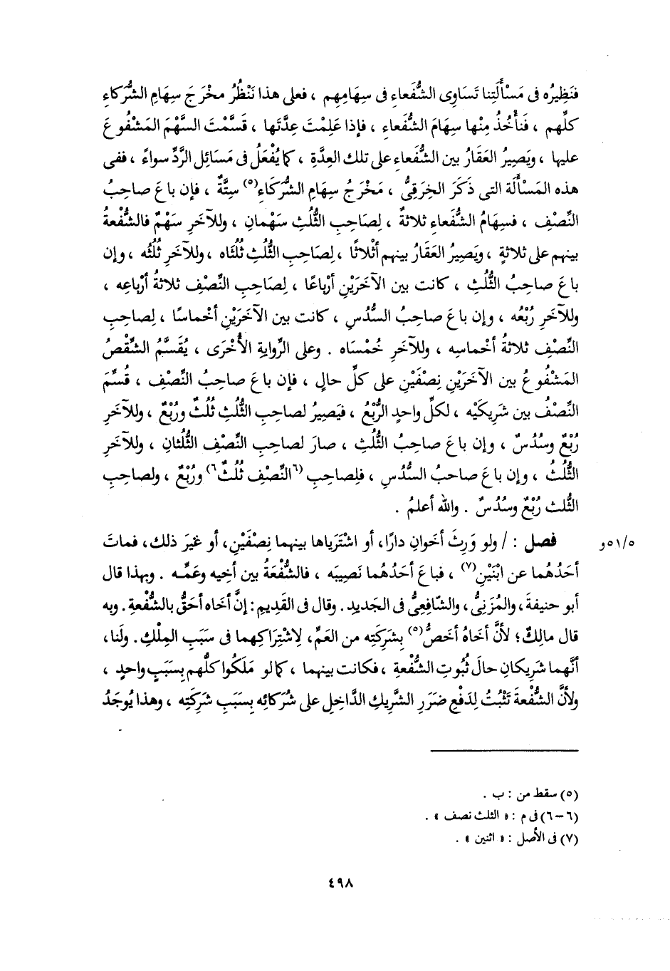 فصل: ولو وَرِثَ أخَوانِ دارًا، أو اشْتَرَياها بينهما نِصْفَيْنِ، أو غيرَ ذلك، فماتَ أحَدُهُما عن ابْنَيْنِ (٧)، فباعَ أحَدُهُما نَصِيبَه، فالشُّفْعَةُ بين أخِيه وعَمِّه. وبهذا قال أبو حنيفةَ، والمُزَنِىُّ، والشّافِعِىُّ في الجَديدِ. وقال في القَدِيمِ: إنَّ أخَاه أحَقُّ بالشُّفْعةِ. وبه قال مالِكٌ؛ لأنَّ أخَاهُ أخَصُّ (٥) بِشَرِكَتِه من العَمِّ، لِاشْتِرَاكِهما في سَبَبِ المِلْكِ. ولَنا، أنَّهما شَرِيكانِ حالَ ثُبُوتِ الشُّفْعةِ، فكانت بينهما، كما لو مَلَكُوا كلُّهم بِسَبَبٍ واحدٍ، ولأنَّ الشُّفْعةَ تَثْبُتُ لِدَفْعِ ضَرَرِ الشَّرِيكِ الدَّاخِلِ على شُرَكائِه بِسَبَبِ شَرِكَتِه، وهذا يُوجَدُ