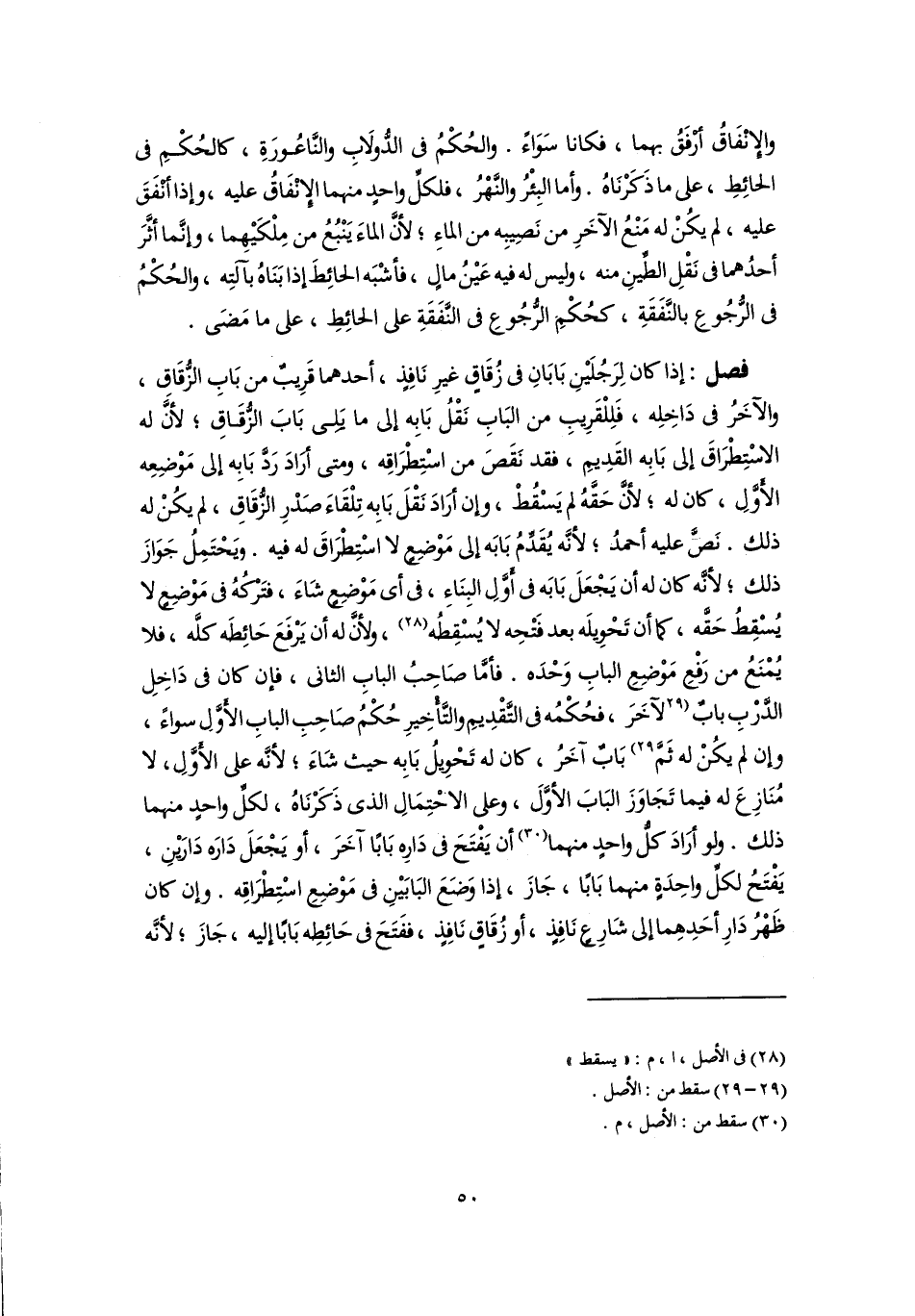 فصل: إذا كان لِرَجُلَيْنِ بَابَانِ في زُقَاقٍ غيرِ نَافِذٍ، أحدهما قَرِيبٌ من بَابِ الزُّقَاقِ، والآخَرُ في دَاخِلِه، فَلِلْقَرِيبِ من البَابِ نَقْلُ بَابِه إلى ما يَلِى بَابَ الزُّقَاقِ؛ لأنَّ له الاسْتِطراقَ إلى بَابِه القَدِيمِ، فقد نَقَصَ من اسْتِطْرَاقِه، ومتى أرَادَ رَدَّ بَابِه إلى مَوْضِعِه الأَوَّلِ، كان له؛ لأنَّ حَقَّهُ لم يَسْقُطْ، وإن أرَادَ نَقْلَ بَابِه تِلْقَاءَ صَدْرِ الزُّقَاقِ، لم يكُنْ له ذلك. نَصَّ عليه أحمدُ؛ لأنَّه يُقَدِّمُ بَابَه إلى مَوْضِعٍ لا اسْتِطْرَاقَ له فيه. ويَحْتَمِلُ جَوَازَ ذلك؛ لأنَّه كان له أن يَجْعَلَ بَابَه في أَوَّلِ البِنَاءِ، في أي مَوْضِعٍ شَاءَ، فتَرْكُهُ في مَوْضِعٍ لا يُسْقِطُ حَقَّه، كما أن تَحْوِيلَه بعد فَتْحِه لا يُسْقِطُه (٢٨)، ولأنَّ له أن يَرْفَعَ حَائِطَه كلَّه، فلا يُمْنَعُ من رَفْعِ مَوْضِعِ البابِ وَحْدَه. فأمَّا صَاحِبُ البابِ الثاني، فإن كان في دَاخِلِ الدَّرْبِ بابٌ [لآخَرَ، فحُكْمُه في التَّقْدِيمِ والتَّأْخِيرِ حُكْمُ صَاحِبِ البابِ الأَوَّلِ سواءً، وإن لم يكُنْ له ثَمَّ] (٢٩) بَابٌ آخَرُ، كان له تَحْوِيلُ بَابِه حيث شَاءَ؛ لأنَّه على الأَوَّلِ، لا مُنَازِعَ له فيما تَجَاوَزَ البَابَ الأوَّلَ، وعلى الاحْتِمَالِ الذي ذَكَرْنَاهُ، لكلِّ واحدٍ منهما ذلك. ولو أرَادَ كلُّ واحدٍ منهما (٣٠) أن يَفْتَحَ في دَارِه بَابًا آخَرَ، أو يَجْعَلَ دَارَه دَارَيْنِ، يَفْتَحُ لكلِّ واحِدَةٍ منهما بَابًا، جَازَ، إذا وَضَعَ البَابَيْنِ في مَوْضِعِ اسْتِطْرَاقِه. وإن كان ظَهْرُ دَارِ أحَدِهِما إلى شَارِعٍ نَافِذٍ، أو زُقَاقٍ نَافِذٍ، ففَتَحَ في حَائِطِه بَابًا إليه، جَازَ؛ لأنَّه