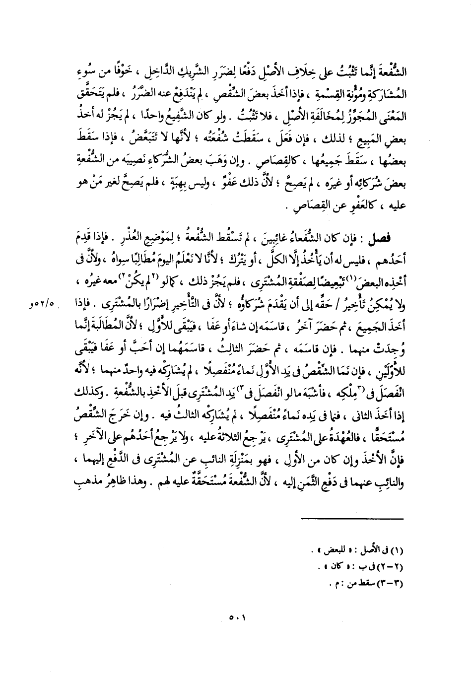 فصل: فإن كان الشُّفَعاءُ غائِبينَ، لم تَسْقُط الشُّفْعةُ؛ لِمَوْضِعِ العُذْرِ. فإذا قَدِمَ أحَدُهم، فليس له أن يَأْخُذُ إلَّا الكلَّ، أو يَتْرُكَ؛ لأنَّا لا نَعْلَمُ اليومَ مُطَالِبًا سِواهُ، ولأنَّ في أخْذِه البعضَ (١) تَبْعِيضًا لِصَفْقةِ المُشْتَرِى، فلم يَجُزْ ذلك، كما لو [لم يكُنْ] (٢) معه غيرُه، ولا يُمْكِنُ تَأْخِيرُ حَقِّه إلى أن يَقْدَمَ شُرَكاؤُه؛ لأنَّ في التَّأْخِيرِ إضْرَارًا بالمُشْتَرِى. فإذا أخَذَ الجَمِيعَ، ثم حَضَرَ آخَرُ، قاسَمَه إن شاءَ أو عَفَا، فيَبْقَى للأَوَّلِ؛ لأنَّ المُطَالَبةَ إنَّما وُجِدَتْ منهما. فإن قاسَمَه، ثم حَضَرَ الثالِثُ، قاسَمَهُما إن أحَبَّ أو عَفَا فيَبْقَى للأَوّلَيْنِ، فإن نَمَا الشِّقْصُ في يَدِ الأَوَّلِ نَماءً مُنْفَصِلًا، لم يُشَارِكْه فيه واحدٌ منهما؛ لأنَّه انْفَصَلَ في [مِلْكِه، فأشْبَهَ ما لو انْفَصَلَ في] (٣) يَدِ المُشْتَرِى قبلَ الأخْذِ بالشُّفْعةِ. وكذلك إذا أخَذَ الثاني، فنما في يَدِه نَماءً مُنْفَصِلًا، لم يُشَارِكْه الثالثُ فيه. وإن خَرَجَ الشِّقْصُ مُسْتَحَقًّا، فالعُهْدَةُ على المُشْتَرِى، يَرْجِعُ الثلاثةُ عليه، ولا يَرْجِعُ أحَدُهُم على الآخَرِ؛ فإنَّ الأخْذَ وإن كان من الأولِ، فهو بمَنْزِلَةِ النائبِ عن المُشْتَرِى في الدَّفْعِ إليهما، والنائِبِ عنهما في دَفْعِ الثَّمَنِ إليه، لأنَّ الشُّفْعةَ مُسْتَحَقَّةٌ عليه لهم. وهذا ظاهِرُ مذهبِ