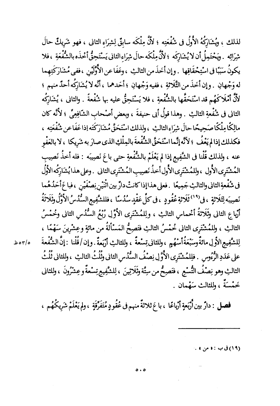 لذلك, ويُشَارِكُهُ الأَولُ في شُفْعَتِه؛ لأنَّ مِلْكَه سابِقٌ لِشِرَاءِ الثاني، فهو شَرِيكٌ حالَ شِرَائِه. ويَحْتَمِلُ أن لا يُشَارِكَه؛ لأنَّ مِلْكَه حالَ شِرَاءِ الثاني يَسْتَحِقُّ أخْذَه بالشُّفْعَةِ، فلا يكونُ سَبَبًا في اسْتِحْقَاقِها. وإن أخَذَ من الثالثِ، وعَفَا عن الأَوَّلَيْنِ، ففى مُشَارَكَتِهِما له وَجْهانِ. وإن أخَذَ من الثَّلَاثةِ، ففيه وَجْهانِ؛ أحَدهما، أنَّه لا يُشَارِكُه أحدٌ منهم؛ لأنَّ أمْلَاكَهُم قد اسْتَحَقَّها بالشُّفْعةِ، فلا يَسْتَحِقُّ عليه بها شُفْعةً. والثاني، يُشَارِكُه الثاني في شُفْعةِ الثالثِ. وهذا قولُ أبى حنيفةَ، وبعضِ أصْحابِ الشّافِعِىِّ؛ لأنَّه كان مالِكًا مِلْكًا صَحِيحًا حالَ شِرَاءِ الثالثِ، ولذلك اسْتَحَقَّ مُشَارَكَتَه إذا عَفَا عن شُفْعَتِه، فكذلك إذا لم يَعْفُ؛ لأنَّه إنَّما اسْتَحَقَّ الشُّفْعةَ بالمِلْكِ الذي صارَ به شَرِيكا، لا بالعَفْوِ عنه، ولذلك قُلْنا في الشَّفِيعِ إذا لم يَعْلَمْ بالشُّفْعةِ حتى باعَ نَصِيبَه: فله أخذُ نَصِيبِ المُشْتَرِى الأَول، وللمُشْتَرِى الأَول أخذُ نَصِيبِ المُشْتَرِى الثاني. وعلى هذا يُشَارِكُه الأولُ في شُفْعةِ الثاني والثالثِ جَمِيعًا. فعلى هذا إذا كانتْ دارٌ بين اثْنَيْنِ نِصْفَيْنِ، فباعَ أحَدُهُما نَصِيبَه لِثَلَاثةٍ، في (١٩) ثَلَاثةِ عُقُودٍ، في كلِّ عَقْدٍ سُدُسًا، فللشَّفِيعِ السُّدُسُ الأوَّلُ وثَلَاثَةُ أرْباعِ الثاني وثَلَاثةُ أخْماسِ الثالثِ، ولِلمُشْتَرِى الأوَّلِ رُبْعُ السُّدُسِ الثاني وخُمْسُ الثالثِ، وللمُشْتَرِى الثاني خُمْسُ الثالثِ فتَصِحُّ المَسْألةُ من مائةٍ وعِشْرِينَ سَهْمًا، لِلشَّفِيعِ الأولِ مائةٌ وسَبْعَةُ أسْهُمٍ، وللثاني تِسْعةٌ، وللثالثِ أرْبَعةٌ. وإن قُلْنا: إنَّ الشُّفْعةَ على عَدَدِ الرُّءُوسِ. فلِلمُشْتَرِى الأَوَّلِ نِصْفُ السُّدُسِ الثاني وثُلُثُ الثالثِ، وللثاني ثُلُثُ الثالثِ وهو نِصْفُ التُّسْعِ، فتَصِحُّ من سِتَّة وثَلَاثِينَ، لِلشَّفِيعِ تِسْعةٌ وعِشْرُونَ، وللثاني خَمْسَةٌ، وللثالث سَهْمان.