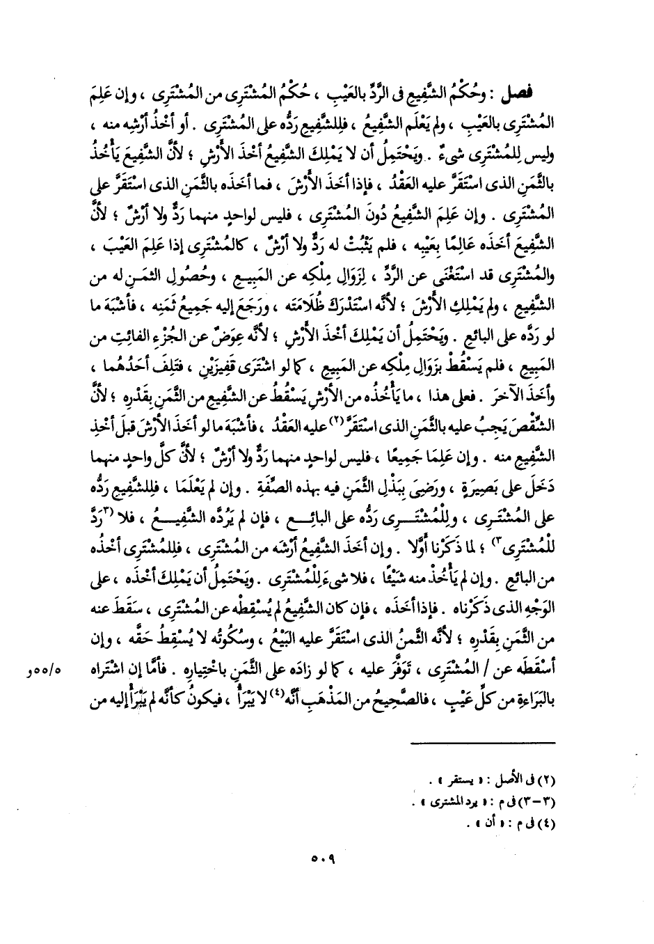 فصل: وحُكْمُ الشَّفِيعِ في الرَّدِّ بالعَيْبِ، حُكْمُ المُشْتَرِى من المُشْتَرِى، وإن عَلِمَ المُشْتَرِى بالعَيْبِ، ولم يَعْلَم الشَّفِيعُ، فلِلشَّفِيعِ رَدُّه على المُشْتَرِى. أو أخْذُ أرْشِه منه، وليس لِلمُشْتَرِى شيءٌ. ويَحْتَمِلُ أن لا يَمْلِكَ الشَّفِيعُ أخْذَ الأَرْشِ؛ لأنَّ الشَّفِيعَ يَأْخُذُ بالثَّمَنِ الذي اسْتَقَرَّ عليه العَقْدُ، فإذا أخَذَ الأَرْشَ، فما أخَذَه بالثَّمَنِ الذي اسْتَقَرَّ على المُشْتَرِى. وإن عَلِمَ الشَّفِيعُ دُونَ المُشْتَرِى، فليس لواحدٍ منهما رَدٌّ ولا أرْشٌ؛ لأنَّ الشَّفِيعَ أخَذَه عَالِمًا بِعَيْبِه، فلم يَثْبُتْ له رَدٌّ ولا أرْشٌ، كالمُشْتَرِى إذا عَلِمَ العَيْبَ، والمُشْتَرِى قد اسْتَغْنَى عن الرَّدِّ، لِزَوَالِ مِلْكِه عن المَبِيعِ، وحُصُولِ الثمَنِ له من الشَّفِيعِ، ولم يَمْلِكِ الأَرْشَ؛ لأنَّه اسْتَدْرَكَ ظُلَامَتَه، ورَجَعَ إليه جَمِيعُ ثَمَنِه، فأشْبَهَ ما لو رَدَّه على البائعِ. ويَحْتَمِلُ أن يَمْلِكَ أخْذَ الأَرْشِ؛ لأنَّه عِوَضٌ عن الجُزْءِ الفائِتِ من المَبِيعِ، فلم يَسْقُطْ بزَوَالِ مِلْكِه عن المَبِيعِ، كما لو اشْتَرَى قَفِيزَيْنِ، فتَلِفَ أحَدُهُما، وأخَذَ الآخرَ. فعلى هذا، ما يَأْخُذُه من الأرْشِ يَسْقُطُ عن الشَّفِيعِ من الثَّمَنِ بِقَدْرِه؛ لأنَّ الشِّقْصَ يَجِبُ عليه بالثَّمَنِ الذي اسْتَقَرَّ (٢) عليه العَقْدُ، فأشْبَهَ ما لو أخَذَ الأرْشَ قبلَ أخْذِ الشَّفِيعِ منه. وإن عَلِمَا جَمِيعًا، فليس لواحدٍ منهما رَدٌّ ولا أرْشٌ؛ لأنَّ كلَّ واحدٍ منهما دَخَلَ على بَصِيرَةٍ، ورَضِىَ بِبَذْلِ الثَّمَنِ فيه بهذه الصِّفَةِ. وإن لم يَعْلَمَا، فلِلشَّفِيعِ رَدُّه على المُشْتَرِى، ولِلْمُشْتَرِى رَدُّه على البائِع، فإن لم يَرُدَّه الشَّفِيعُ، فلا [رَدَّ للْمُشْتَرِى] (٣)؛ لما ذَكَرْنا أَوَّلا. وإن أخَذَ الشَّفِيعُ أرْشَه من المُشْتَرِى، فلِلمُشْتَرِى أخْذُه من البائعِ. وإن لم يَأْخُذْ منه شَيْئًا، فلا شىءَ لِلْمُشْتَرِى. ويَحْتَمِلُ أن يَمْلِكَ أخْذَه، على الوَجْهِ الذي ذَكَرْناه. فإذا أخَذَه، فإن كان الشَّفِيعُ لم يُسْقِطْه عن المُشْتَرِى، سَقَطَ عنه من الثَّمَنِ بِقَدْرِه؛ لأنَّه الثَّمنُ الذي اسْتَقَرَّ عليه البَيْعُ، وسُكُوتُه لا يُسْقِطُ حَقَّه، وإن أسْقَطَه عن المُشْتَرِى، تَوَفَّرَ عليه، كما لو زادَه على الثَّمَنِ باخْتِيارِه. فأمَّا إن اشْتَراه بالبَرَاءِة من كلِّ عَيْبٍ، فالصَّحِيحُ من المَذْهَبِ أنَّه (٤) لا يَبْرأُ، فيكونُ كأنَّه لم يَبْرَأْ إليه من