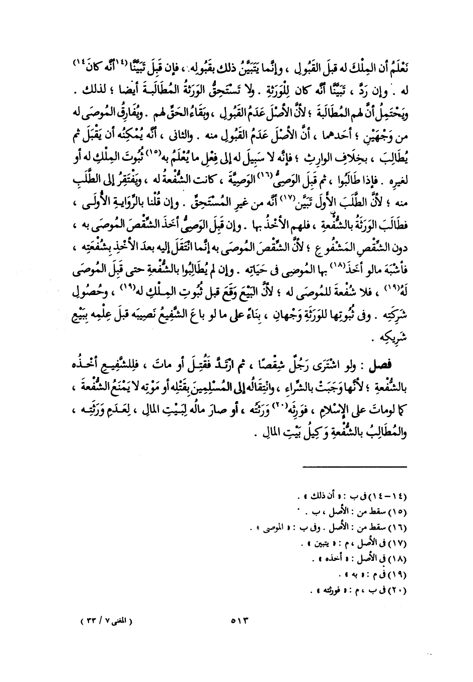 نَعْلَمُ أن المِلْكَ له قبلَ القَبُولِ، وإنَّما يَتَبَيَّنُ ذلك بقَبُولِه، فإن قَبِلَ تَبَيَّنَّا [أنَّه كانَ] (١٤) له. وإن رَدَّ، تَبَيَّنَّا أنَّه كان لِلْوَرَثةِ. ولا تَسْتَحِقُّ الوَرَثةُ المُطَالَبةَ أيضًا؛ لذلك. ويَحْتَمِلُ أنَّ لهم المُطَالَبةَ؛ لأنَّ الأصْلَ عَدَمُ القَبُولِ، وبَقَاءُ الحَقِّ لهم. ويُفَارِقُ المُوصَى له من وَجْهَيْنِ؛ أحَدهما، أنَّ الأصْلَ عَدَمُ القَبُولِ منه. والثانى، أنَّه يُمْكِنُه أن يَقْبَلَ ثم يُطَالِبَ، بخِلَافِ الوارِثِ؛ فإنَّه لا سَبِيلَ له إلى فِعْلِ ما يُعْلَمُ به (١٥) ثُبُوتَ المِلْكِ له أو لغيرِه. فإذا طَالَبُوا، ثم قَبِلَ الوَصِىُّ (١٦) الوَصِيَّةَ، كانت الشُّفْعةُ له، ويَفْتَقِرُ إلى الطَّلَبِ منه؛ لأنَّ الطَّلَبَ الأَولَ تَبَيَّن (١٧) أنَّه من غيرِ المُسْتَحِقِّ. وإن قُلْنا بالرِّوَايةِ الأُولَى، فطَالَبَ الوَرَثَةُ بالشُّفْعةِ، فلهم الأخْذُ بها. وإن قَبِلَ الوَصِىُّ أخَذَ الشِّقْصَ المُوصَى به، دون الشِّقْصِ المَشْفُوعِ؛ لأنَّ الشِّقْصَ المُوصَى به إنَّما انْتَقَلَ إليه بعدَ الأخْذِ بِشُفْعَتِه، فأشْبَهَ ما لو أخَذَ (١٨) بها المُوصِى في حَيَاتِه. وإن لم يُطَالِبُوا بالشُّفْعةِ حتى قَبِلَ المُوصَى لَهُ (١٩)، فلا شُفْعةَ للمُوصَى له؛ لأنَّ البَيْعَ وَقَعَ قبل ثُبُوتِ المِلْكِ له (١٩)، وحُصُولِ شَركَتِه. وفي ثُبُوتِها للوَرَثَةِ وَجْهانِ، بِنَاءً على ما لو باعَ الشَّفِيعُ نَصِيبَه قبلَ عِلْمِه بِبَيْعِ شَرِيكِه.