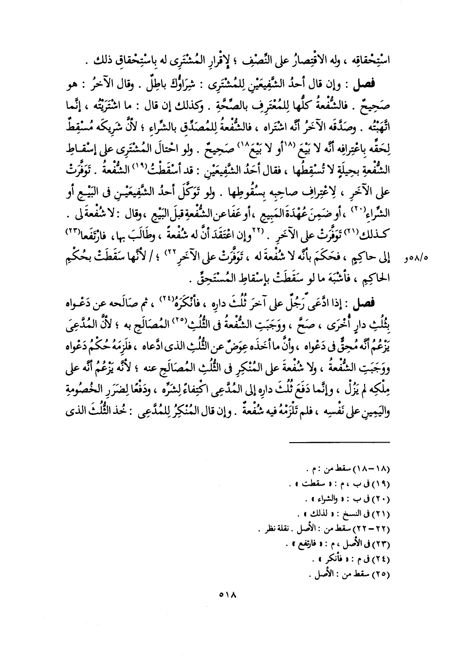فصل: وإن قال أحدُ الشَّفِيعَيْنِ لِلمُشْتَرِى: شِرَاؤُكَ باطِلٌ. وقال الآخرُ: هو صَحِيحٌ. فالشُّفْعةُ كلُّها لِلمُعْتَرِفِ بالصِّحَّةِ. وكذلك إن قال: ما اشْتَرَيْتُه، إنَّما اتَّهَبْتُه. وصَدَّقَه الآخَرُ أنَّه اشْتَراه، فالشُّفْعةُ لِلمُصَدِّقِ بالشِّراءِ؛ لأنَّ شَرِيكَه مُسْقِطٌ لِحَقِّه بِاعْتِرافِه أنَّه لا بَيْعَ [أو لا بَيْعَ] (١٨) صَحِيحٌ. ولو احْتالَ المُشْتَرِى على إسْقاطِ الشُّفْعةِ بحِيلَةٍ لا تُسْقِطُها، فقال أحَدُ الشَّفِيعَيْنِ: قد أسْقَطْتُ (١٩) الشُّفْعةُ. تَوَفَّرَتْ على الآخَرِ، لِاعْتِرافِ صاحِبِه بِسُقُوطِها. ولو تَوَكَّلَ أحدُ الشَّفِيعَيْنِ في البَيْعِ أو الشِّراءِ (٢٠)، أو ضَمِنَ عُهْدَةَ المَبِيعِ، أو عَفَا عن الشُّفْعةِ قبلَ البَيْعِ، وقال: لا شُفْعةَ لي. كذلك (٢١) تَوَفَّرَتْ على الآخَرِ. [وإن اعْتَقَدَ أنَّ له شُفْعةً، وطَالَبَ بها، فارْتَفَعا (٢٢) إلى حاكِمٍ، فحَكَمَ بأنَّه لا شُفْعةَ له، تَوَفَّرَتْ على الآخَرِ] (٢٣)؛ لأنَّها سَقَطَتْ بحُكْمِ الحاكِمِ، فأشْبَهَ ما لو سَقَطَتْ بإسْقاطِ المُسْتَحِقِّ.