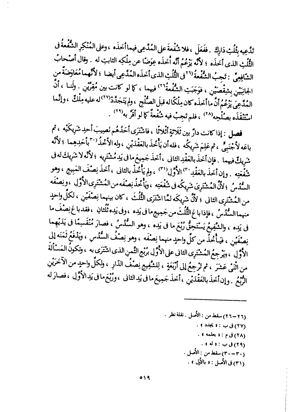 فصل: إذا كانت دارٌ بين ثَلَاثةٍ أثْلاثًا، فاشْتَرَى أحَدُهُم نَصِيبَ أحدِ شَرِيكَيْه، ثم باعَه لأجْنَبِىٍّ، ثم عَلِمَ شَرِيكُه، فله أن يَأْخُذَ بالعَقْدَيْنِ، وله الأخْذُ [بأحَدِهِما؛ لأنَّه شَرِيكٌ فيهما. فإن أخَذَ بالعَقْدِ الثاني، أخَذَ جَمِيعَ ما في يَدِ مُشْتَرِيه؛ لأنَّه لا شَرِيكَ له في شُفْعَتِه. وإن أخَذَ بالعَقْدِ] (٣٠) الأَوَّلِ (٣١)، ولم يَأْخُذْ بالثانى، أخَذَ نِصْفَ المَبِيعِ، وهو السُّدُسُ؛ لأنَّ المُشْتَرِىَ شَرِيكُه في شُفْعَتِه، ويَأْخُذُ نِصْفَه من المُشْتَرِى الأَوَّلِ، ونِصْفَه من المُشْتَرِى الثاني؛ لأنَّ شَرِيكَه لمَّا اشْتَرَى الثُّلُثَ، كان بينهما نِصْفَيْنِ، لكلِّ واحدٍ منهما السُّدُسُ، فإذا باعَ الثُّلُثَ من جَمِيعِ ما في يَدِه، وفي يَدِه ثُلُثانِ، فقد باعَ نِصْفَ ما في يَدِه، والشَّفِيعُ يَسْتَحِقُّ رُبْعَ ما في يَدِه، وهو السُّدُسُ، فصارَ مُنْقَسِمًا في يَدَيْهِما نِصْفَيْنِ، فيَأْخُذُ من كلِّ واحدٍ منهما نِصْفَه، وهو نِصْفُ السُّدُسِ، ويَدْفَعُ ثَمَنَه إلى الأَوَّلِ، ويَرْجِعُ المُشْتَرِى الثاني على الأَوَّلِ برُبْعِ الثَّمنِ الذي اشْتَرَى به، وتكونُ المَسْألة من اثْنَىْ عَشَرَ، ثم تَرْجِعُ إلى أرْبَعَةٍ، لِلشَّفِيعِ نِصْفُ الدّارِ، ولكلِّ واحدٍ من الآخَرَيْنِ الرُّبْعُ. وإن أخَذَ بالعَقْدَيْنِ، أخَذَ جَمِيعَ ما في يَدِ الثاني، ورُبْعَ ما في يَدِ الأوَّلِ، فصارَ له